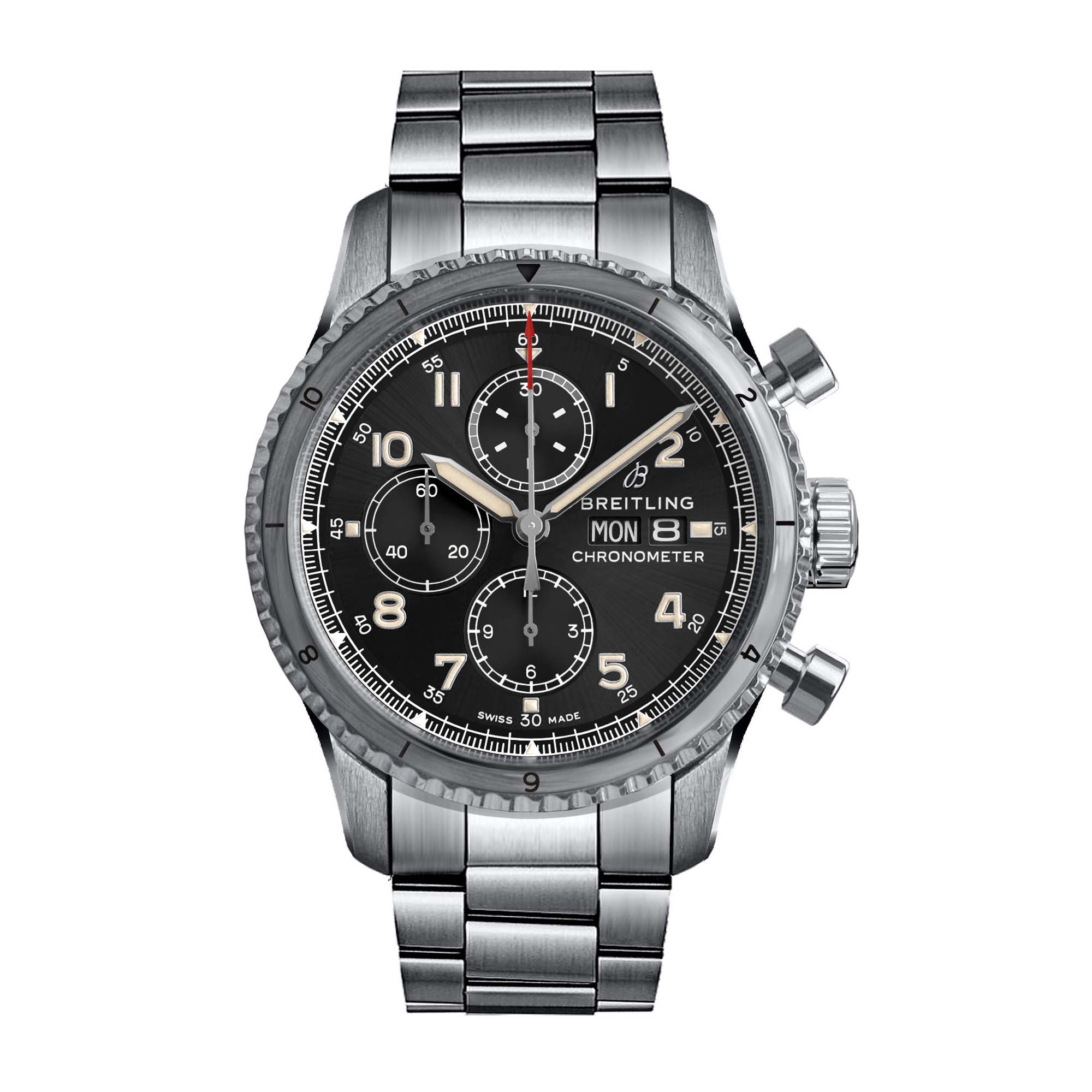 The Aviator 8 Chronograph 43 offers 30-minute and 12-hour counters at 12 and 6 oclock, respectively, along with a small seconds hand at 9 oclock. It is accurate to a quarter of a second. The COSC-certified Breitling Caliber 13 chronometer caliber is at the heart of this watch. It is wound automatically with the use of a unilateral ball-bearing rotor, delivering an autonomous running time of more than 42 hours. With a solid screwed caseback, the 43 mm case of the Aviator 8 Chronograph 43 is available in steel with a leather strap or steel bracelet, or in DLC-coated steel paired with a leather strap.