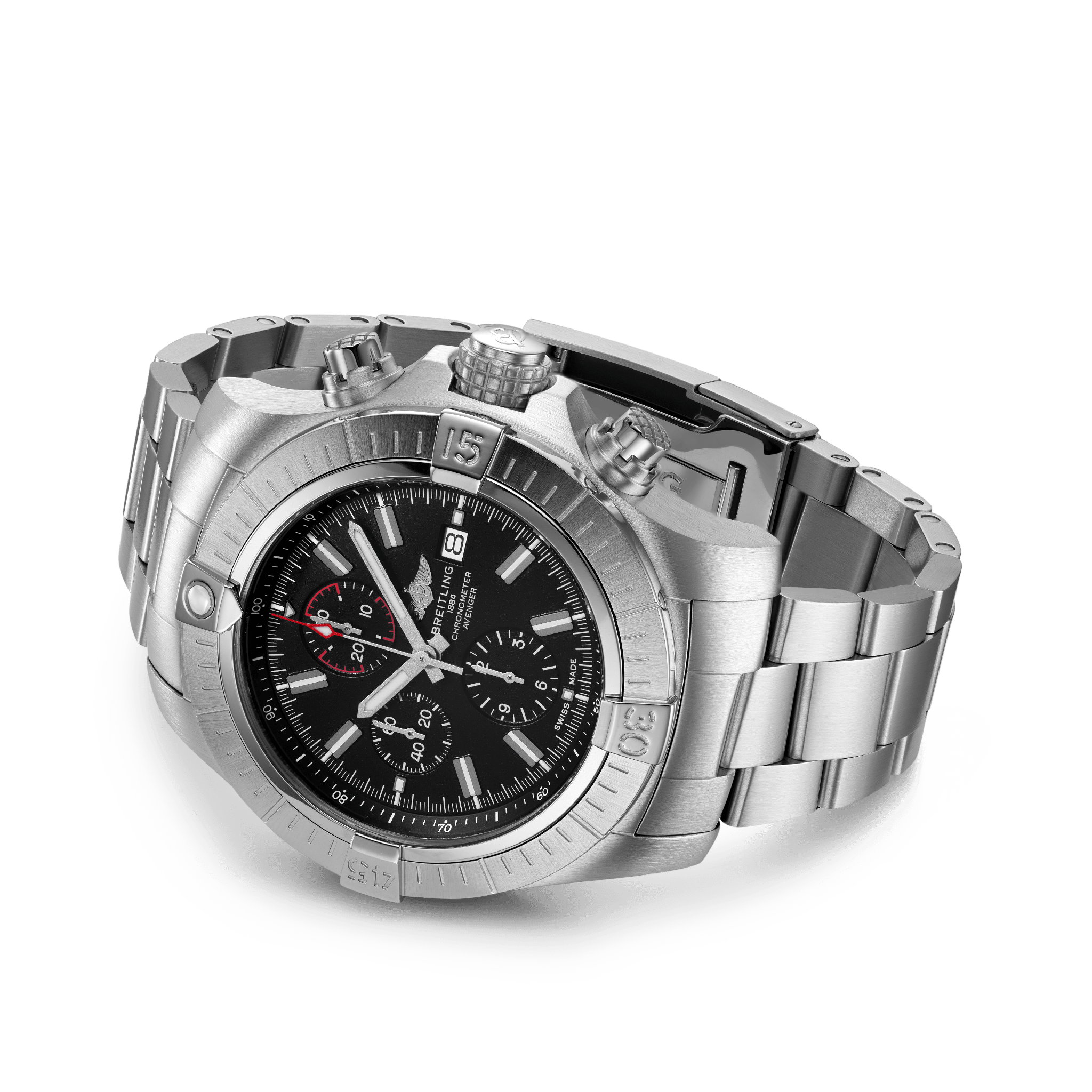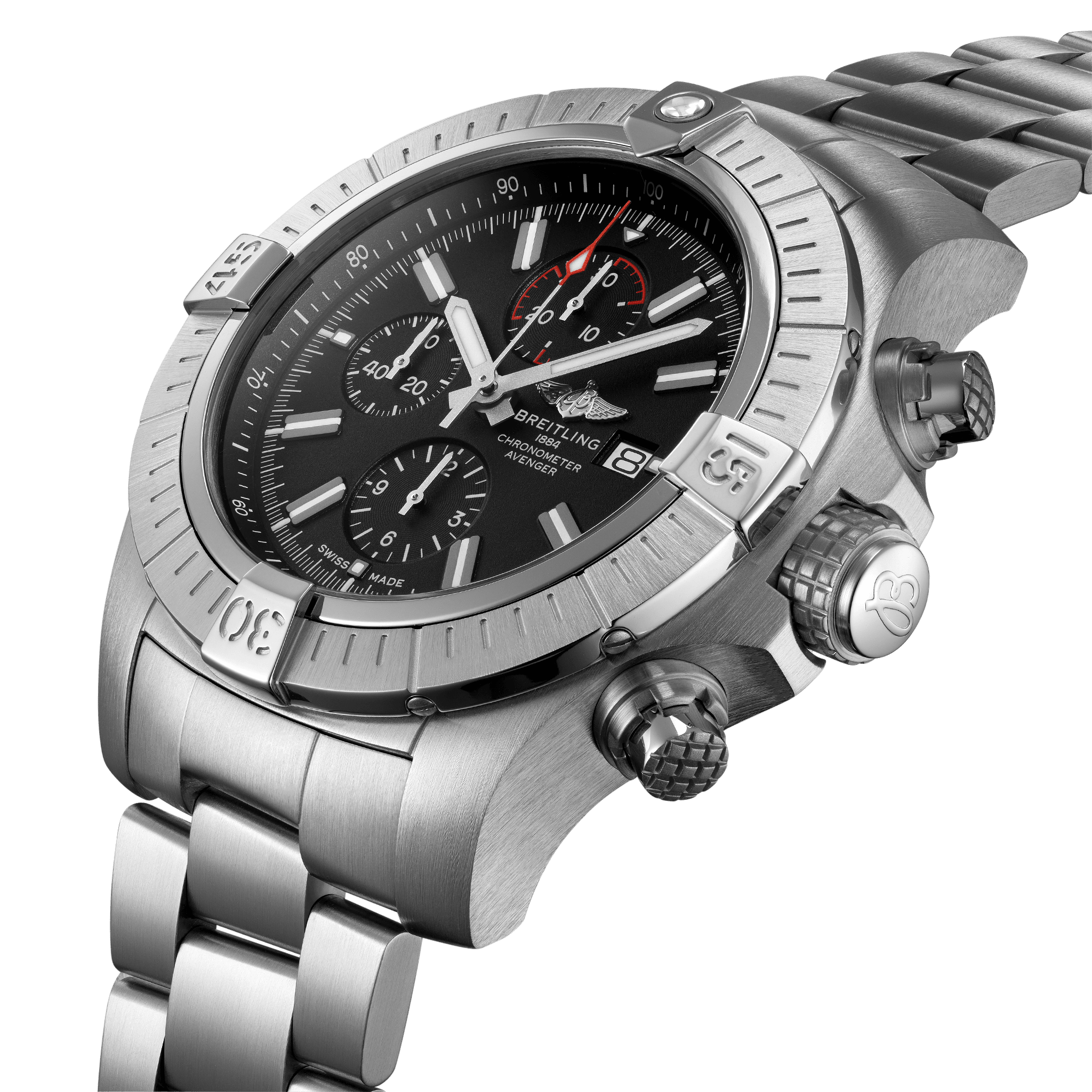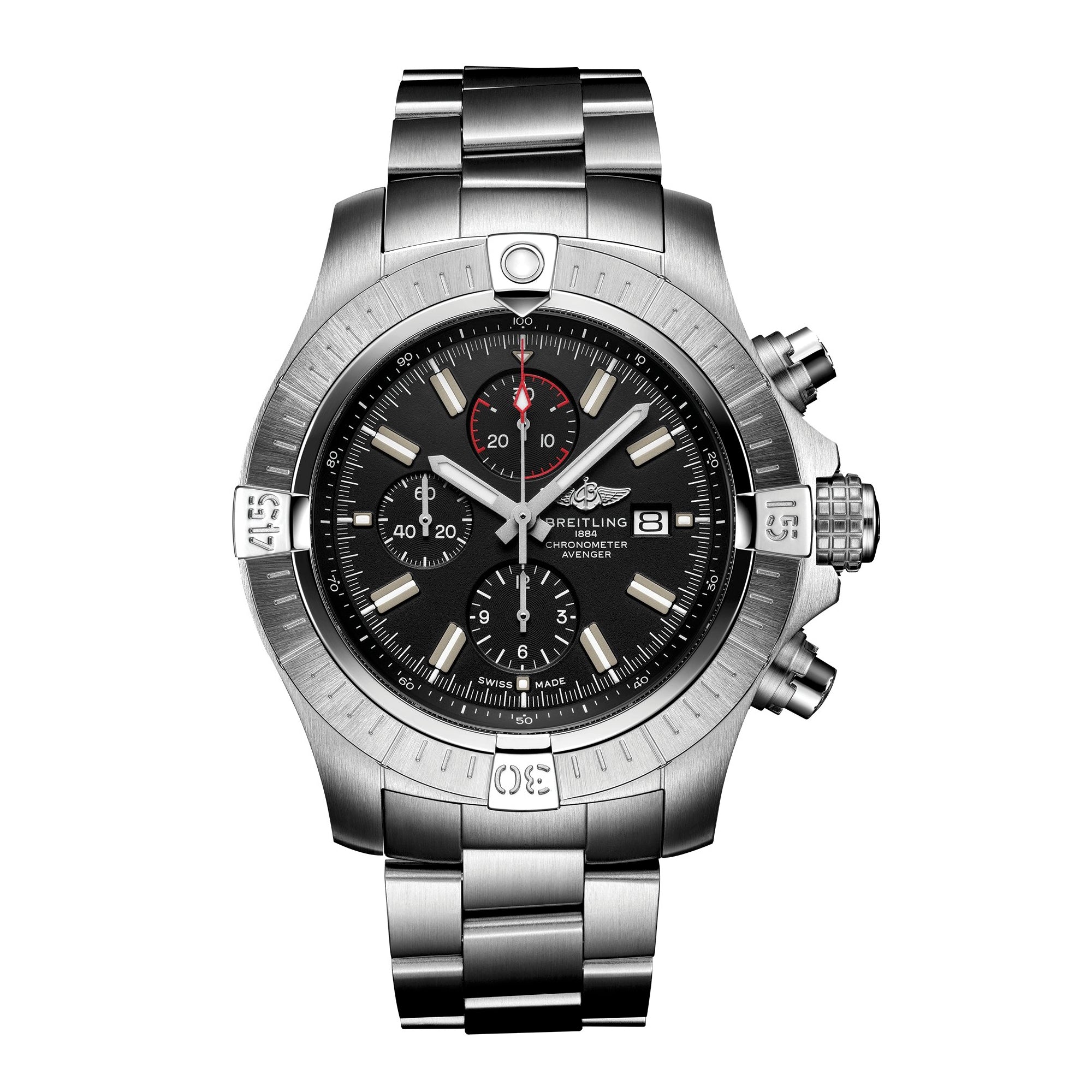Bold, extremely robust and shock resistant, the Super Avenger Chronograph 48 makes a big “here I am†statement. As a true Breitling Avenger, it can be used wearing gloves and offers unrivaled safety and reliability to any airborne adventurer. The Super Avenger Chronograph 48 features a sturdy oversized 48mm stainless-steel case, black dial and a choice of a stainless-steel bracelet, or black military leather strap that fits either a stainless-steel pin buckle or folding clasp. Thanks to its rugged bezel and its special grip-pattern on the crown & chronograph pushers, the Super Avenger Chronograph 48 can be easily operated wearing gloves.