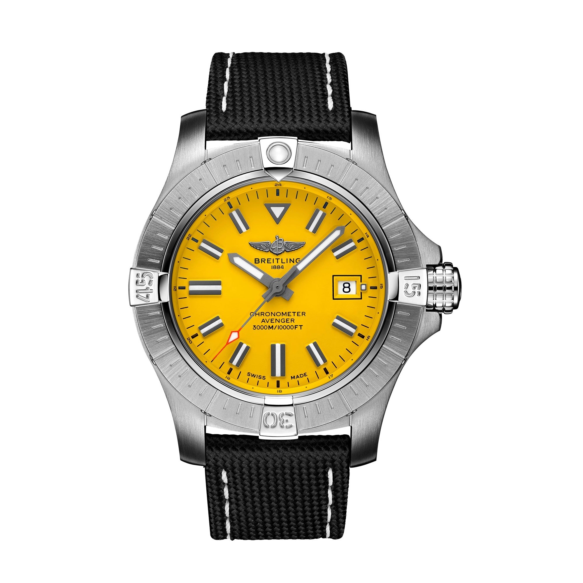 Bold, extremely robust and shock resistant, the Avenger Automatic 45 Seawolf is a pilots’ watch prepared for adventures well below the ocean’s surface (up to 300 bars – 3.000m). As a true Breitling Avenger, it can be used wearing gloves and offers unrivalled safety and reliability to any airborne adventurer. The Avenger Automatic 45 Seawolf features a sturdy 45mm stainless-steel case, striking yellow dial and a choice of a stainless-steel bracelet, or black military leather strap that fits either a stainless-steel pin buckle or folding clasp. With an impressive water resistance, the Seawolf is at ease up in the air and deep down the oceans. Thanks to its rugged bezel and its special grip-pattern on the crown, the Avenger Automatic 45 Seawolf can be easily operated wearing gloves.ÂÂ