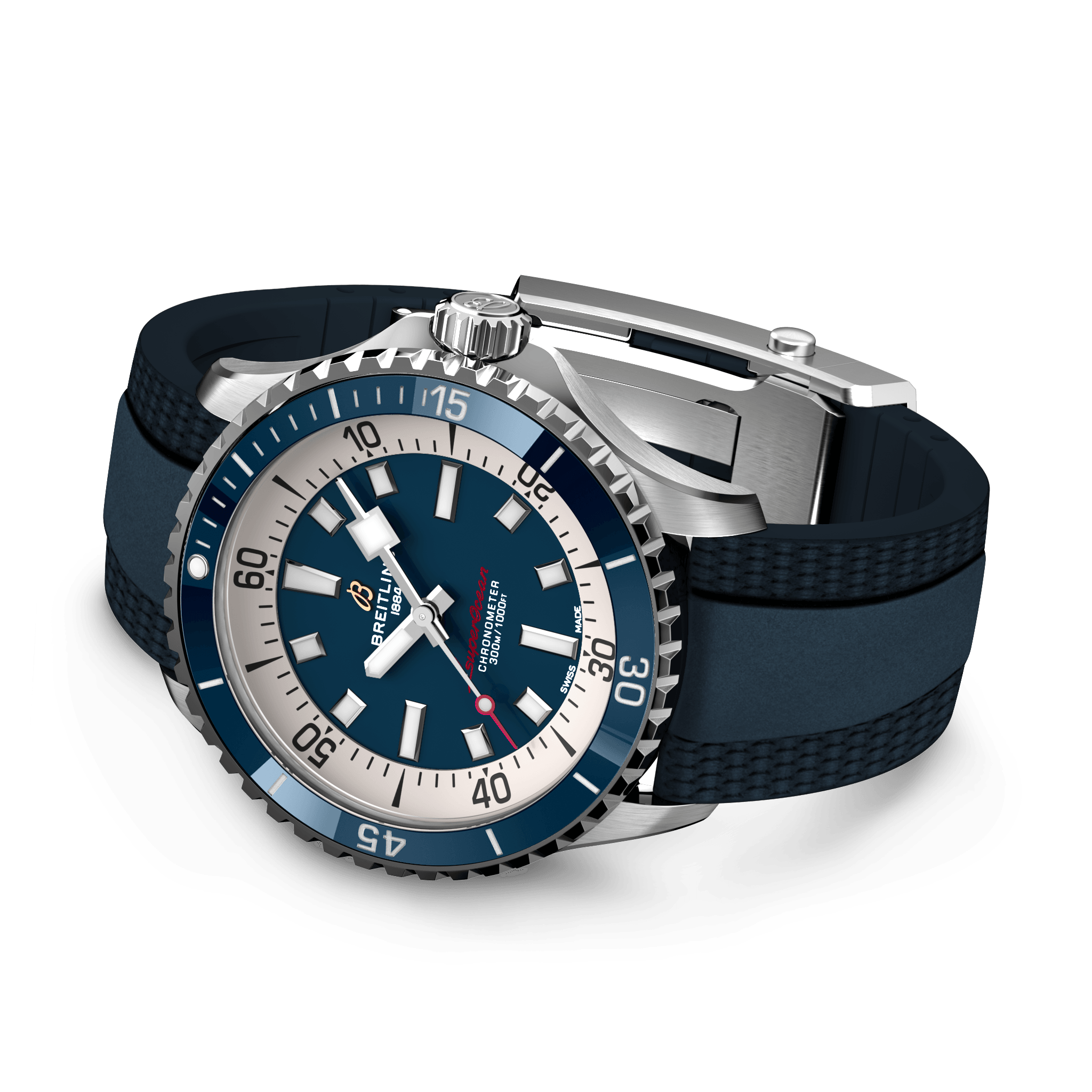 The new Superocean retraces the Slow Motion’s celebrated design codes, while adding modern features, like a ceramic-inlayed bezel and brightly colored dials. Broad hands and indexes in luminescent Super-LumiNova allow for easy readability underwater. The watch is water resistant to 300 m (1000 ft), as well as being shock-, sand- and saltwater-resistant. The bronze version uses a special alloy that has excellent resistance to corrosion, yet will still develop a subtle patina over time that makes the watch even more unique.