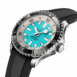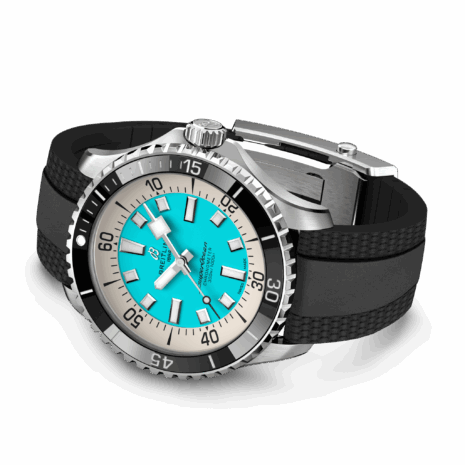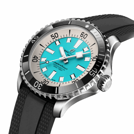 The new Superocean retraces the Slow Motion’s celebrated design codes, while adding modern features, like a ceramic-inlayed bezel and brightly colored dials. Broad hands and indexes in luminescent Super-LumiNova allow for easy readability underwater. The watch is water resistant to 300 m (1000 ft), as well as being shock-, sand- and saltwater-resistant. The bronze version uses a special alloy that has excellent resistance to corrosion, yet will still develop a subtle patina over time that makes the watch even more unique.
