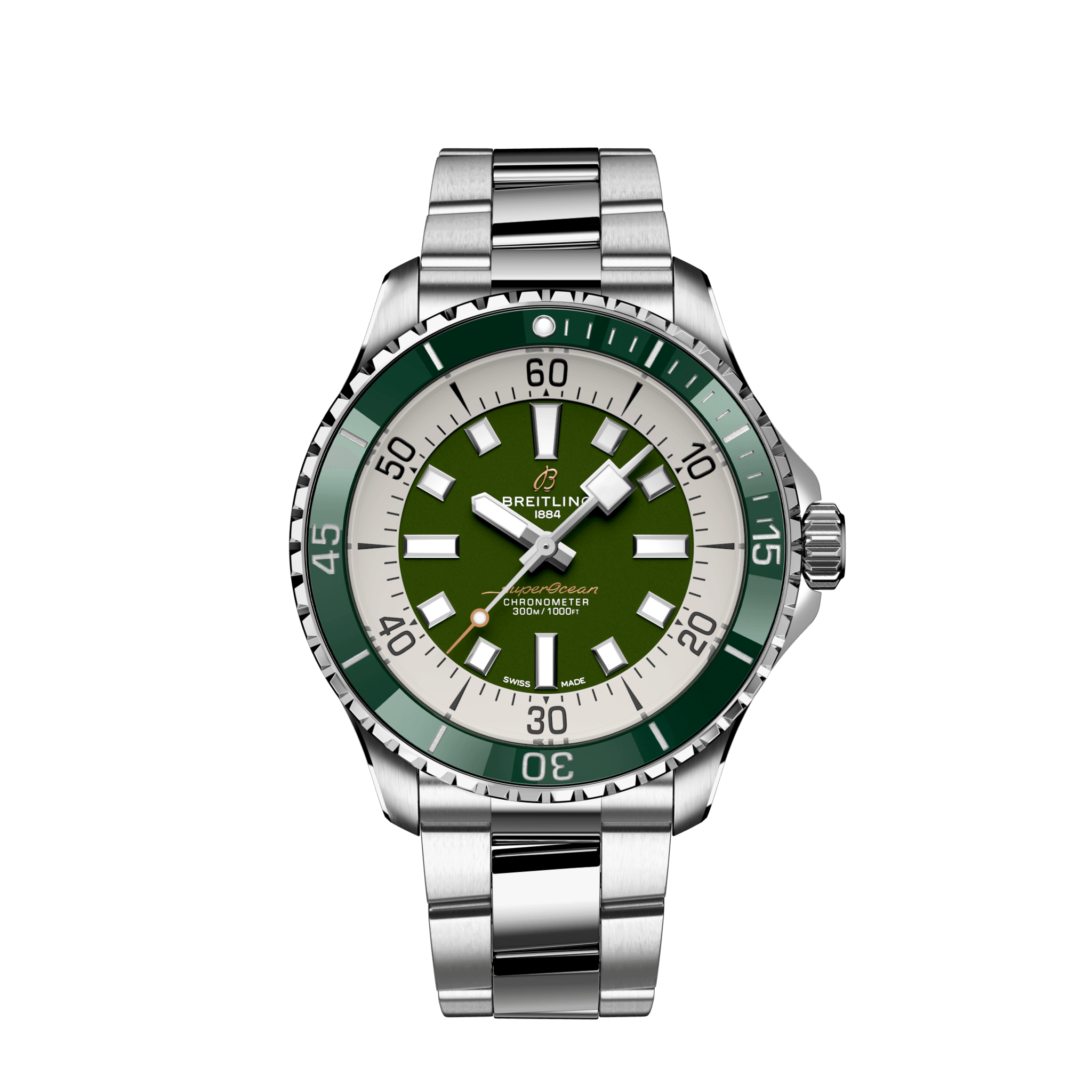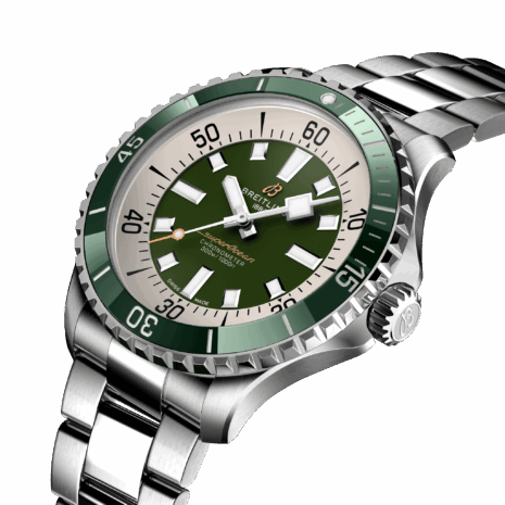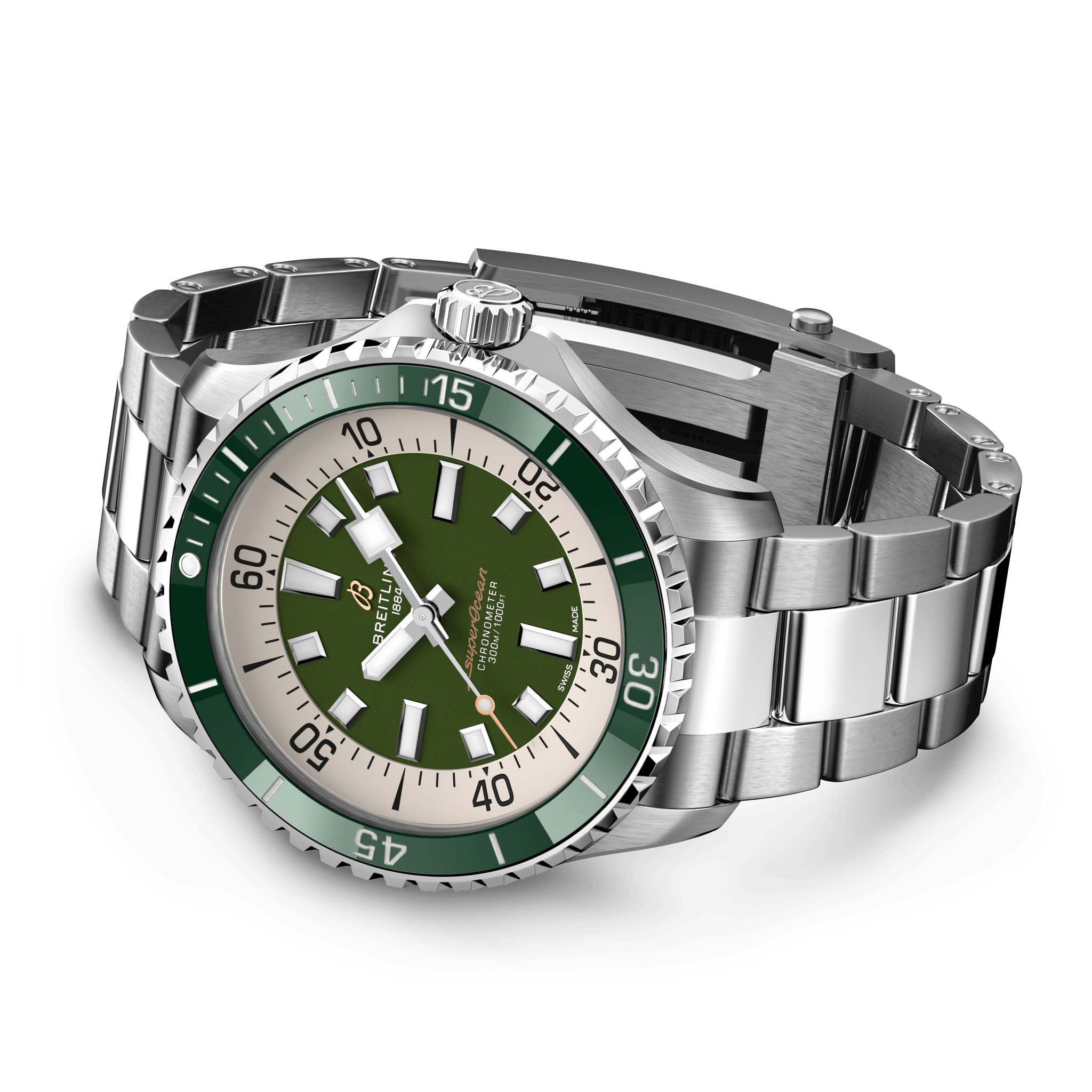The new Superocean retraces the Slow Motion’s celebrated design codes, while adding modern features, like a ceramic-inlayed bezel and brightly colored dials. Broad hands and indexes in luminescent Super-LumiNova allow for easy readability underwater. The watch is water resistant to 300 m (1000 ft), as well as being shock-, sand- and saltwater-resistant. The bronze version uses a special alloy that has excellent resistance to corrosion, yet will still develop a subtle patina over time that makes the watch even more unique.