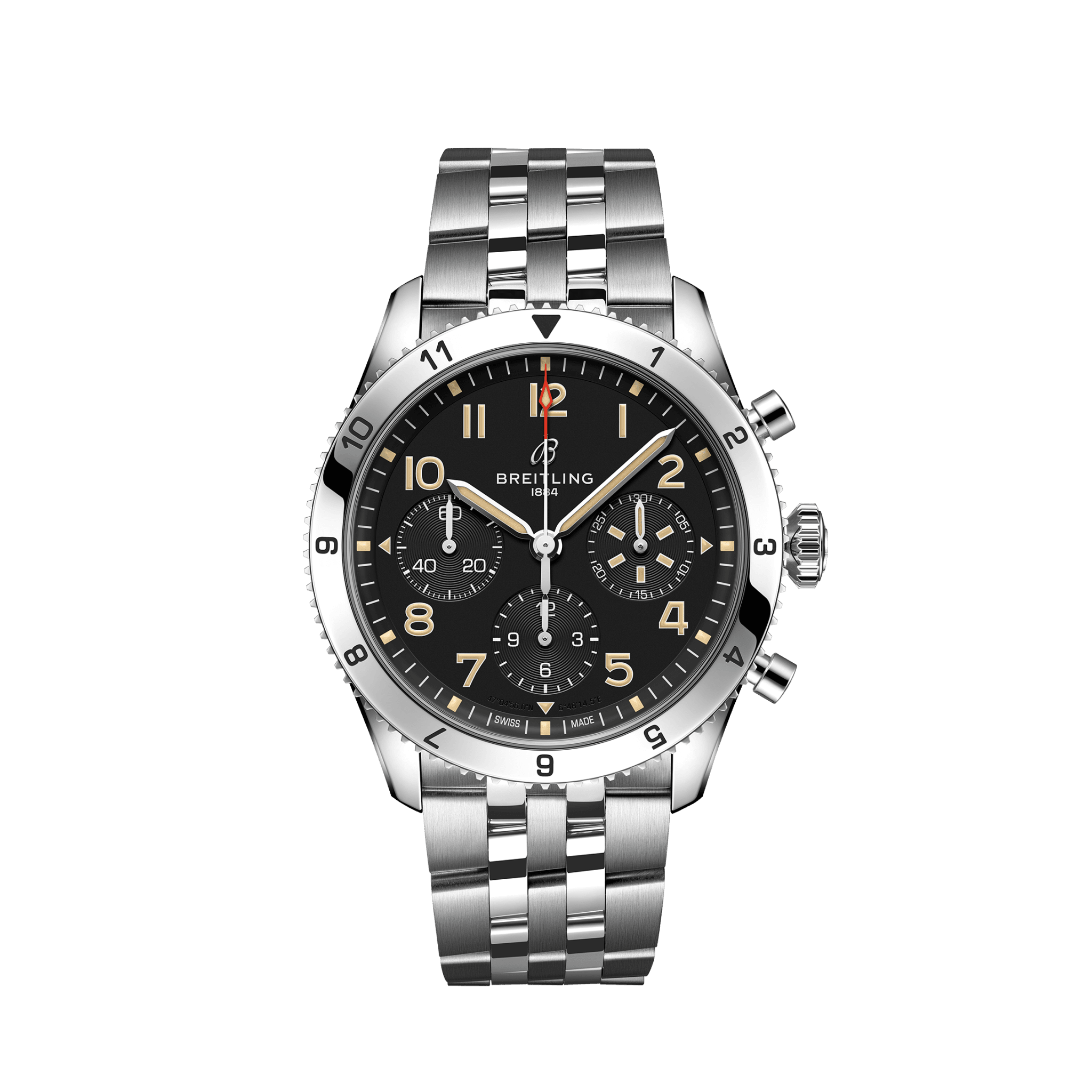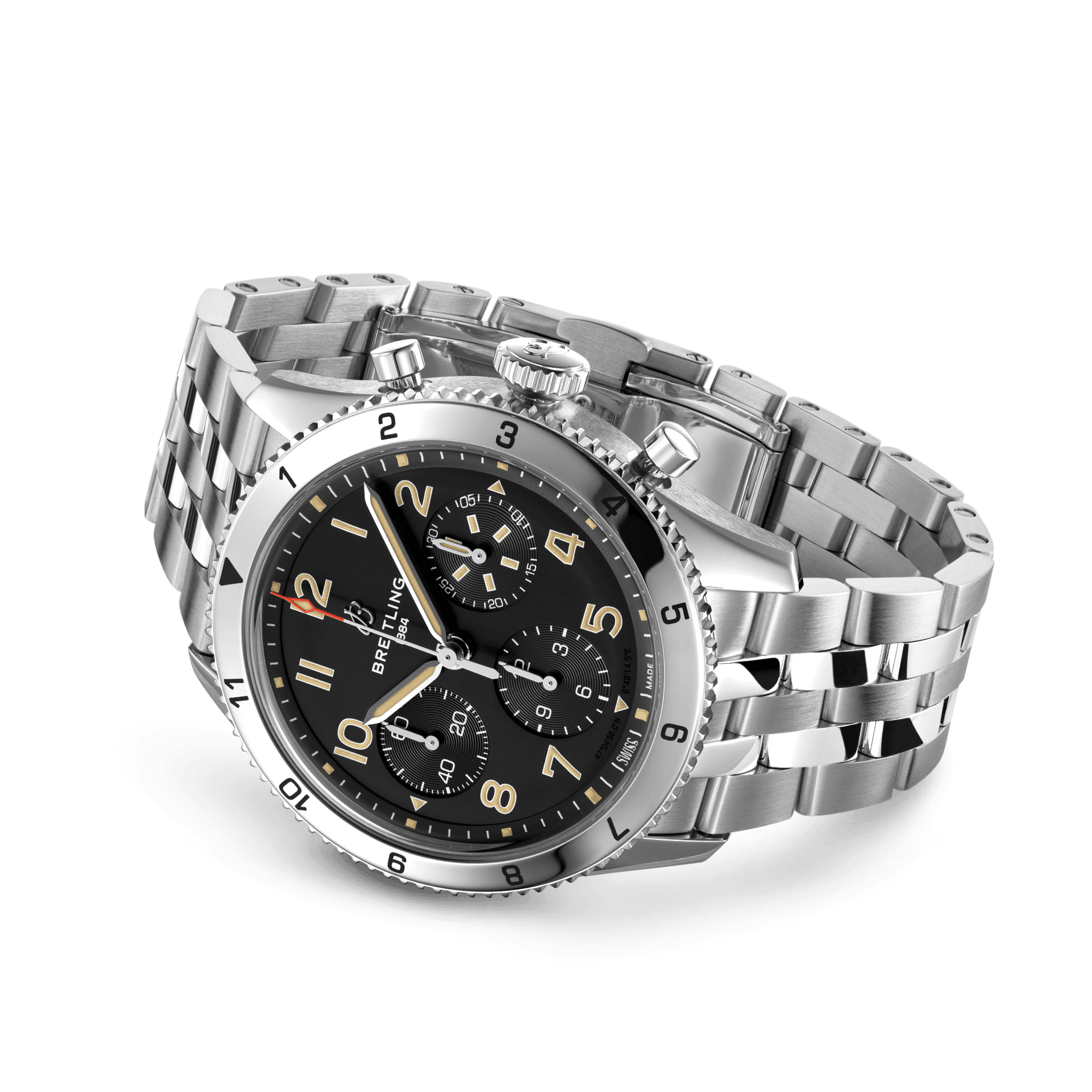 As a true pilot’s watch designed to withstand the rigors of a vintage cockpit, the Classic AVI P-51 Mustang features large, highly legible Arabic numerals on the dial and bezel. The knurled bezel on the 42mm case provides optimal grip, even in a pilot’s gloved hands. Top-stitched calfskin straps give a nod to the seams found on classic flight gear, while the stainless-steel bracelet provides an elegant alternative. Pilots and other travelers will appreciate its legibility, wearability, and understated style. The engine of the Classic AVI is the COSC-certified Breitling Caliber 23 movement, which provides approximately 48-hours of power reserve.
