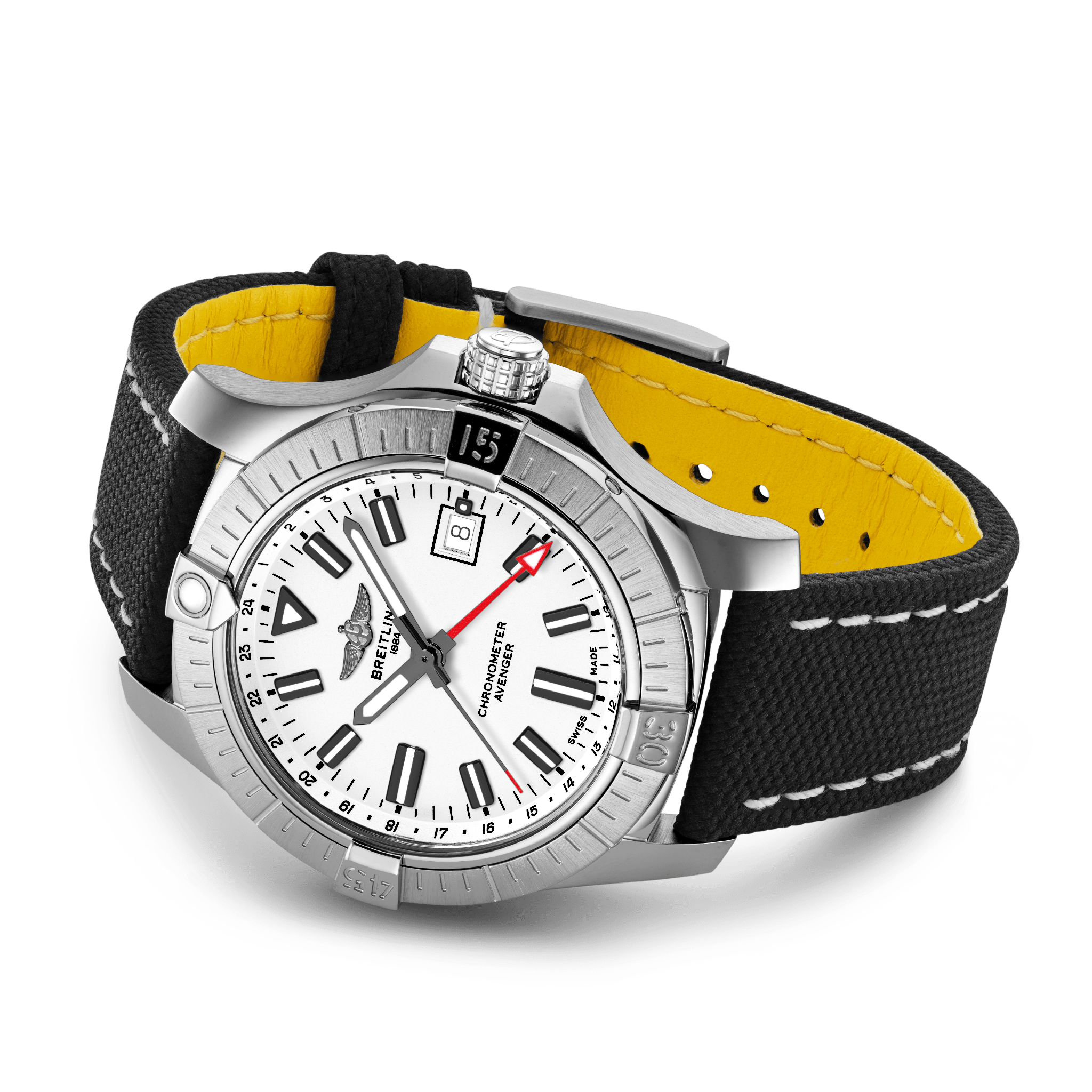 Bold, extremely robust and shock resistant, the Avenger Automatic GMT 43 features an additional red hand indicating a second time zone. As a true Breitling Avenger, it can be used wearing gloves and offers unrivalled safety and reliability to any airborne adventurer.