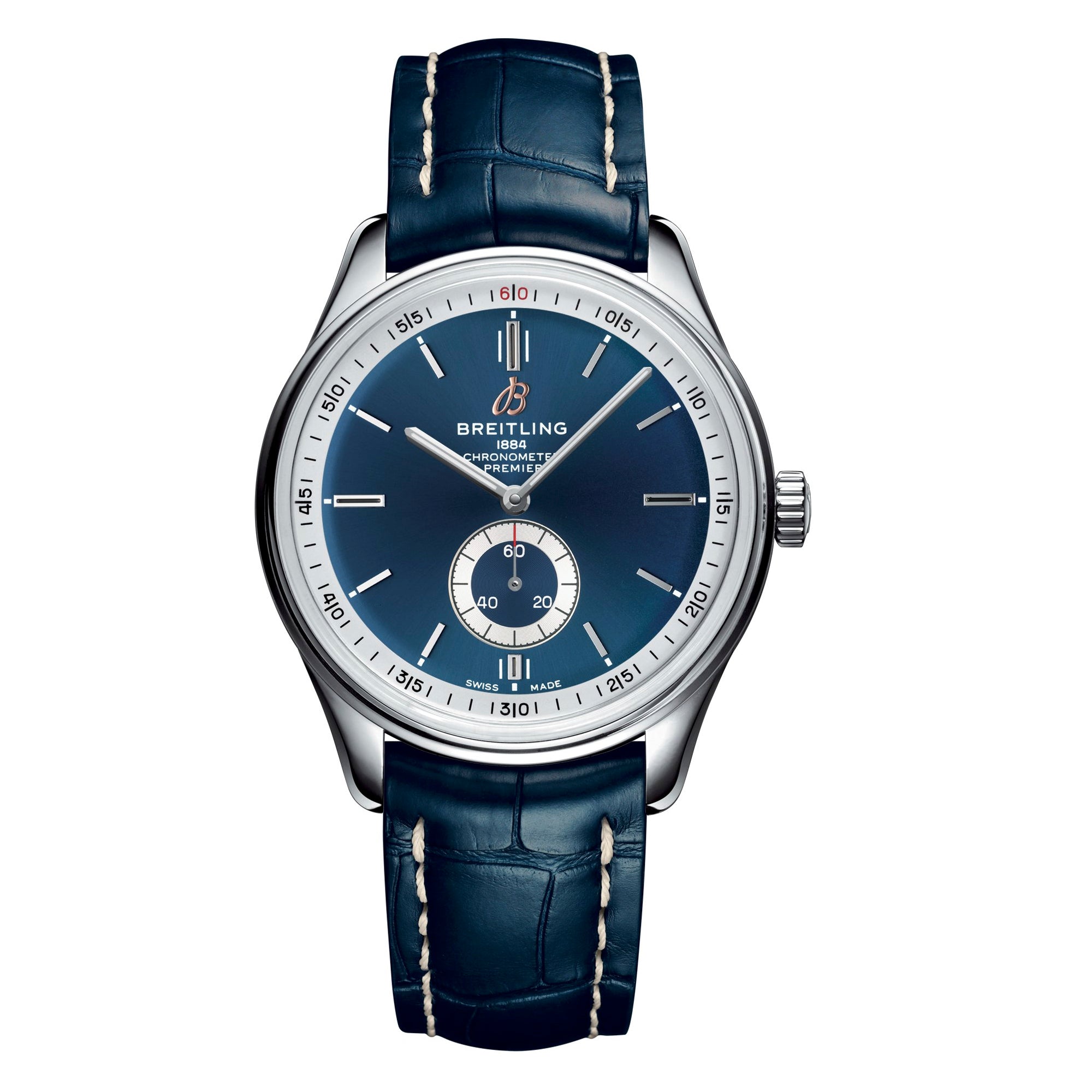 This elegant, understated Premier Automatic 40 features a 40 mm stainless steel case presented on a stylish blue crocodile strap. Driving the Premier Automatic 40 is a Breitling caliber 37.Â
