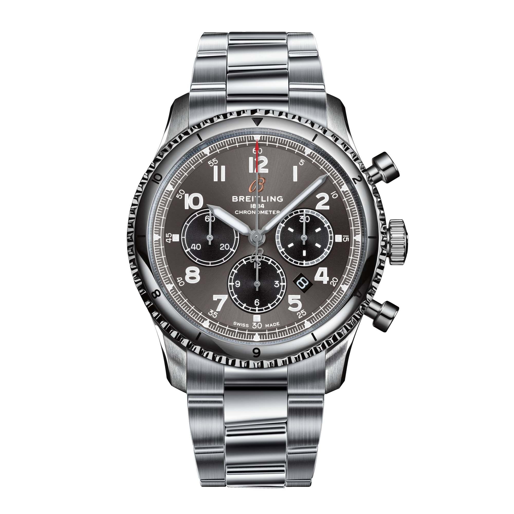 The Aviator 8 B01 Chronograph 43 is powered by the in-house Breitling Manufacture Caliber 01. The self-winding 43 mm watch has a ratchet-wheel chronograph with vertical coupling and an impressive power reserve of more than 70 hours. The display features 30-minute and 12-hour counters as well as a date window. The highlight of this new range, the Aviator 8 B01 Chronograph 43, is available in steel with a black or blue dial, or in 18k red gold with a bronze dial, each with the distinctive design elements of contrasting sub-dials. Presented on a steel bracelet or on an alligator leather strap, the COSC-certified chronometer features a transparent sapphire caseback.