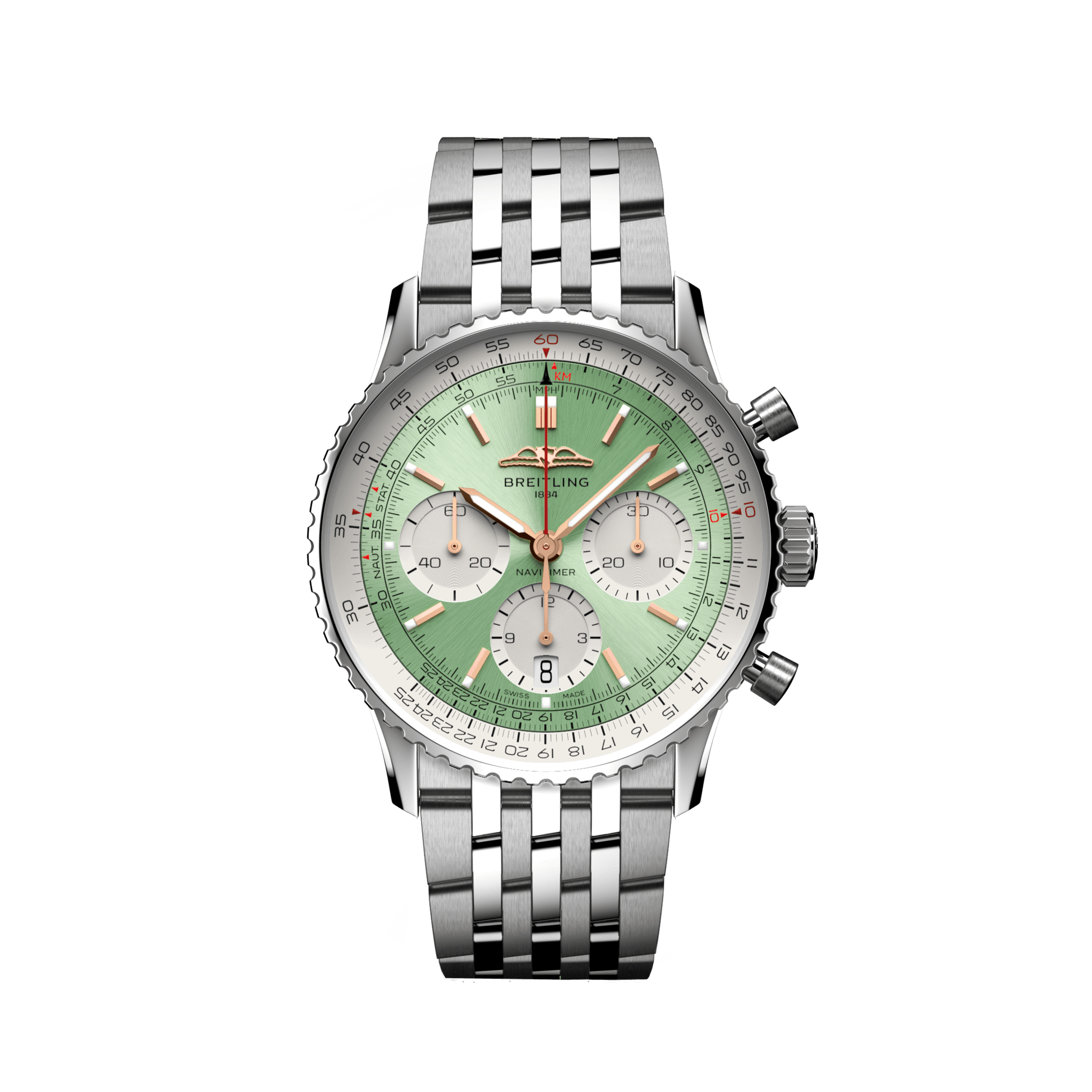 Breitling’s iconic pilot’s chronograph – for the journey. In 1952, Willy Breitling developed a wrist-worn chronograph with a circular slide rule that would allow pilots to perform all necessary flight calculations. Two years later, the Aircraft Owners and Pilots Association (AOPA) announced the design as its official timepiece. The “navigation timer” – or Navitimer – was born. The AOPA was (and remains) the largest pilots’ club in the world, counting nearly every US aviator among its ranks. As the defacto pilot’s watch throughout the glory days of civil aviation, the Navitimer was worn by airline captains and aircraft enthusiasts. It even made its way into space on the wrist of astronaut Scott Carpenter in 1962. And it wasn’t only pilots drawn to the watch’s irrepressible aesthetic. Celebrities of the day such as Miles Davis and Serge Gainsbourg were devotees, proving that the Navitimer had style as well as function. There have been many iterations of Breitling’s icon since its debut 70 years ago, but this new Navitimer captures its most classic features, while enhancing them with modern refinements. A flattened slide rule and a domed crystal create the illusion of a sleeker profile. Alternating polished and brushed metal elements give a lustrous, yet understated finish. Most notably, new colors in shades of blue, green and copper, define the updated dial options. And if there is one update sure to spark nostalgia, it’s the return of the AOPA wings to their original position at 12 o’clock. For 70 years, Breitling’s original pilot’s watch has been beloved by aviators and tastemakers in equal measure. Worn by astronauts in space and the biggest stars on earth, it is Breitling’s most iconic timepiece and one of the most recognizable watches of all time.