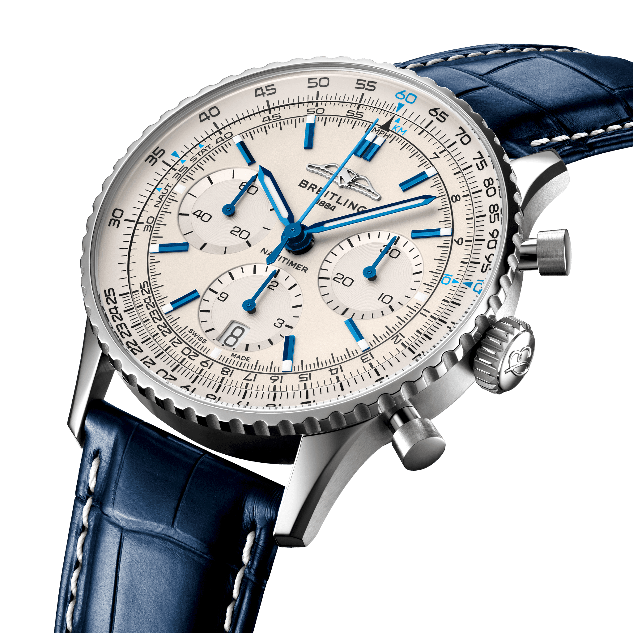There have been many iterations of Breitling’s icon since its debut 70 years ago, but this new Navitimer captures its most classic features, while enhancing them with modern refinements. A flattened slide rule and a domed crystal create the illusion of a sleeker profile. Alternating polished and brushed metal elements give a lustrous, yet understated finish. Most notably, new colors in shades of blue, green and copper, define the updated dial options. And if there is one update sure to spark nostalgia, it’s the return of the AOPA wings to their original position at 12 o’clock. For 70 years, Breitling’s original pilot’s watch has been beloved by aviators and tastemakers in equal measure. Worn by astronauts in space and the biggest stars on earth, it is Breitling’s most iconic timepiece and one of the most recognizable watches of all time.