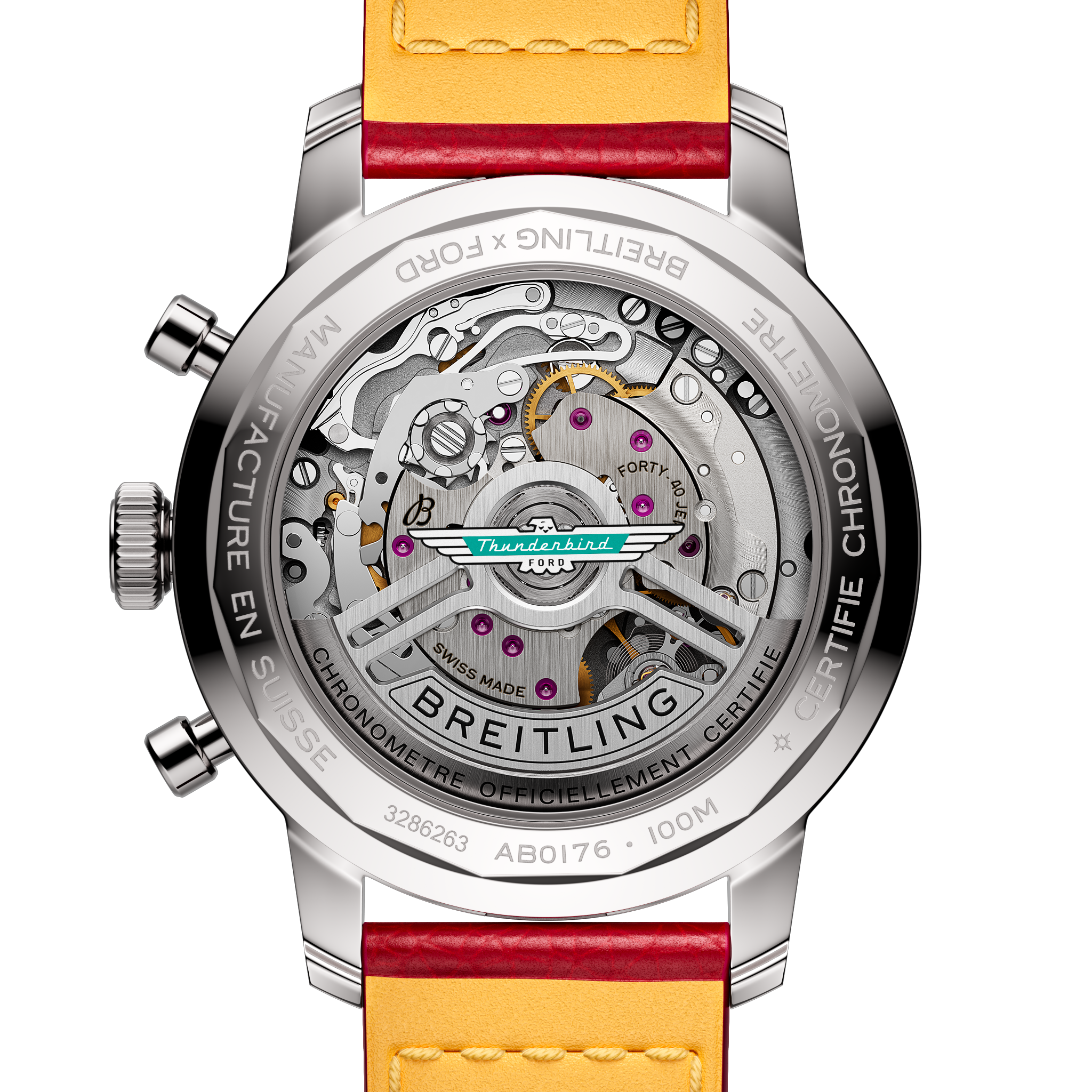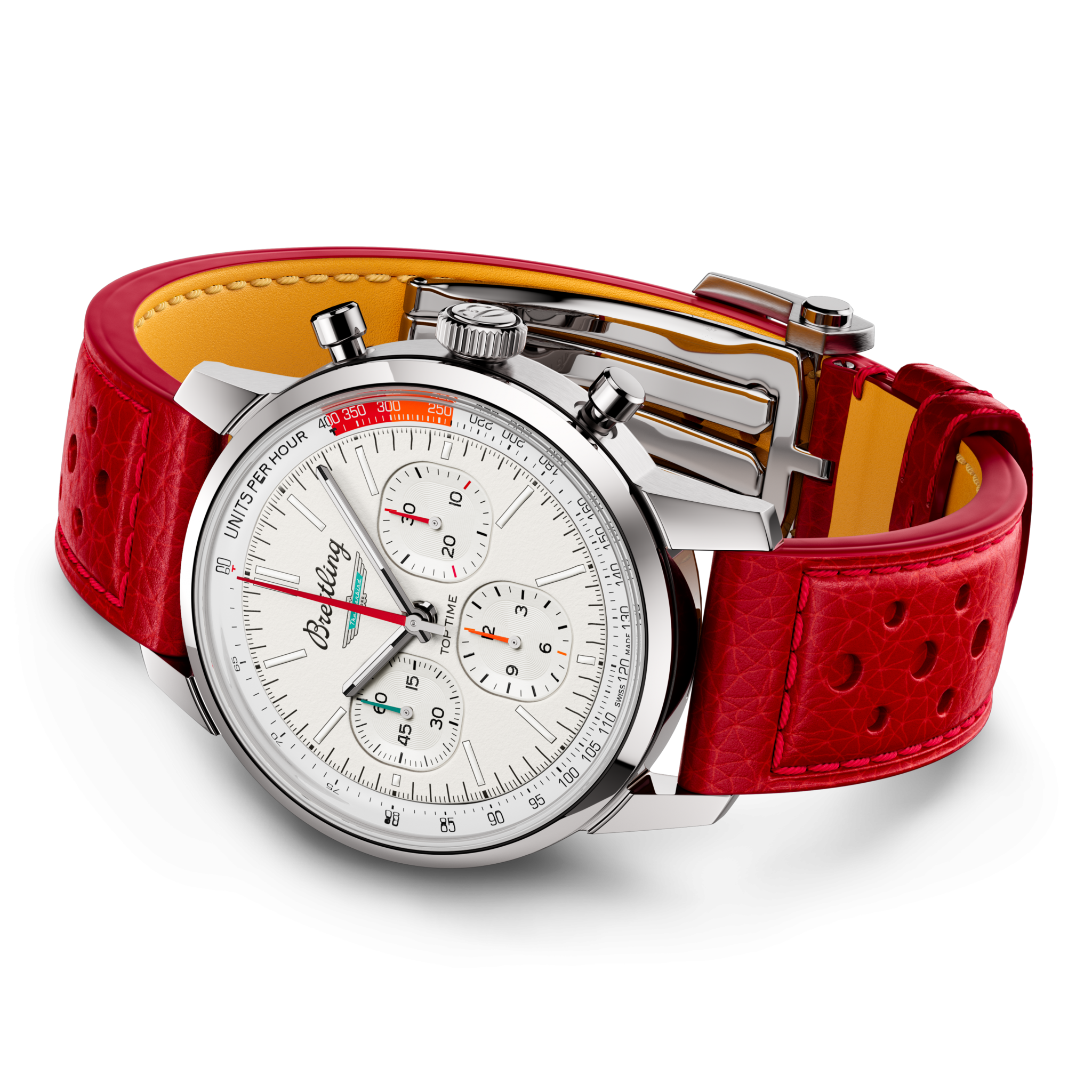 The 1960s was a decade of experimentation, fun, freedom and energy. Whether cruising on a motorcycle or revving up a sportscar, living life at full speed was the order of the day. Willy Breitling felt this change of pace and set out to design an unconventional chronograph that would capture the verve of era. He called it the Top Time. That spirited tradition continues today with Breitling partnering with some of the coolest names in wheels to create its Top Time designs. The Ford Thunderbird was first unveiled at the 1954 Detroit auto show. It was touted as a fun-to-drive cabriolet that made its presence felt with its luxurious design, solid build and dramatic tailfin. The Top Time B01 Ford Thunderbird features the colors and emblem of its classic-car counterpart as well as a perforated leather racing strap, speed-measuring tachymeter scale and contrasting “squircle” (not quite square, not quite round) subdials that give the feel of vintage dashboard gauges. It also comes with a brag-worthy engine under the hood: the exceptional Breitling Manufacture Caliber 01. 01.