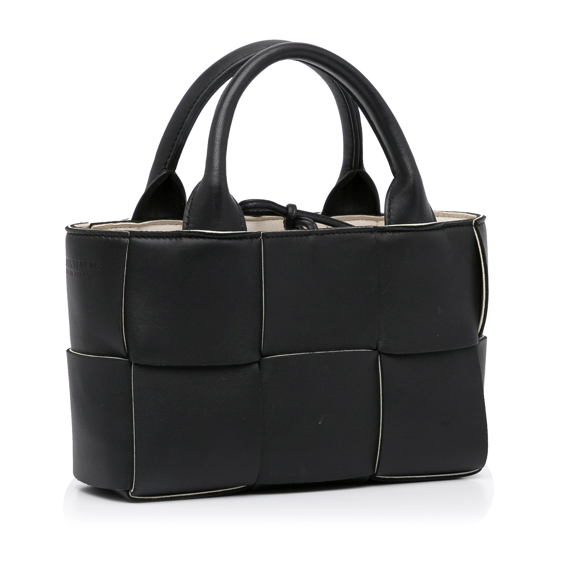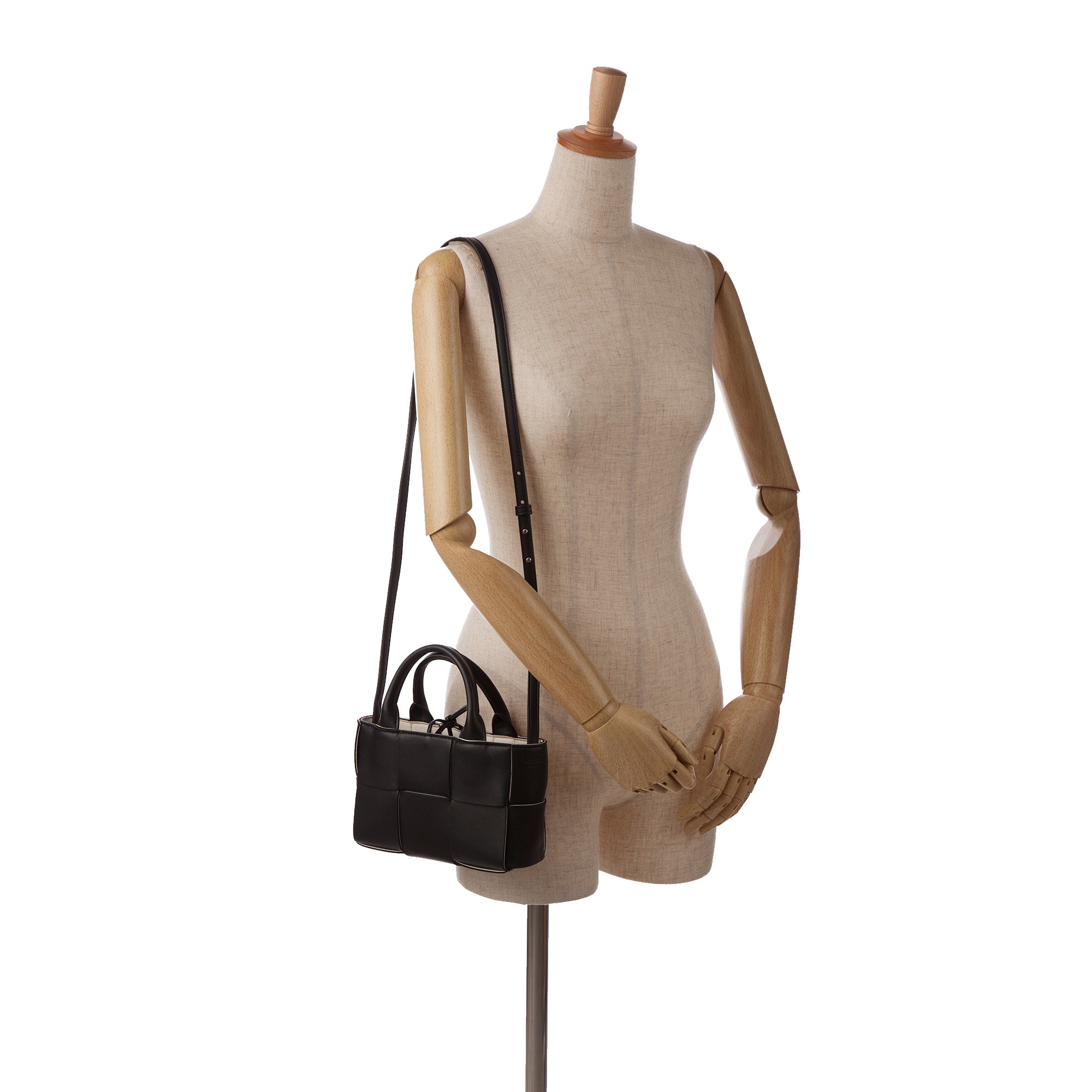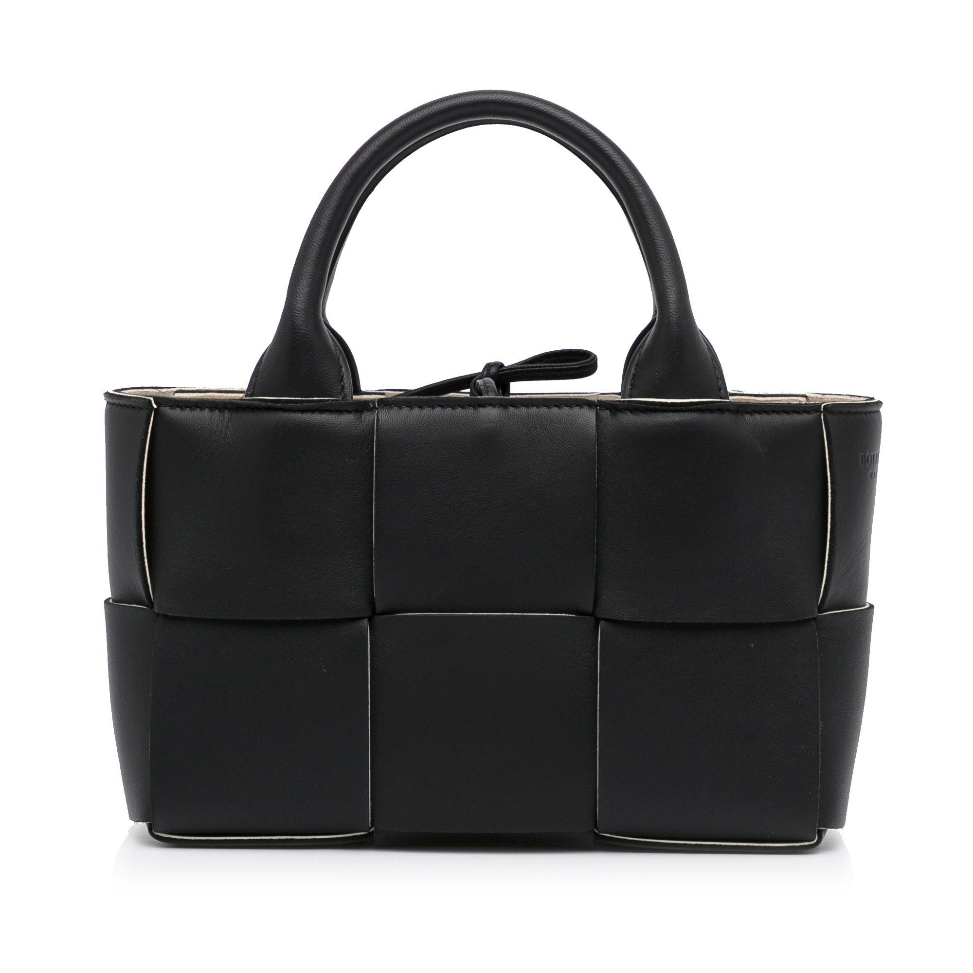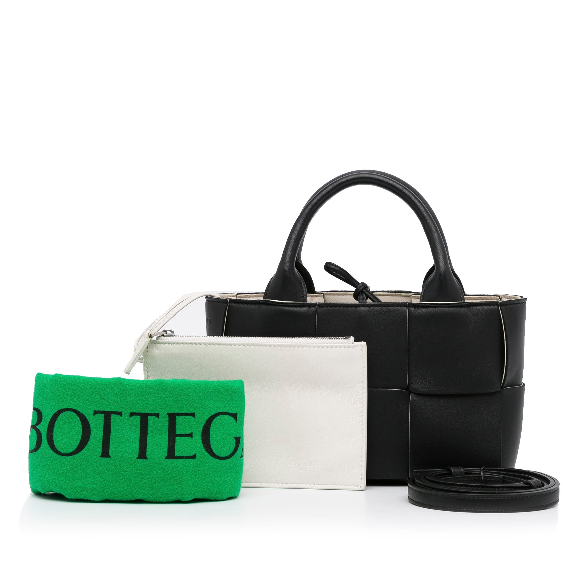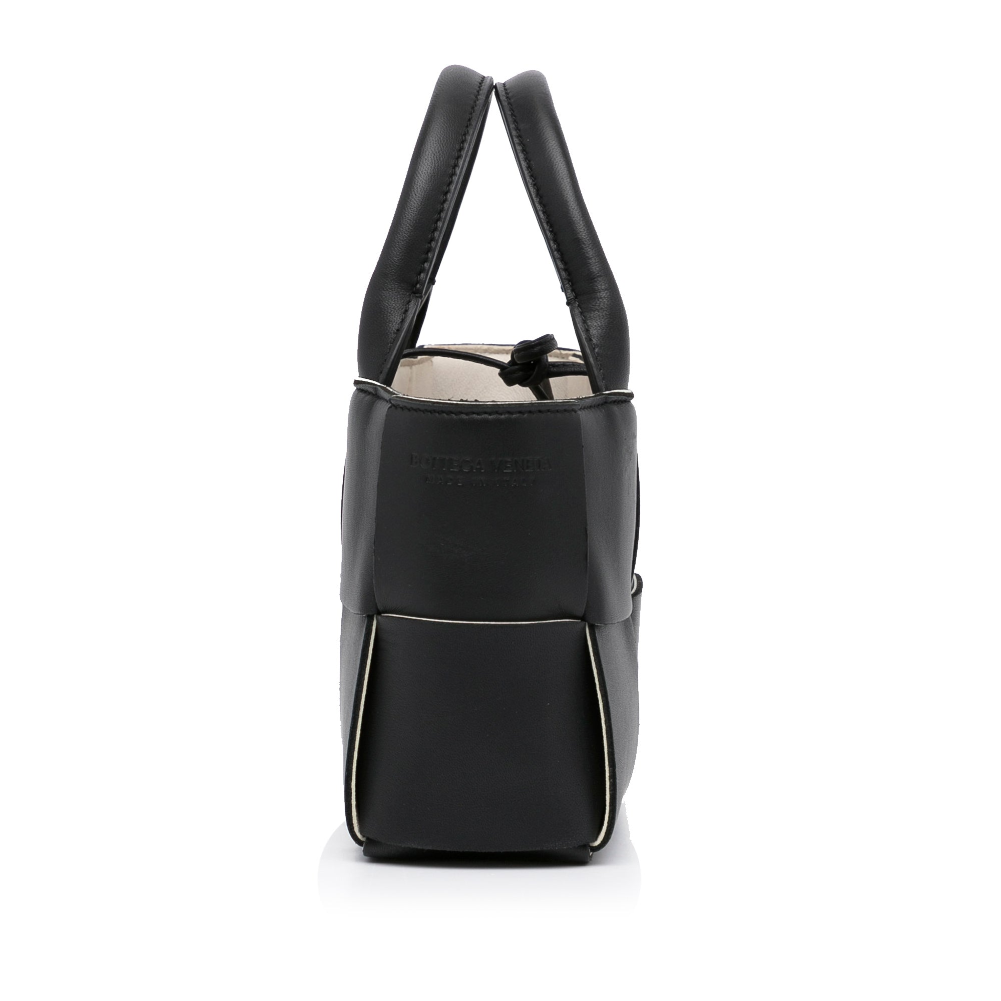 Product Details: Black Bottega Veneta Mini Arco Tote Satchel. The Mini Arco tote bag features a leather body, rolled leather handles, a flat leather detachable strap, and an open top with a leather knot closure. 5.1″ L x 8.3″ W x 3.1″ D, 3.9″ drop.