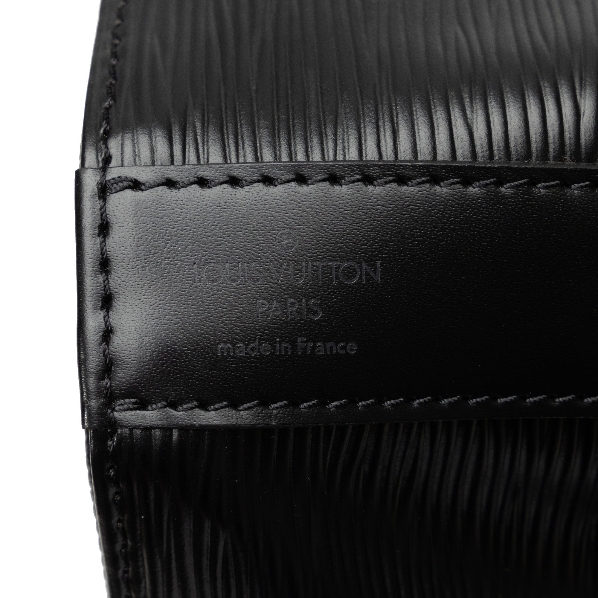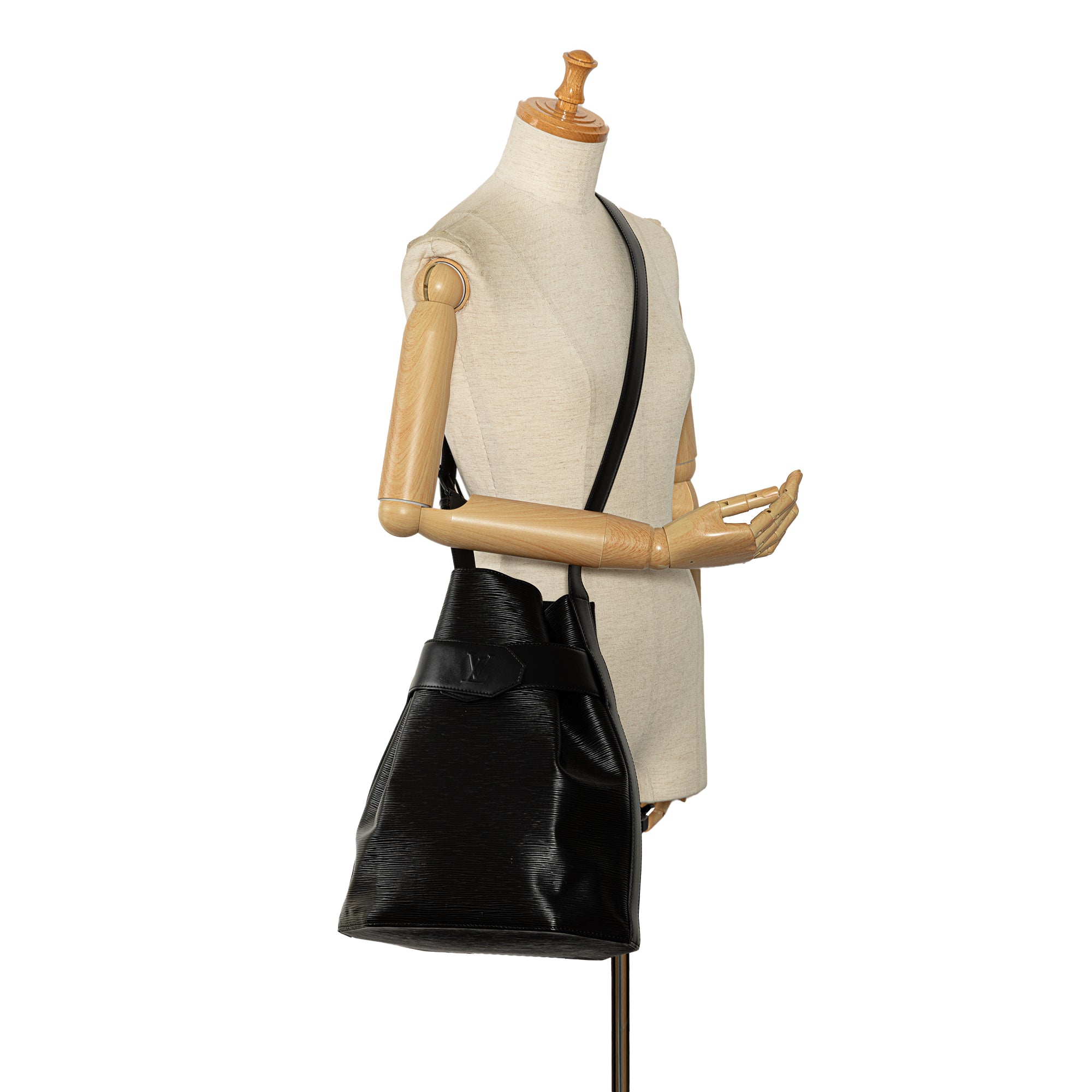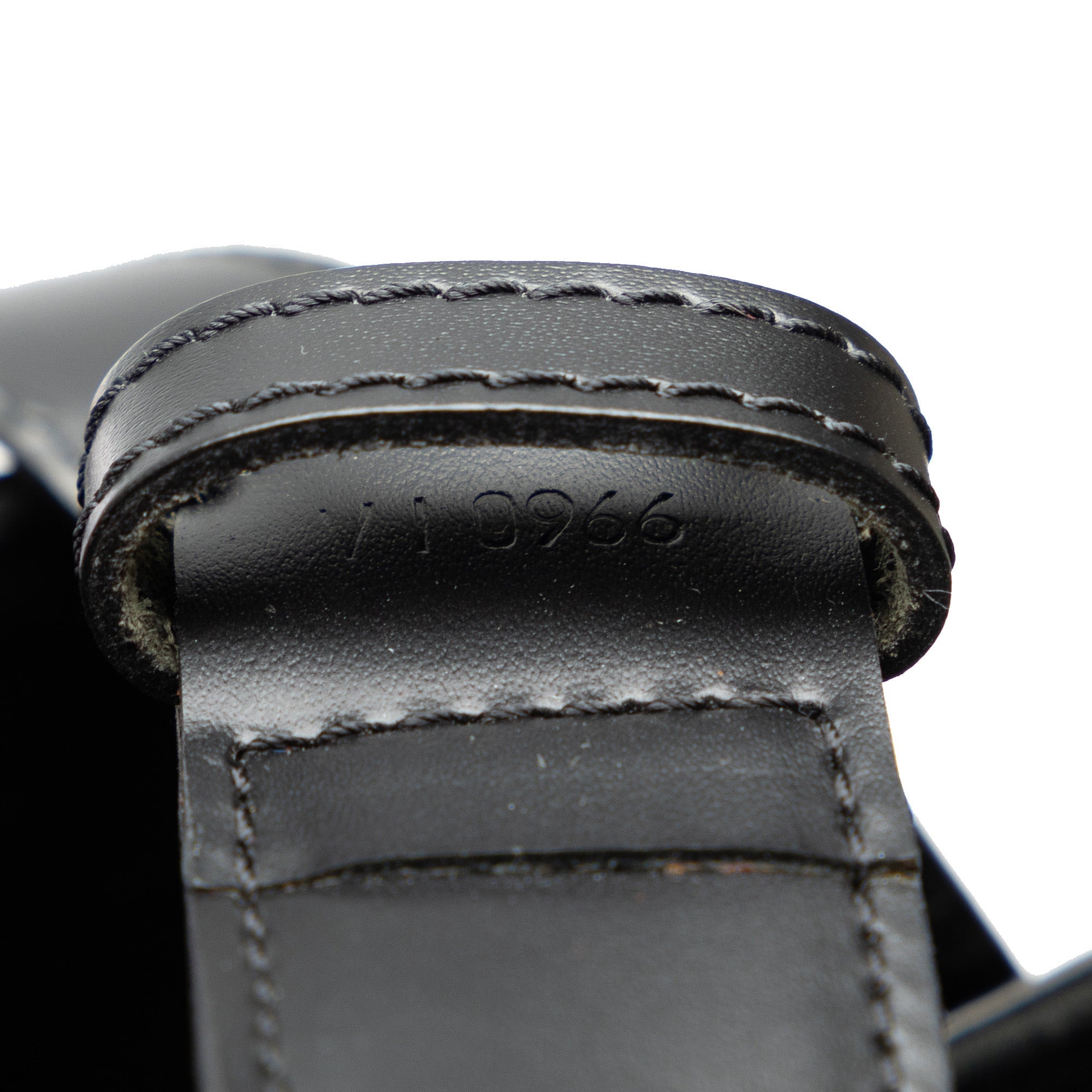 Product Details: Black LV Epi Sac D Epaule PM Bucket Bag. The Sac D Epaule PM features an epi leather body, an open top with a leather belt and magnetic snap closure, and an adjustable flat leather shoulder strap. 11.8″ L x 10.6″ W x 5.5″ D. Serial number VI0966.