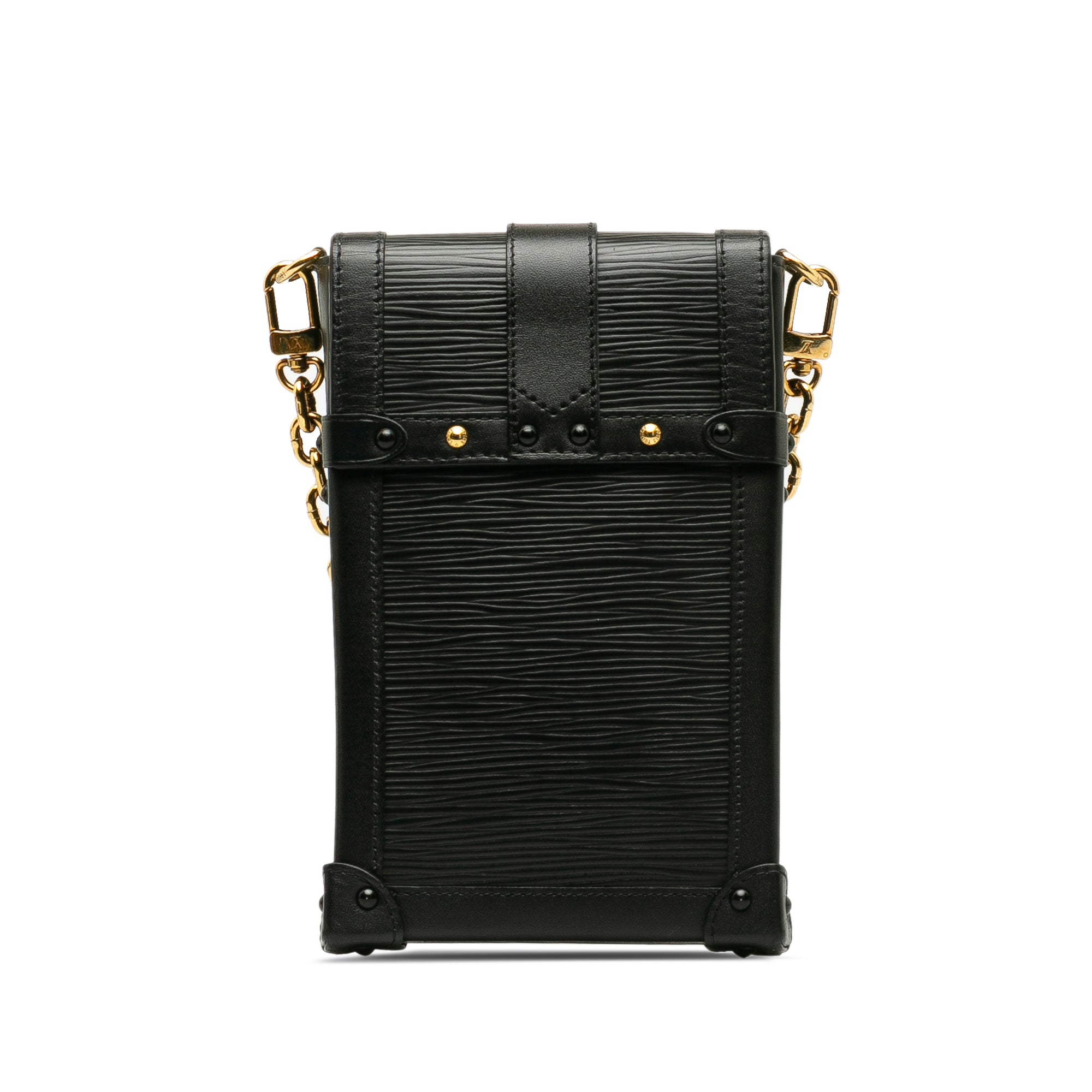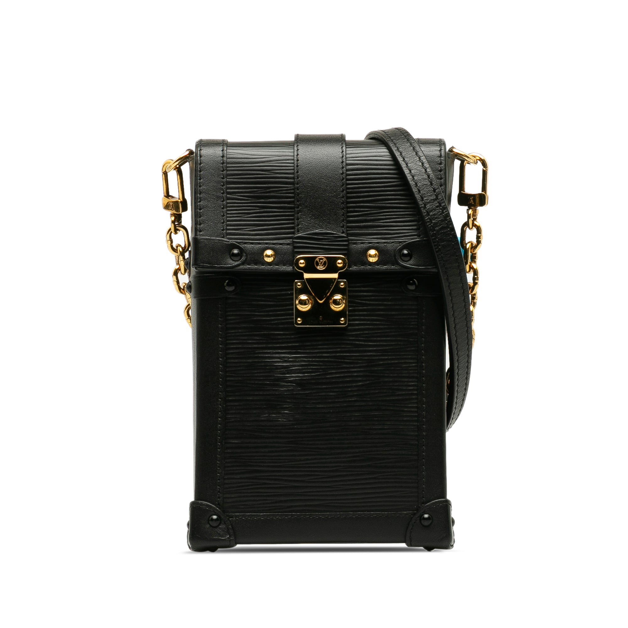 Product Details: Black LV Epi Vertical Trunk Pochette Crossbody Bag. The Vertical Trunk Pochette features an epi leather body, a detachable flat leather strap, a top flap with a push lock closure, and an interior slip pocket. 4.5″ L x 6.7″ W x 1.6″ D. Serial number GI1199.