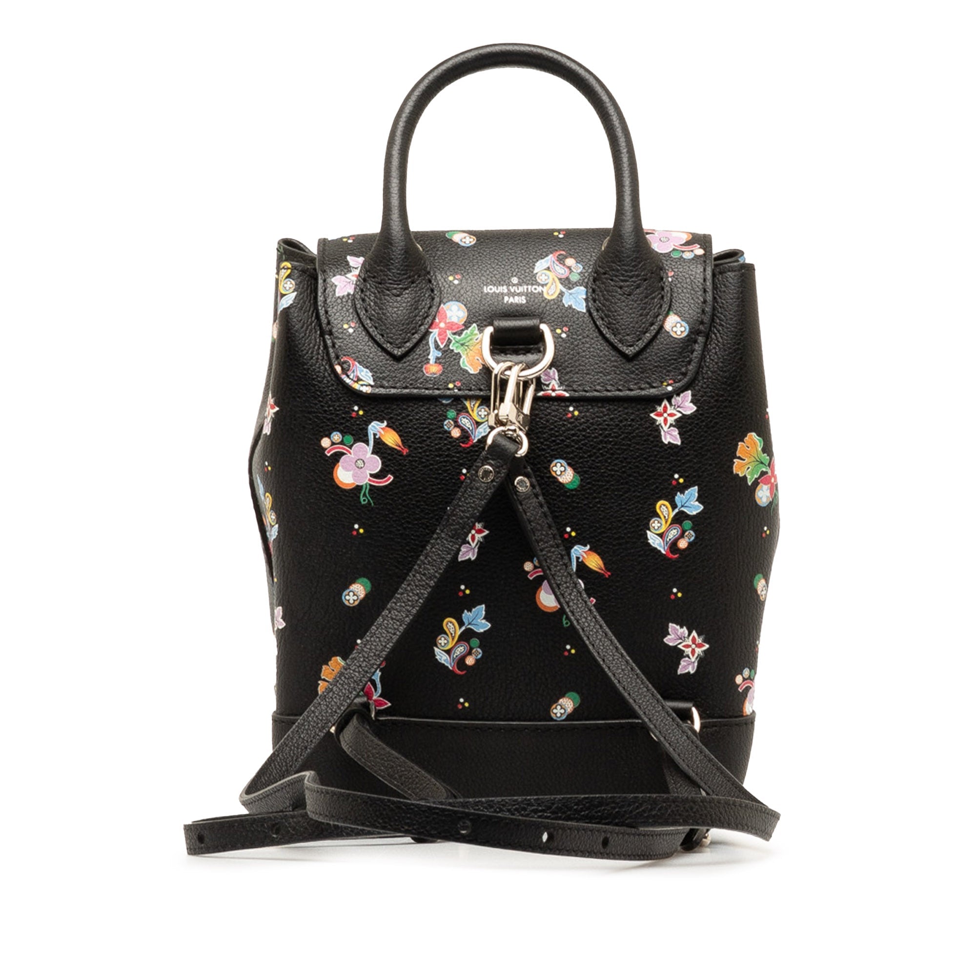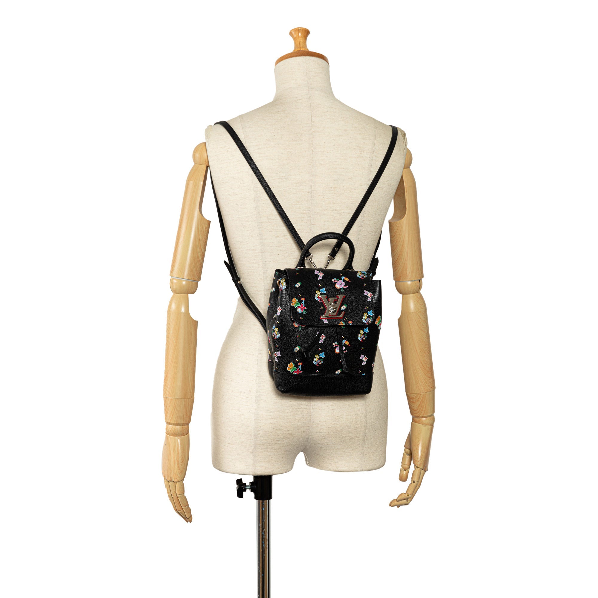 Product Details: Black LV Lockme Floral Backpack. The Lockme backpack features a printed leather body, a rolled leather top handle, adjustable flat back straps, a top flap with a silver-tone turn lock closure, a drawstring closure, and an interior slip pocket. 7.9″ L x 5.9″ W x 3.3″ D, 2.2″ drop. Serial number DU3157.