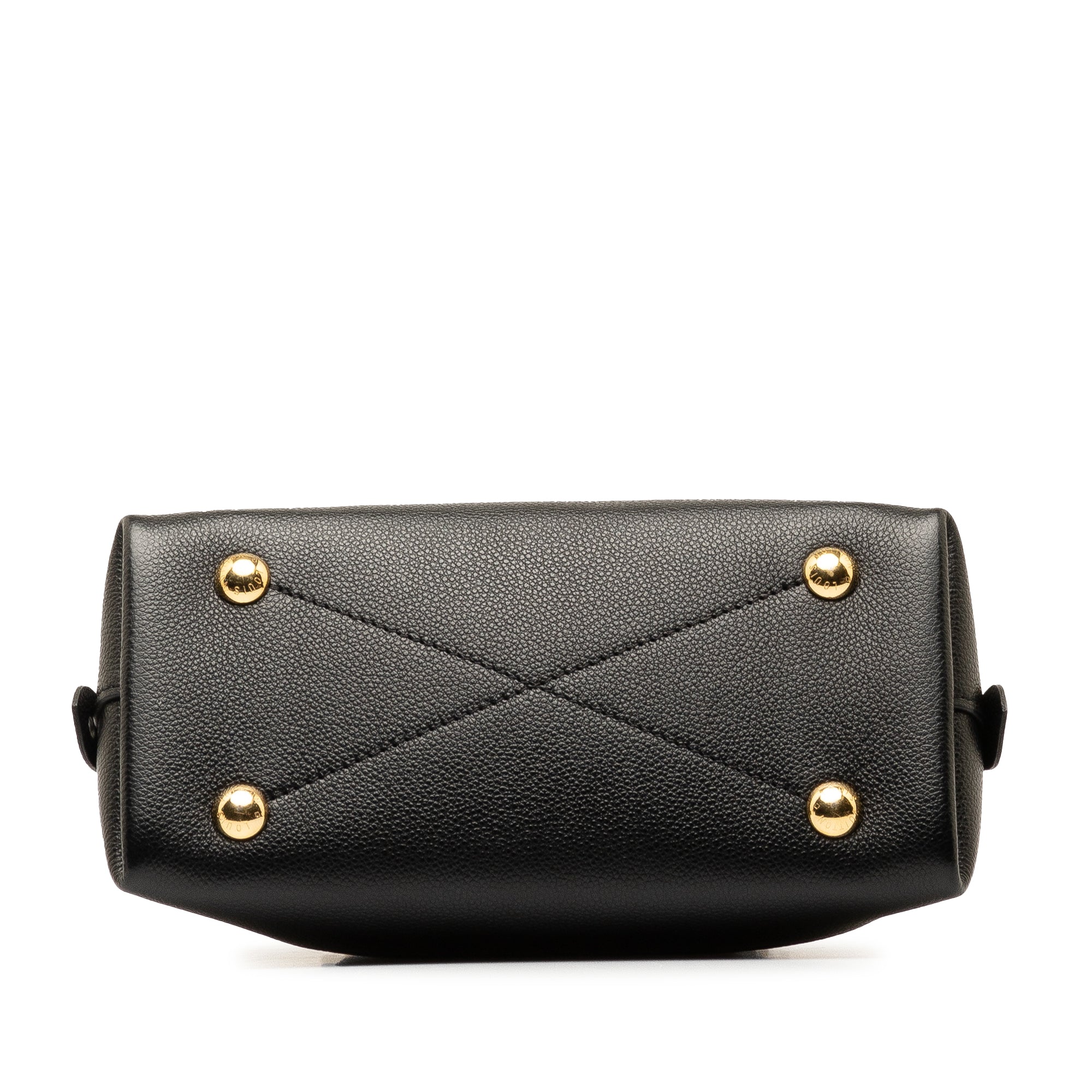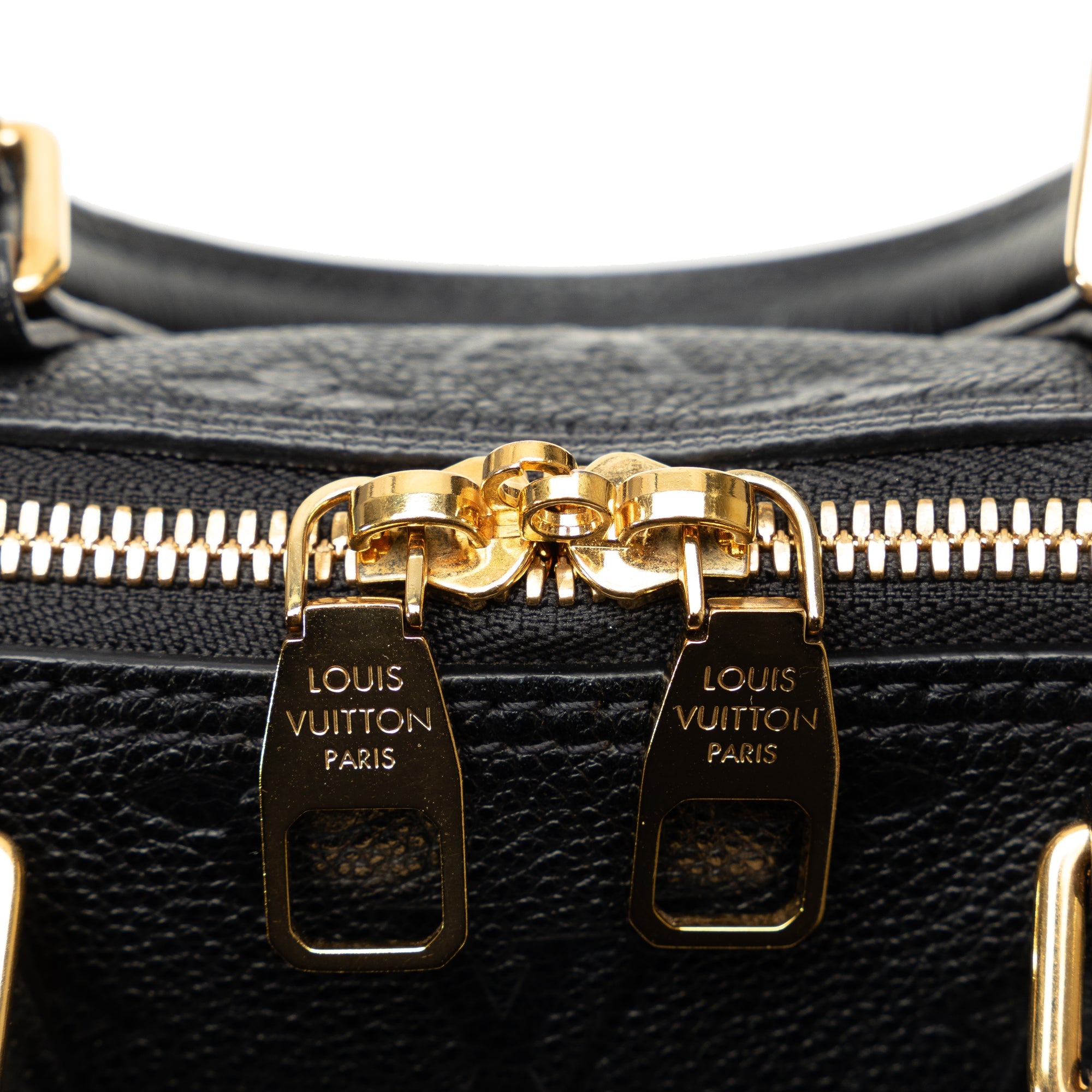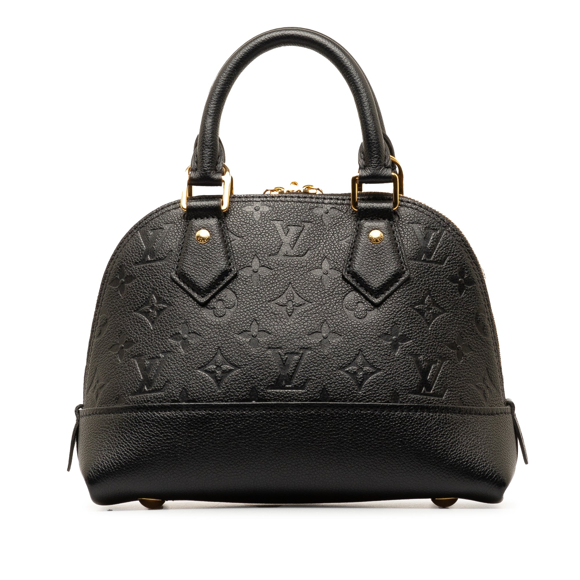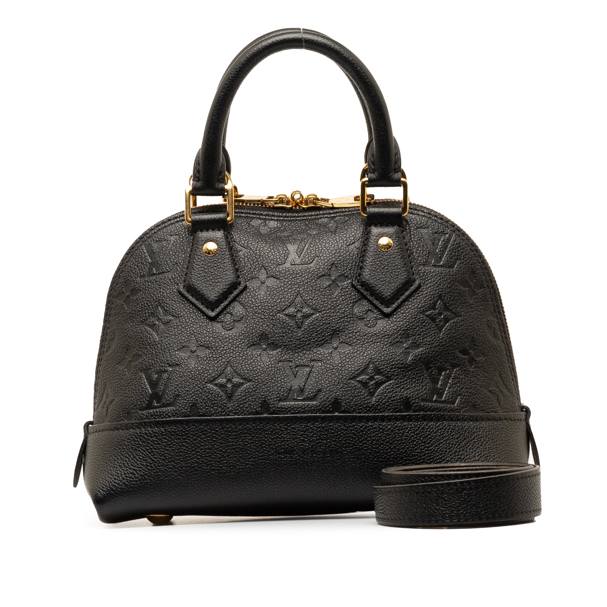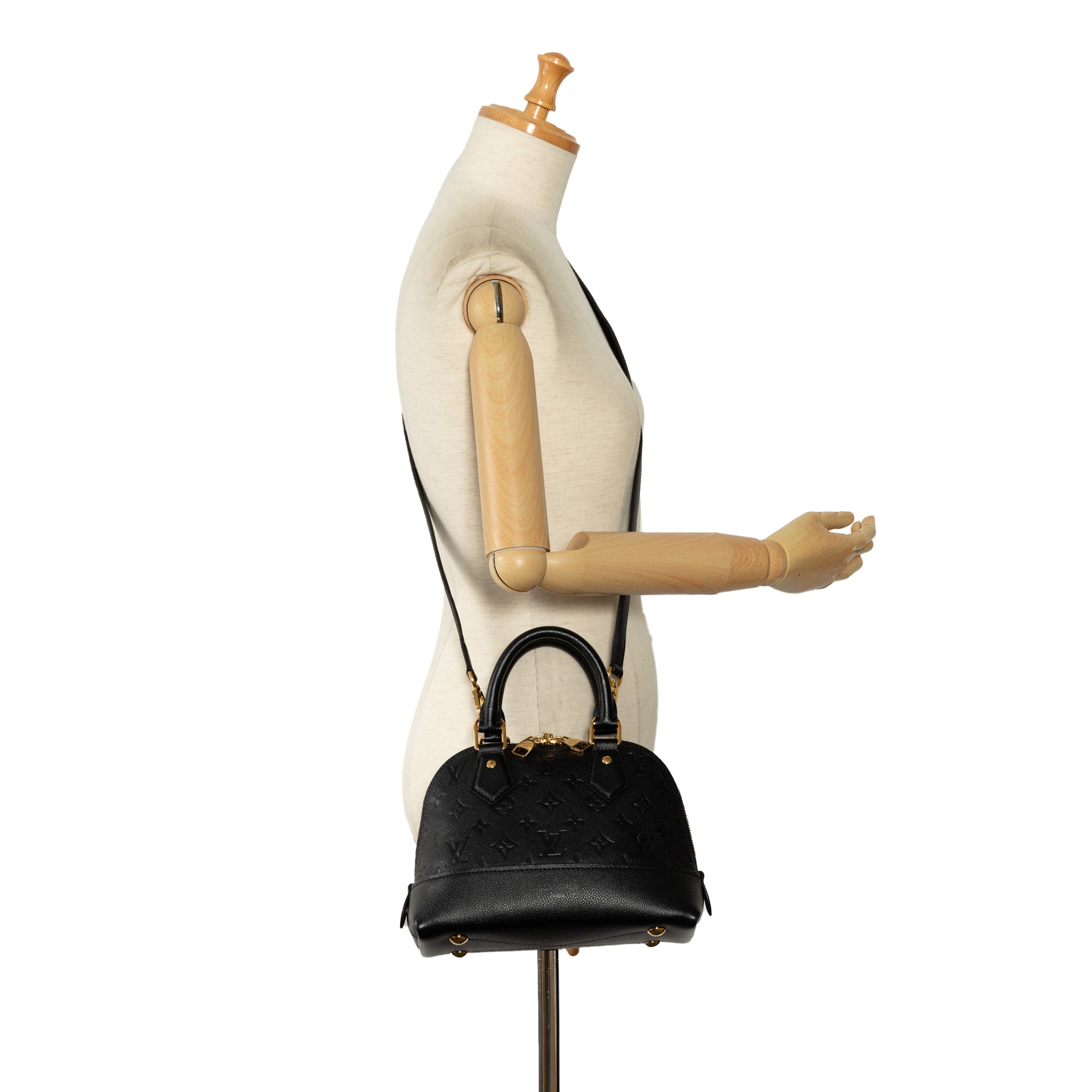 Product Details: Black LV Monogram Empreinte Neo Alma BB Satchel. The Neo Alma BB features a leather body, rolled leather handles, a detachable flat strap, a top zip closure, and an interior slip pocket. 7.5″ L x 9.4″ W x 4.3″ D, 2.8″ drop. Serial number AR1201.