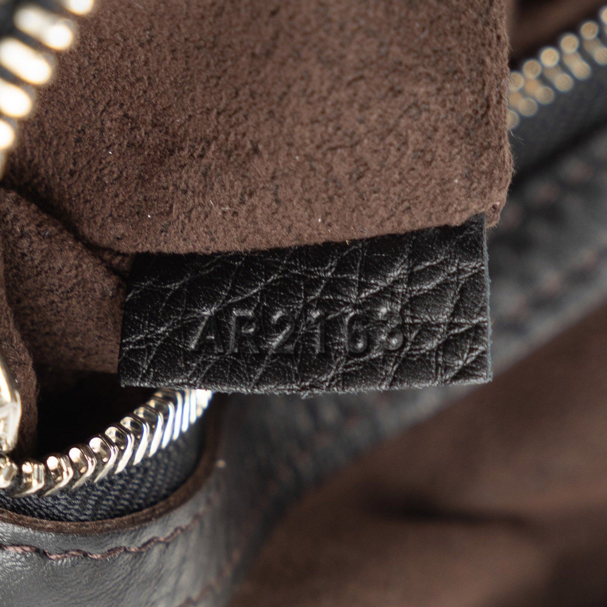 Product Details: Black LV Monogram Mahina Selene PM Satchel. The Selene PM features a leather body, a flat leather top handle, a detachable flat leather strap, a top zip closure, and interior zip and slip pockets. 11.4″ L x 14.6″ W x 1.6″ D, 2.8″ drop. Serial number AR2163.