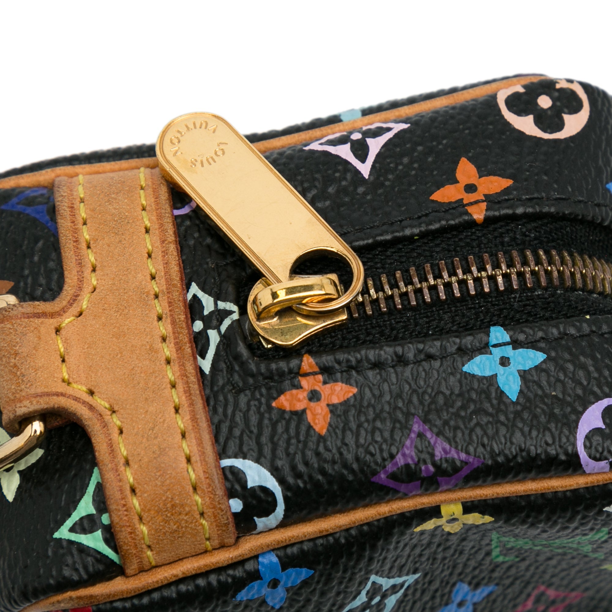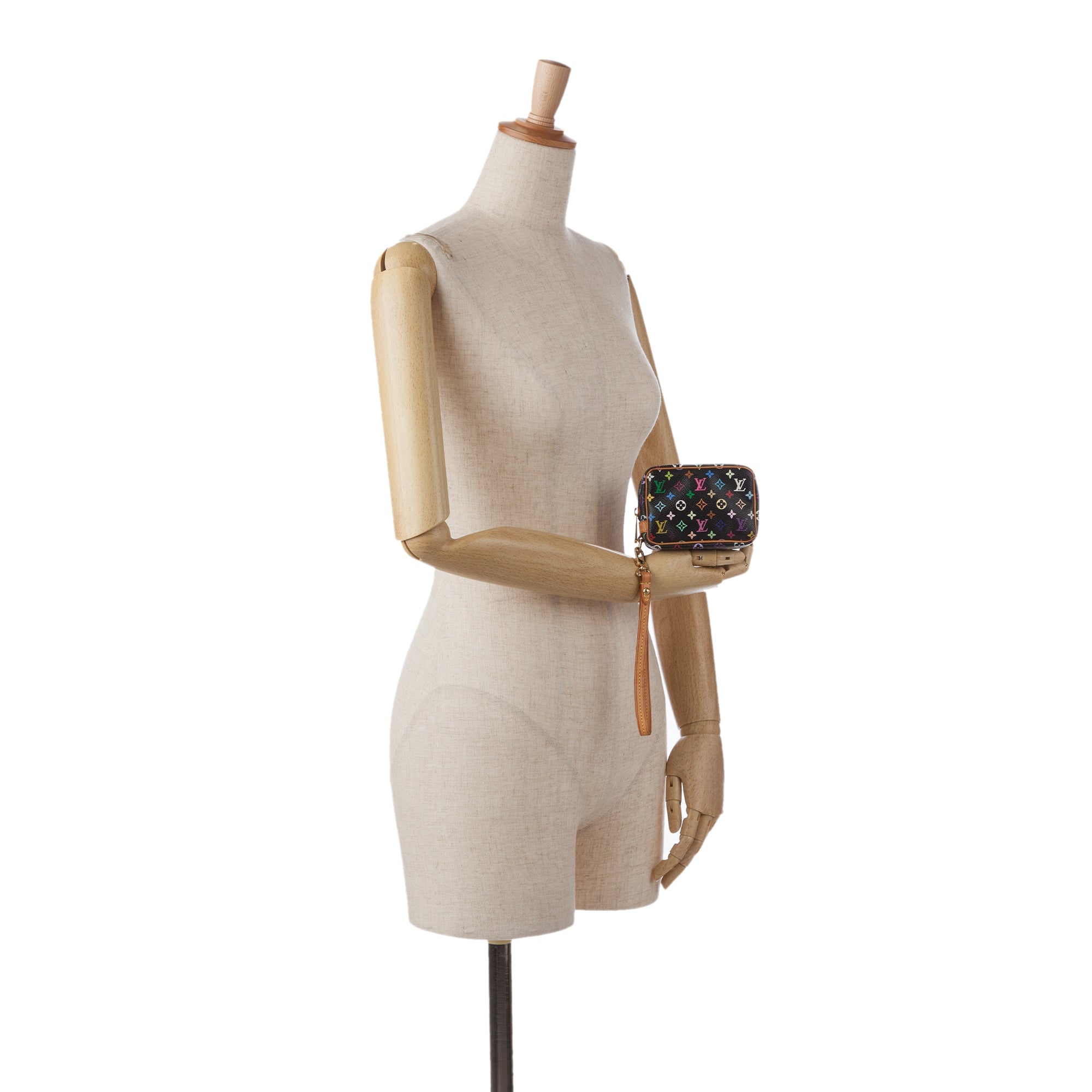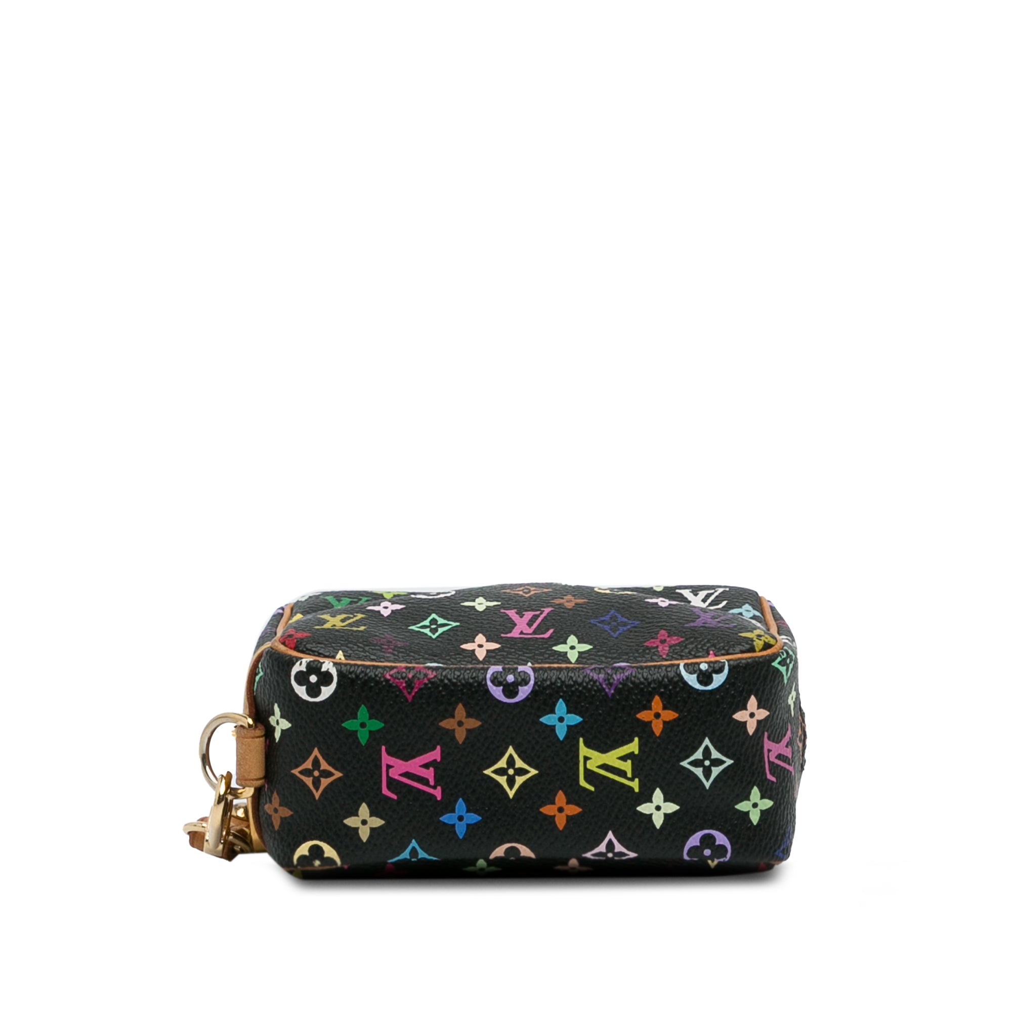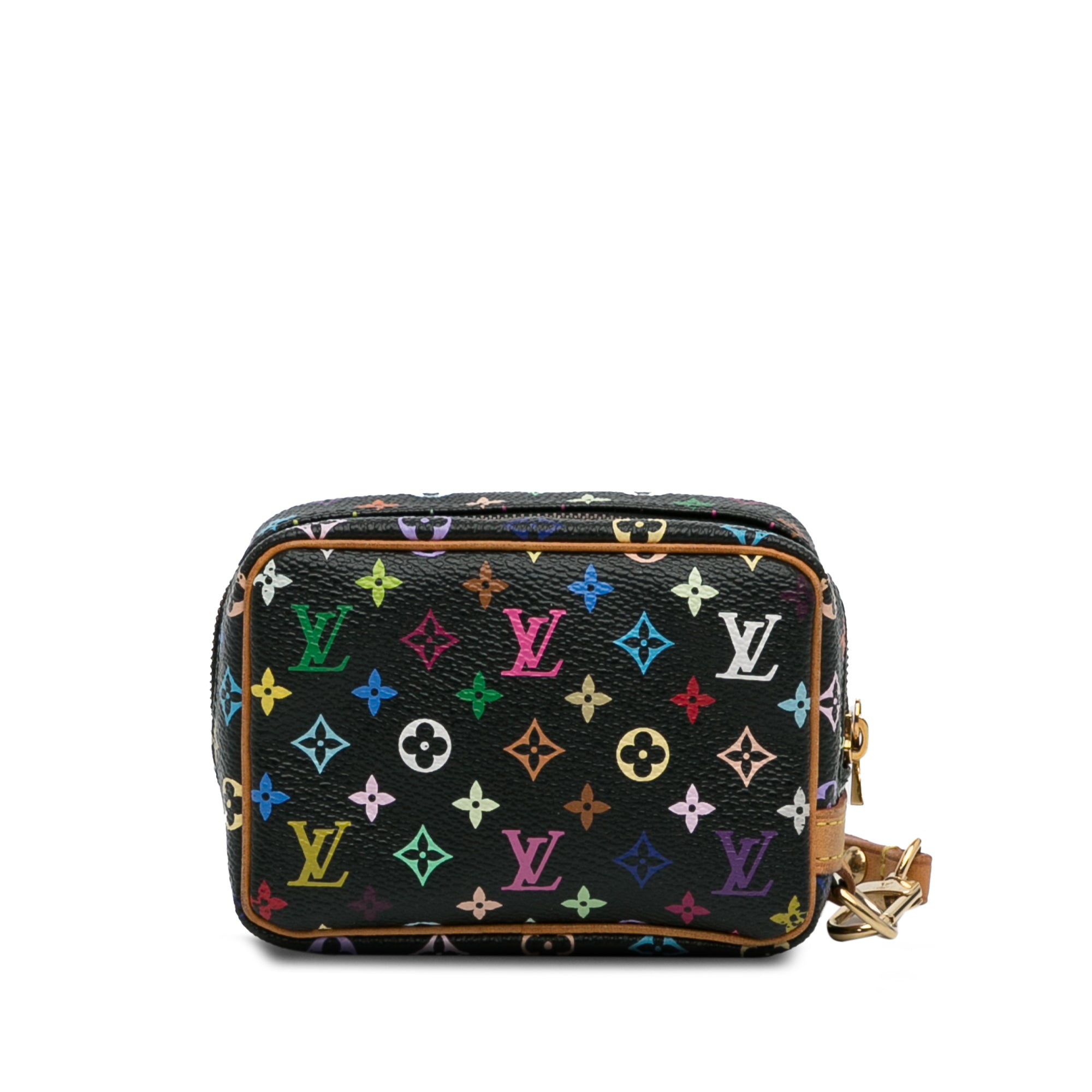 Product Details: Black LV Monogram Multicolore Trousse Wapity Pouch. The Wapity features a multicolore canvas body with vachetta leather trim, a flat vachetta leather wrist strap, a top zip closure, and an interior slip pocket. 3.1″ L x 4.3″ W x 2″ D, 6.3″ drop. Serial number FL2068.