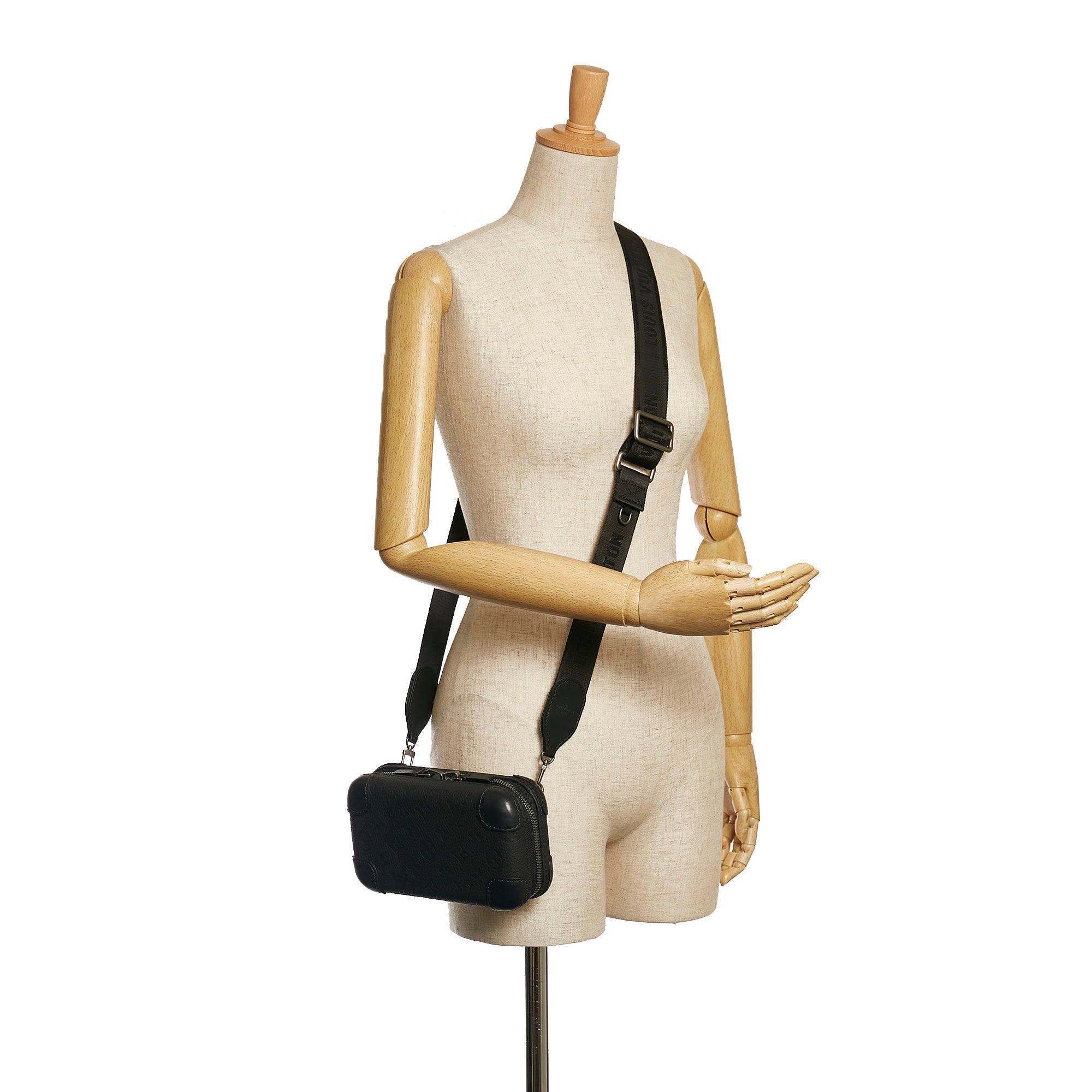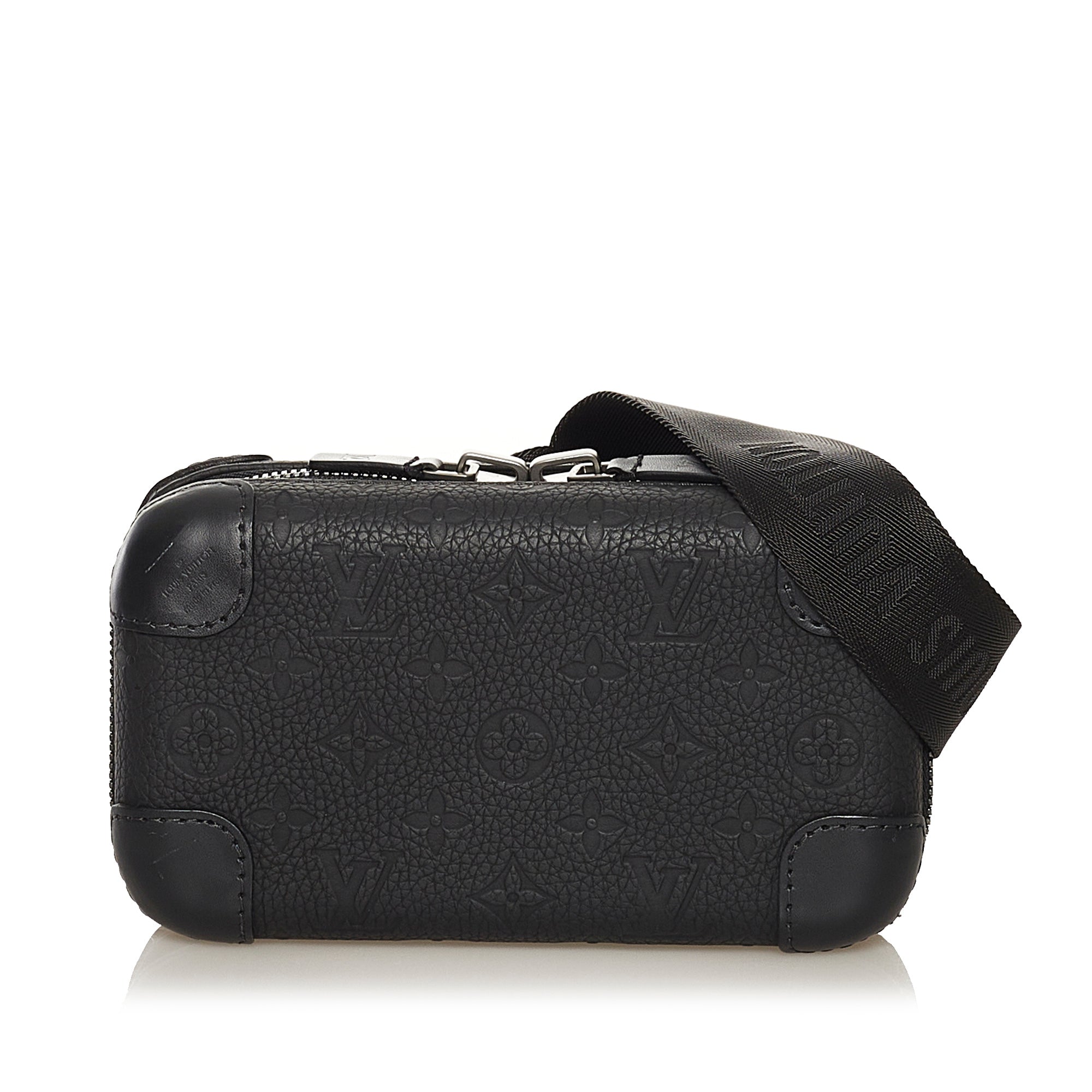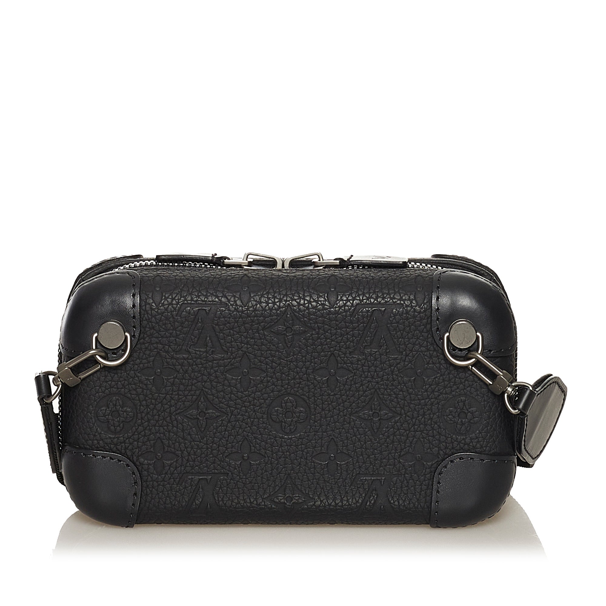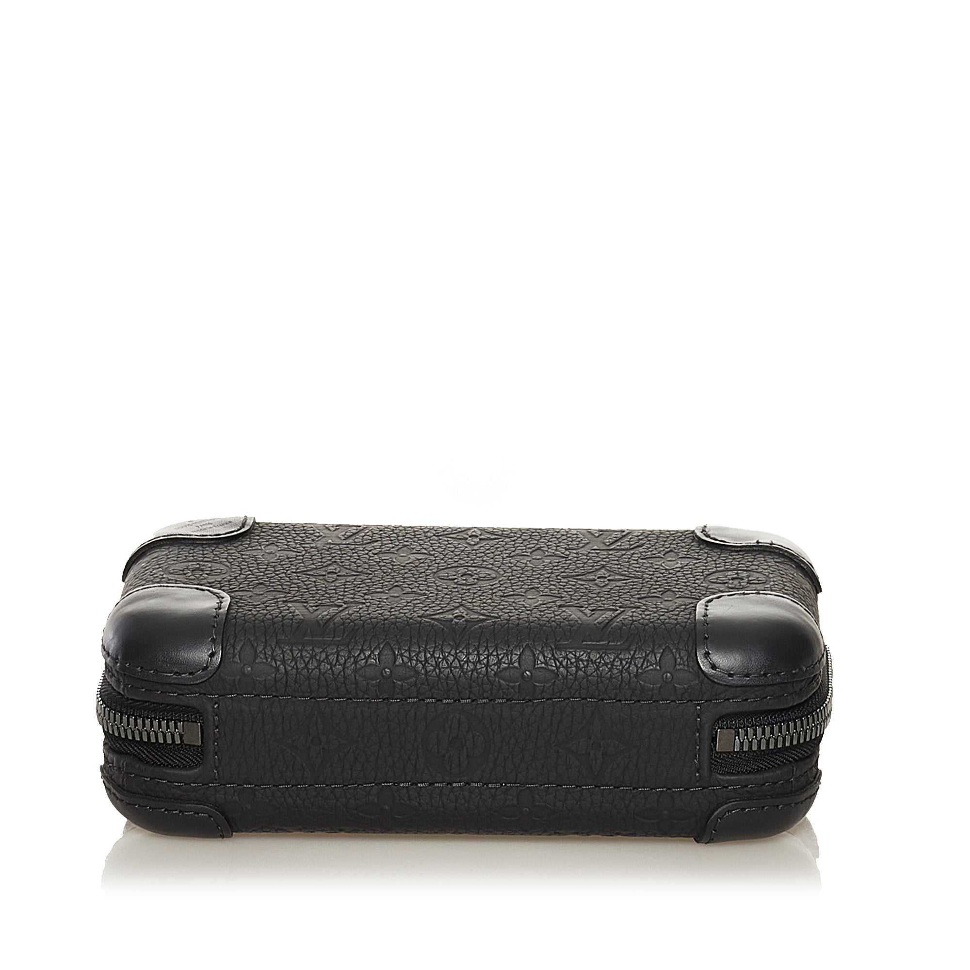 Product Details: Black LV Taurillion Monogram Horizon Clutch Bag. The Monogram Taurillon Horizon Clutch features an embossed monogram leather body, a detachable flat leather strap, a top zip closure and interior zip and slip pockets. 4.5″ L x 7.9″ W x 2.4″ D.