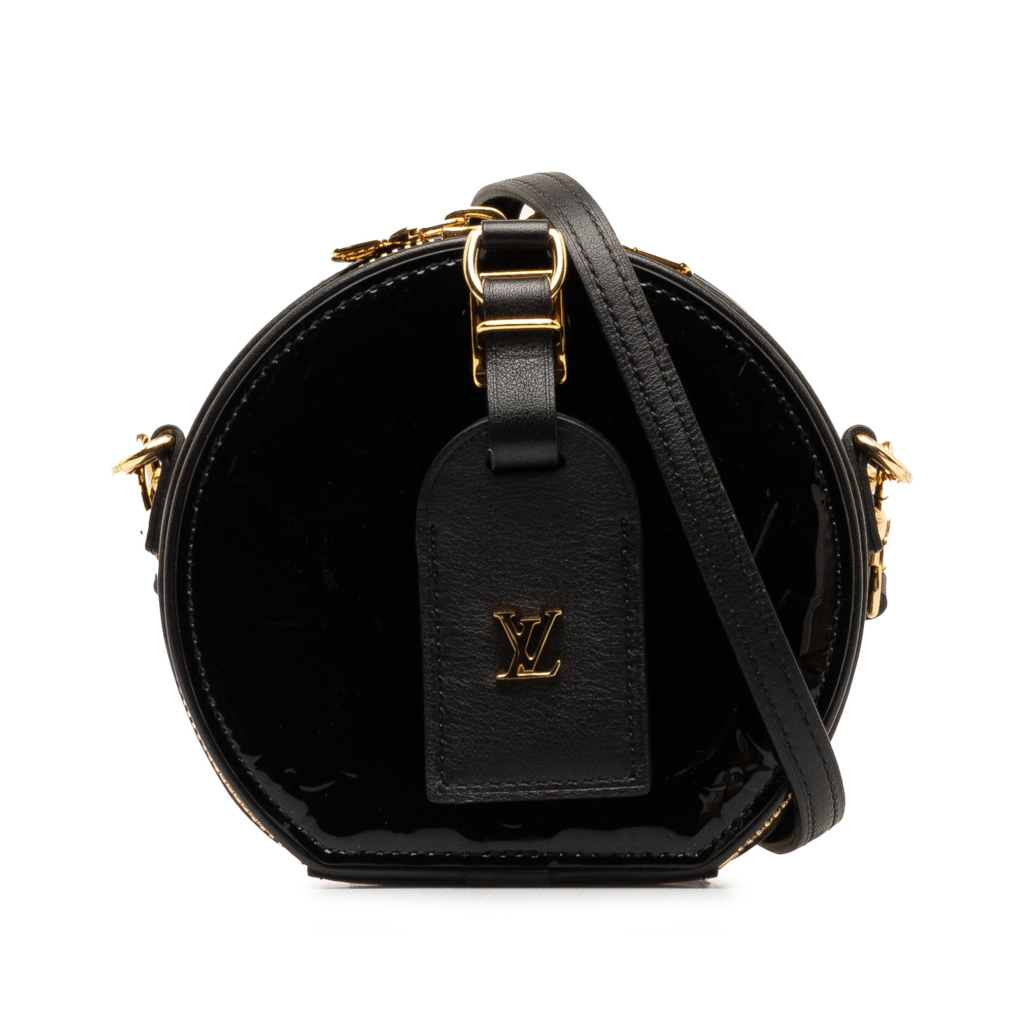 Product Details: Black LV Vernis Mini Boite Chapeau Souple Crossbody Bag. The Boite Chapeau Souple features vernis leather, a top zip closure, an adjustable flat leather strap, and an interior slip pocket. 4.5″ L x 4.9″ W x 2.4″ D. Serial number PL2159.