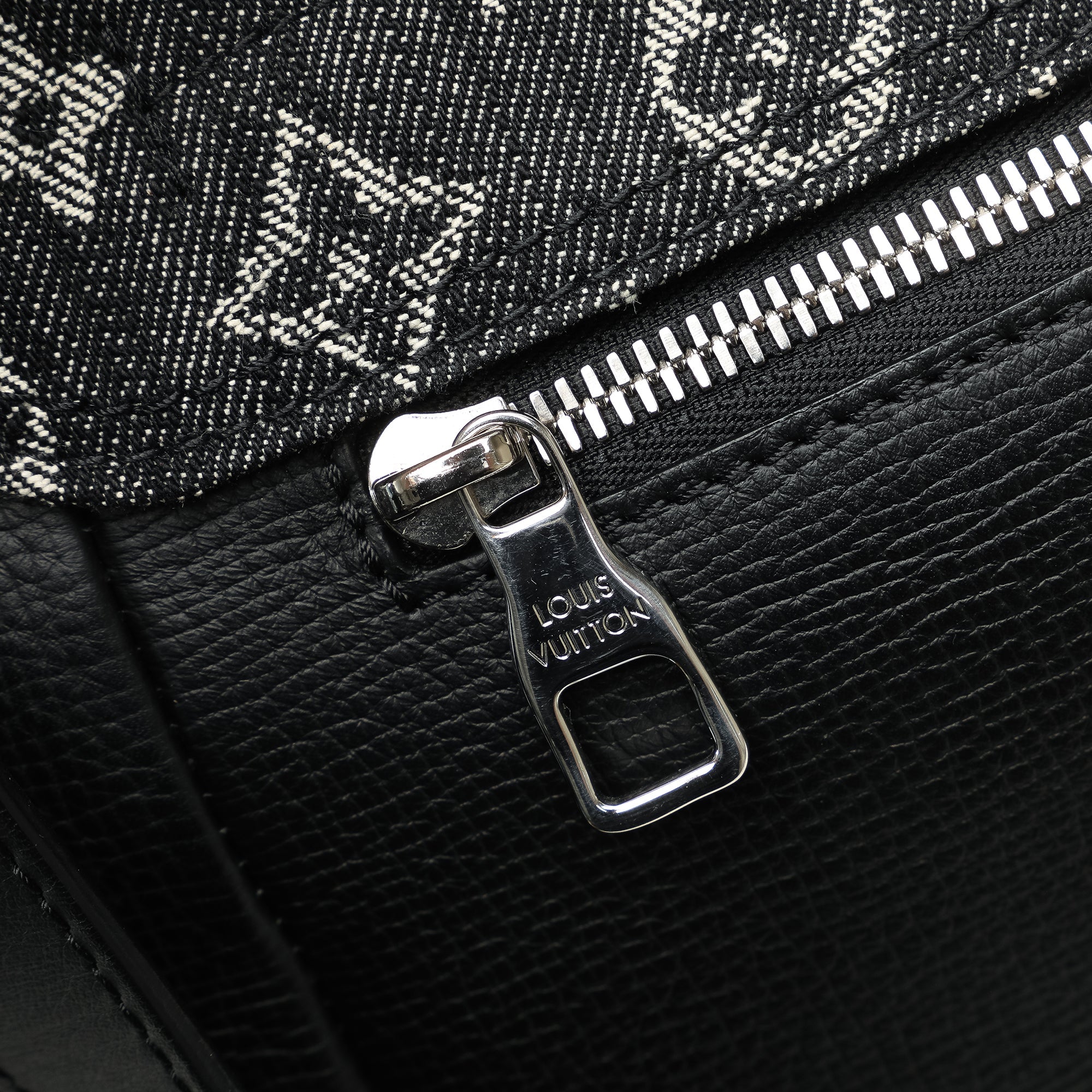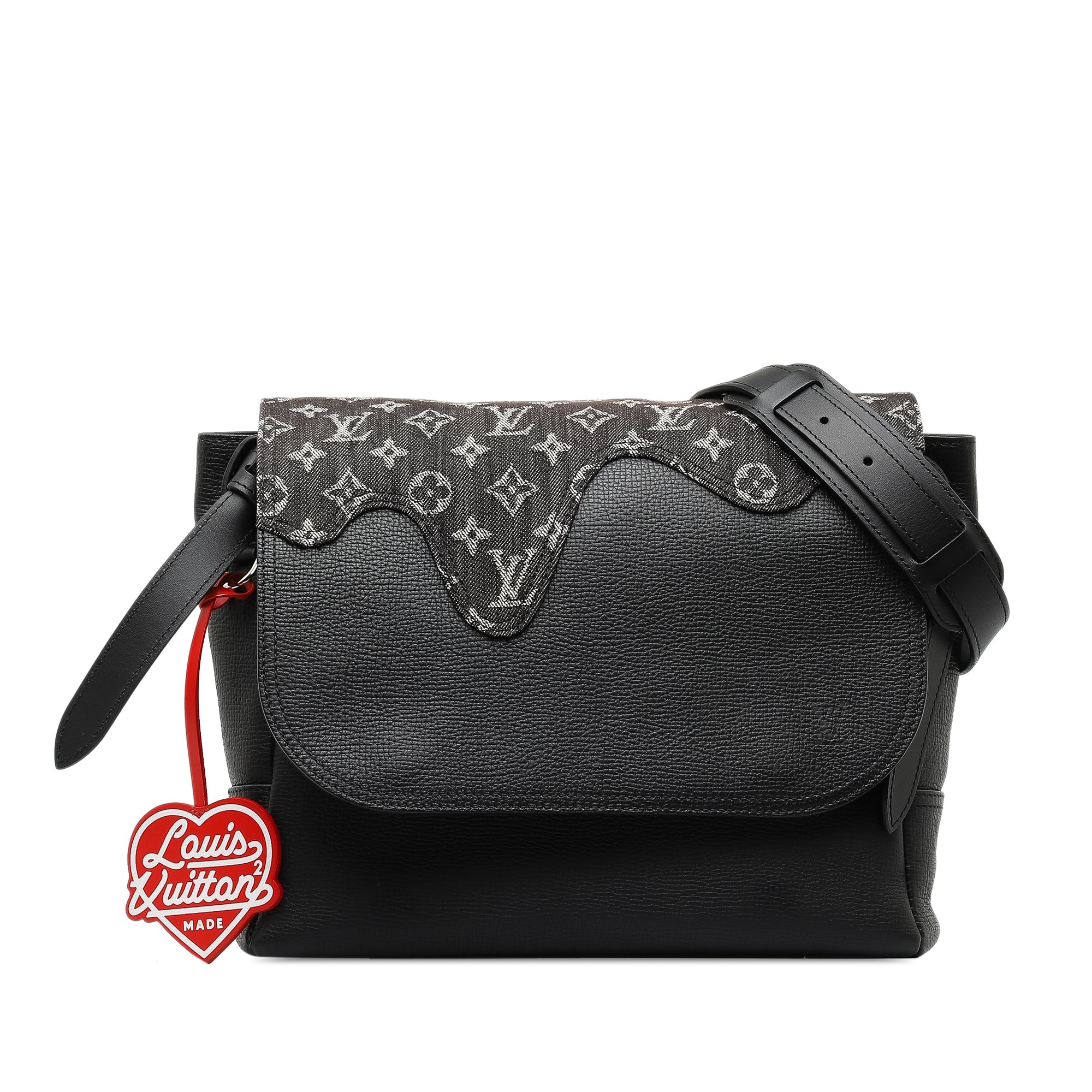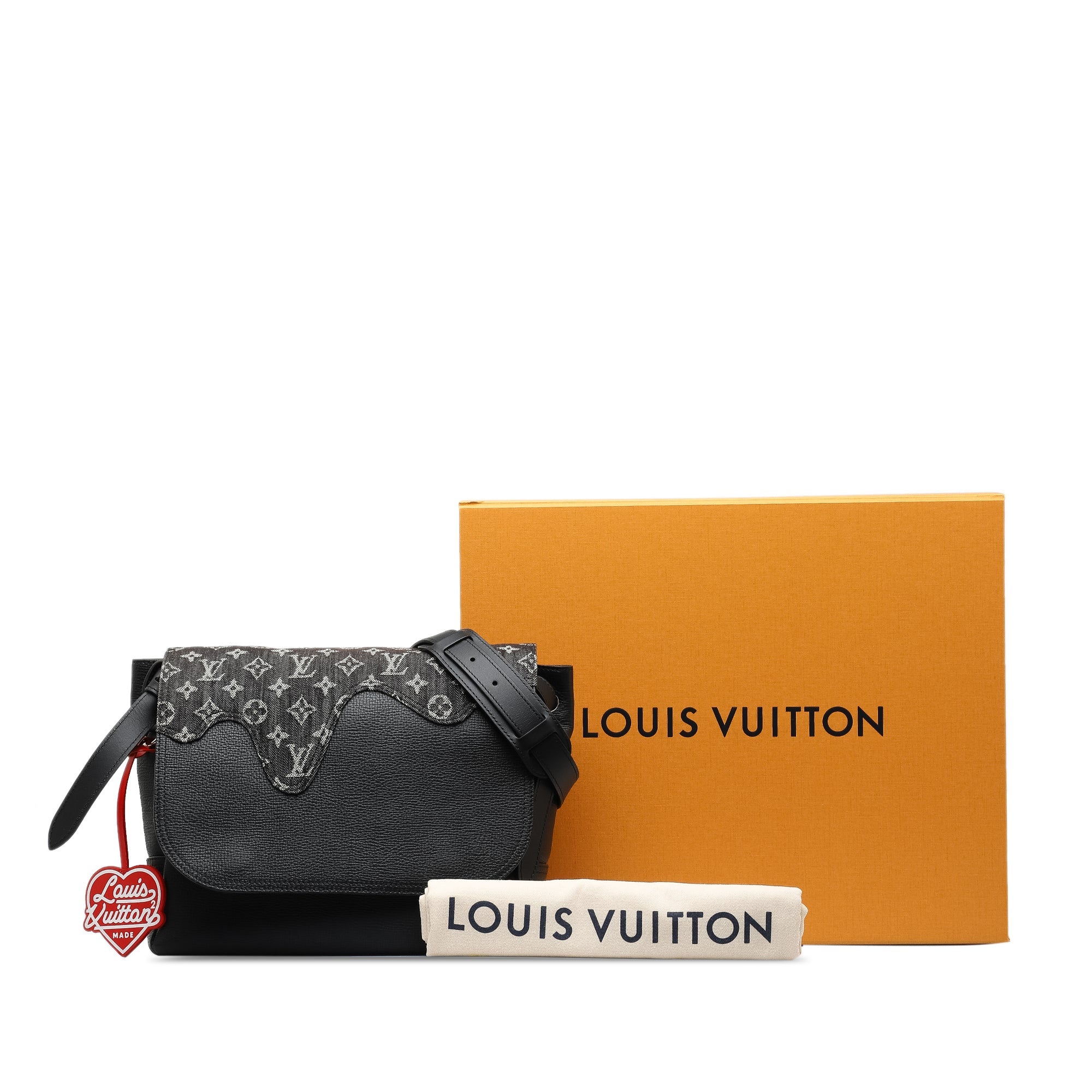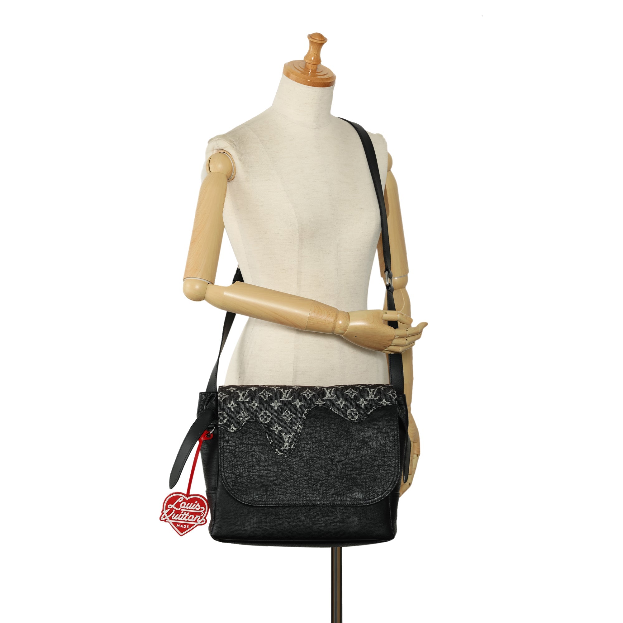 Product Details: Black LV x Nigo Besace Tokyo Monogram Denim Taurillon Messenger Bag. The Nigo Besace Tokyo Messenger Bag features a leather and denim body, a flat and adjustable leather strap, a front flap with magnetic button closure, an exterior zip pocket, and interior slip pockets. 10.2″ L x 11.8″ W x 4.1″ D.
