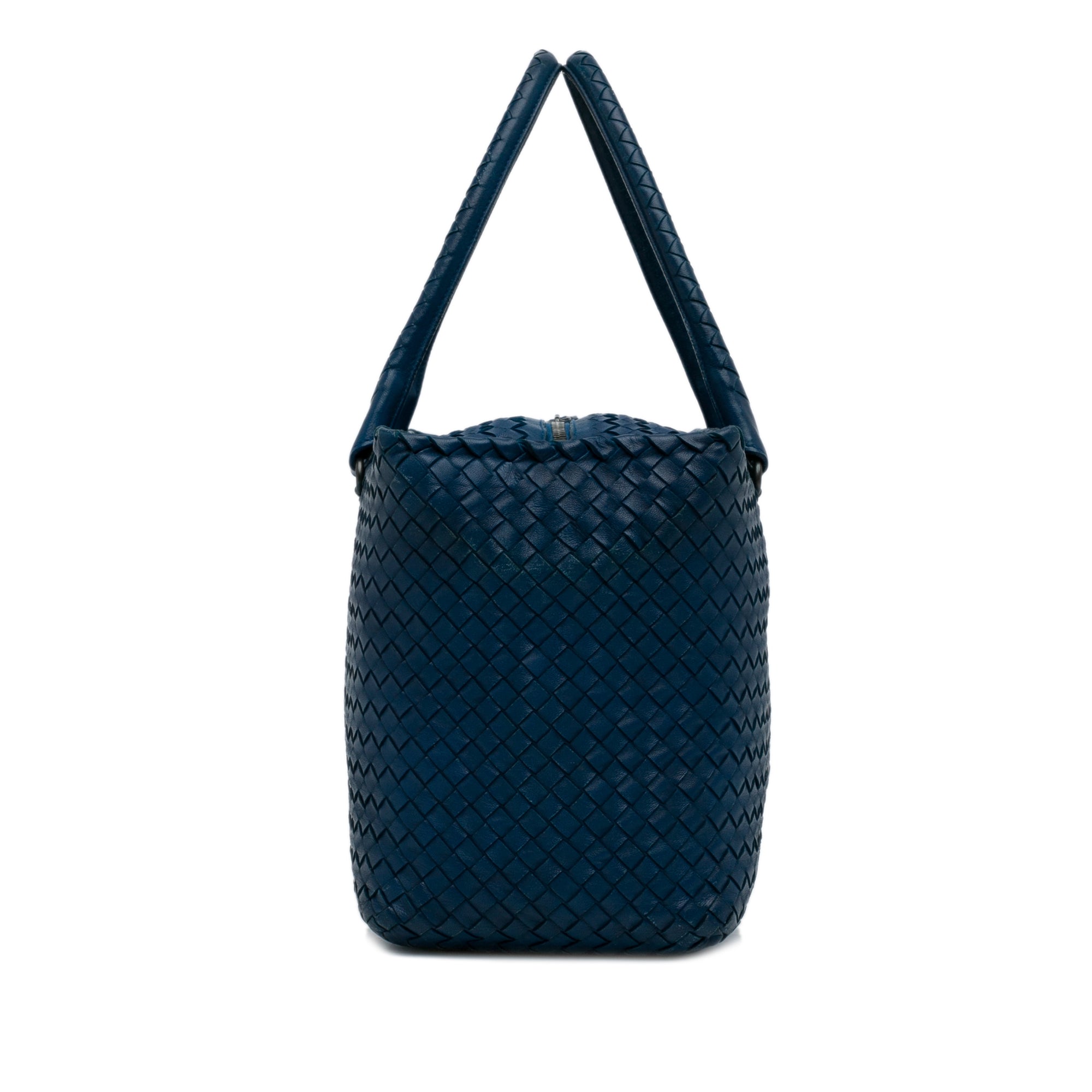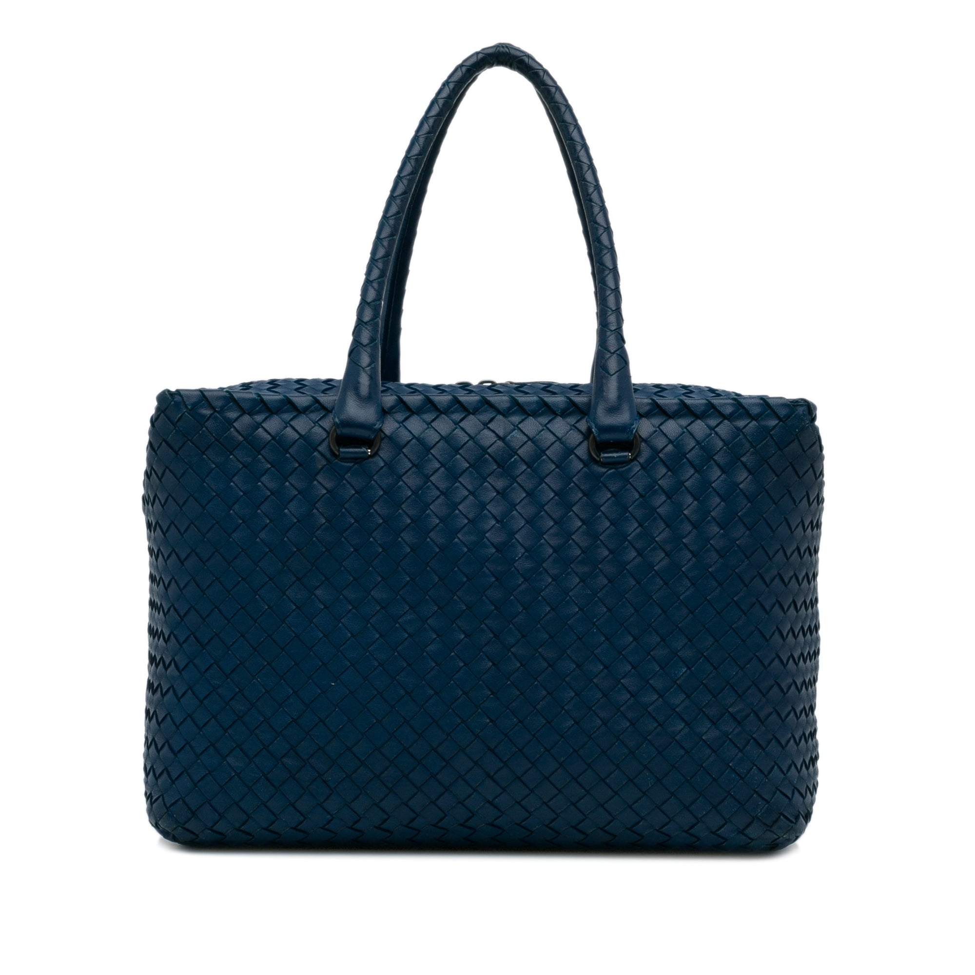 Product Details: Blue Bottega Veneta Intrecciato Tote Bag. This tote bag features a woven leather body, rolled leather handles, a top zip closure, and an interior slip pocket. 9.1″ L x 12.6″ W x 6.3″ D. Serial number B02853578Q.