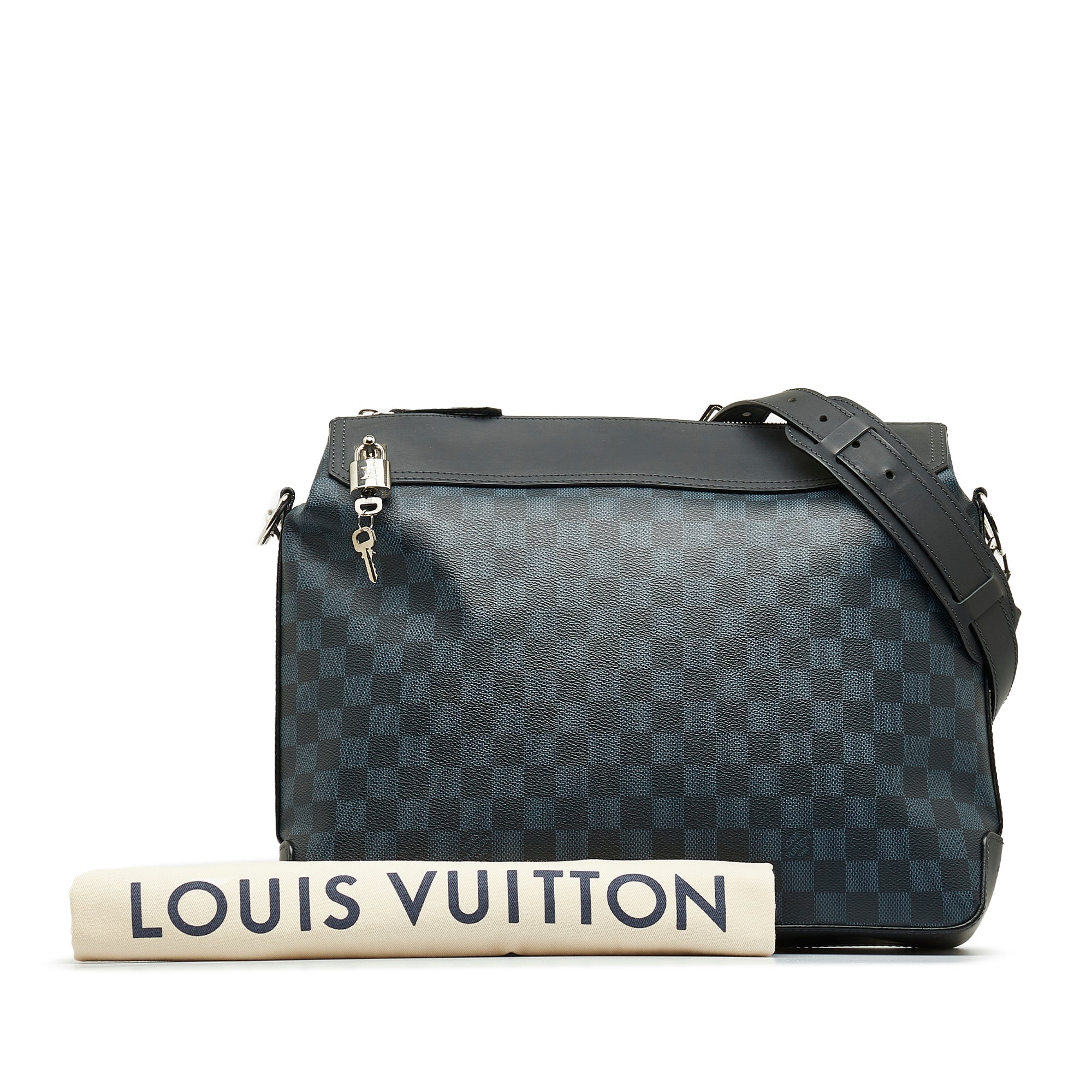 Product Details: Blue LV Damier Cobalt Greenwich Messenger Crossbody Bag. The Greenwich features a damier canvas body with leather top panel, a flat leather strap, a top zip closure, and interior zip and slip pockets. 11.2″ L x 14.6″ W x 3.1″ D. Serial number DR0184.