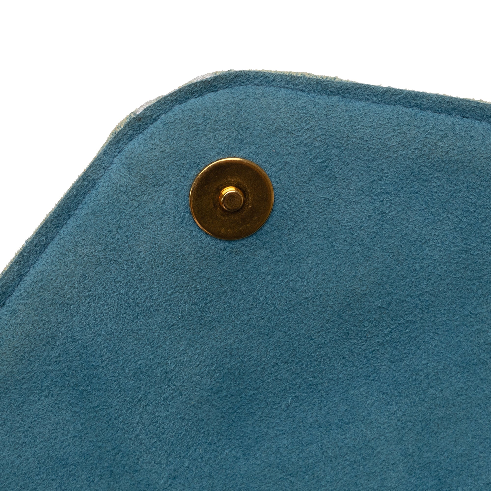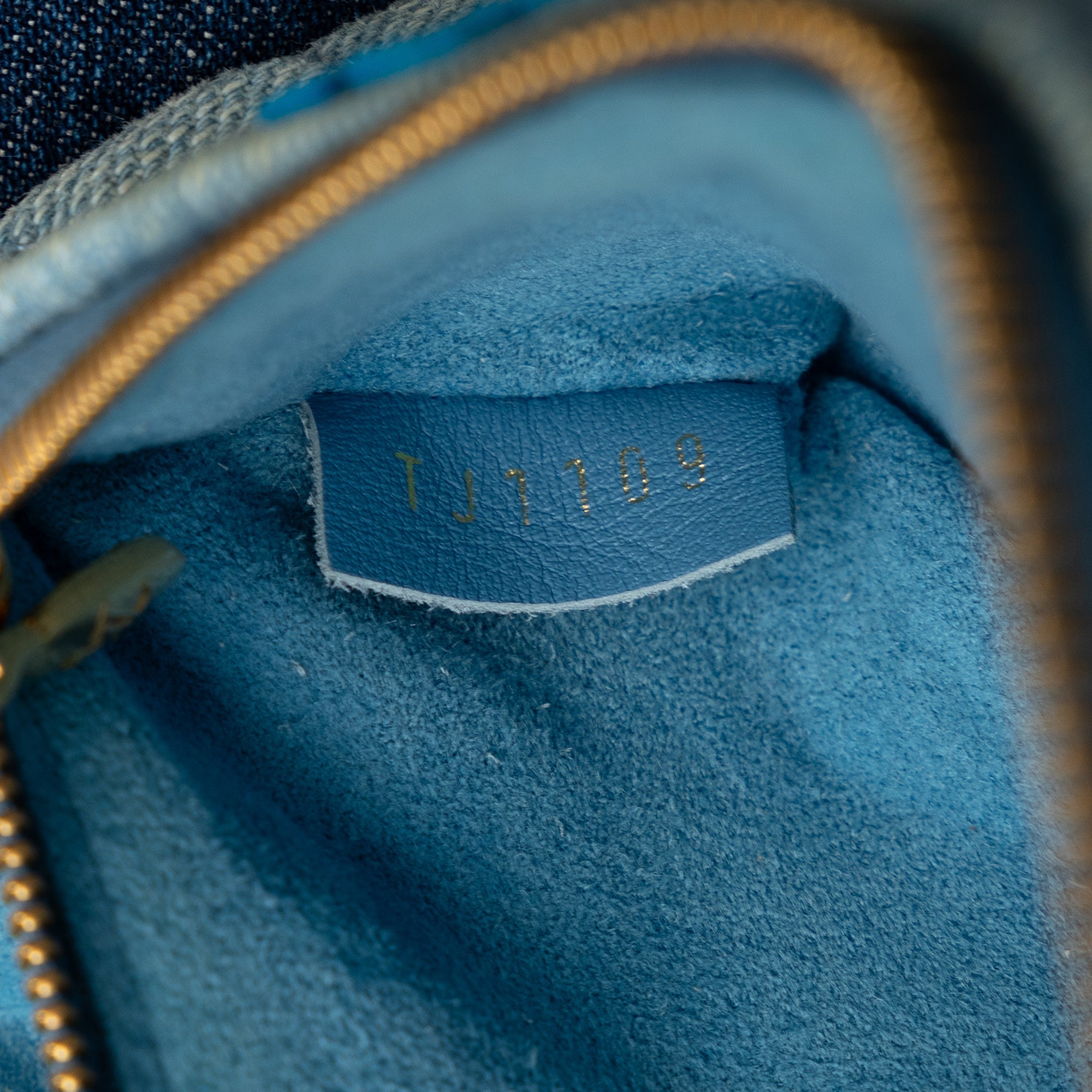 Product Details: Blue LV Embroidered Monogram Denim New Wave Chain Pochette Crossbody Bag. The New Wave Chain features an embroidered monogram denim body with vachetta leather trim, a gold-tone chain link shoulder strap with leather guard, a front flap with magnetic snap closure, and interior zip and slip pockets. 4.3″ L x 7.5″ W x 1.2″ D. Serial number TJ1109.