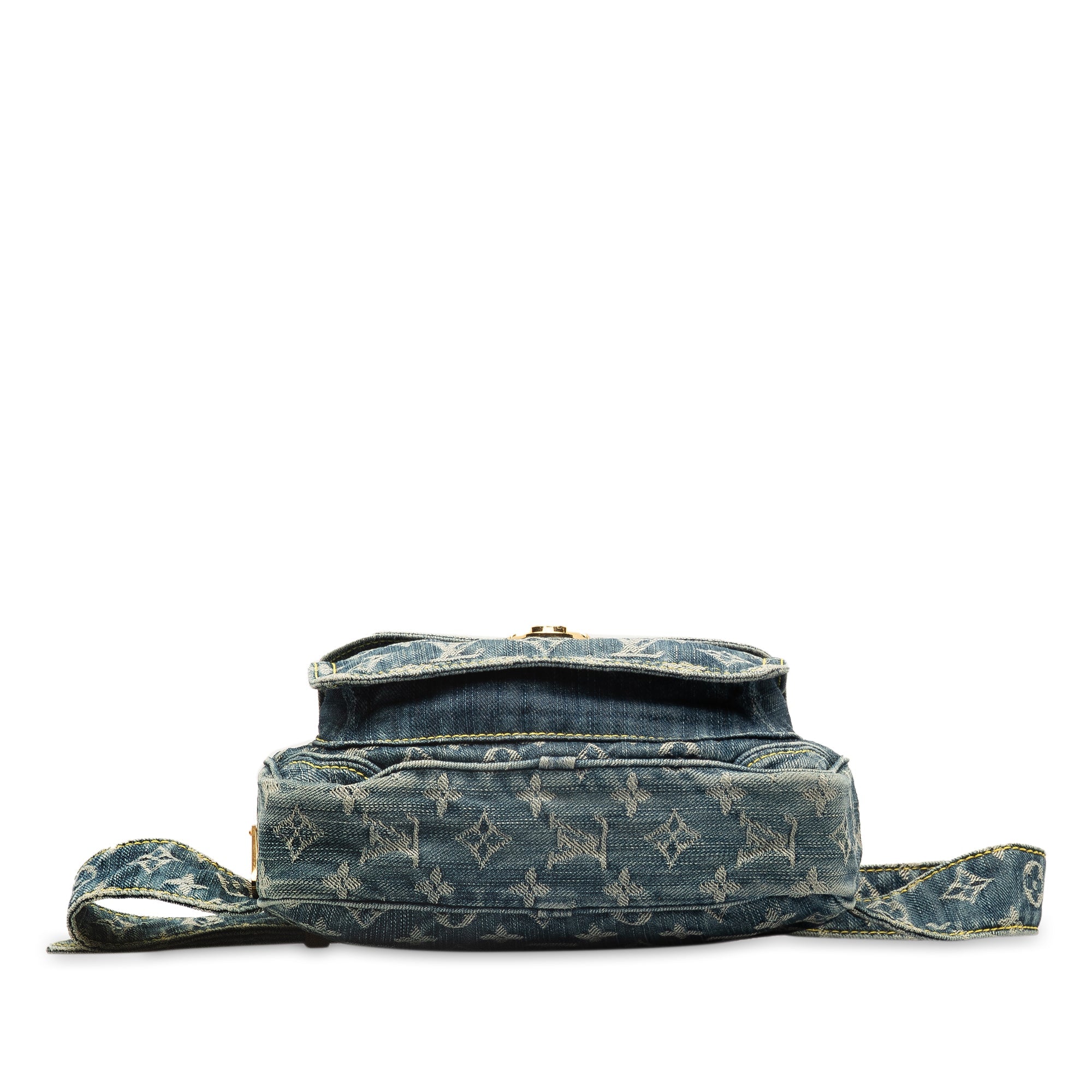 Product Details: Blue LV Monogram Denim Bum Bag. This belt bag features a monogram denim body, an adjustable flat waist strap, a top zip closure, and an exterior flap pocket with metal lock closure. 6.3″ L x 9.1″ W x 2″ D. Serial number SR2007.