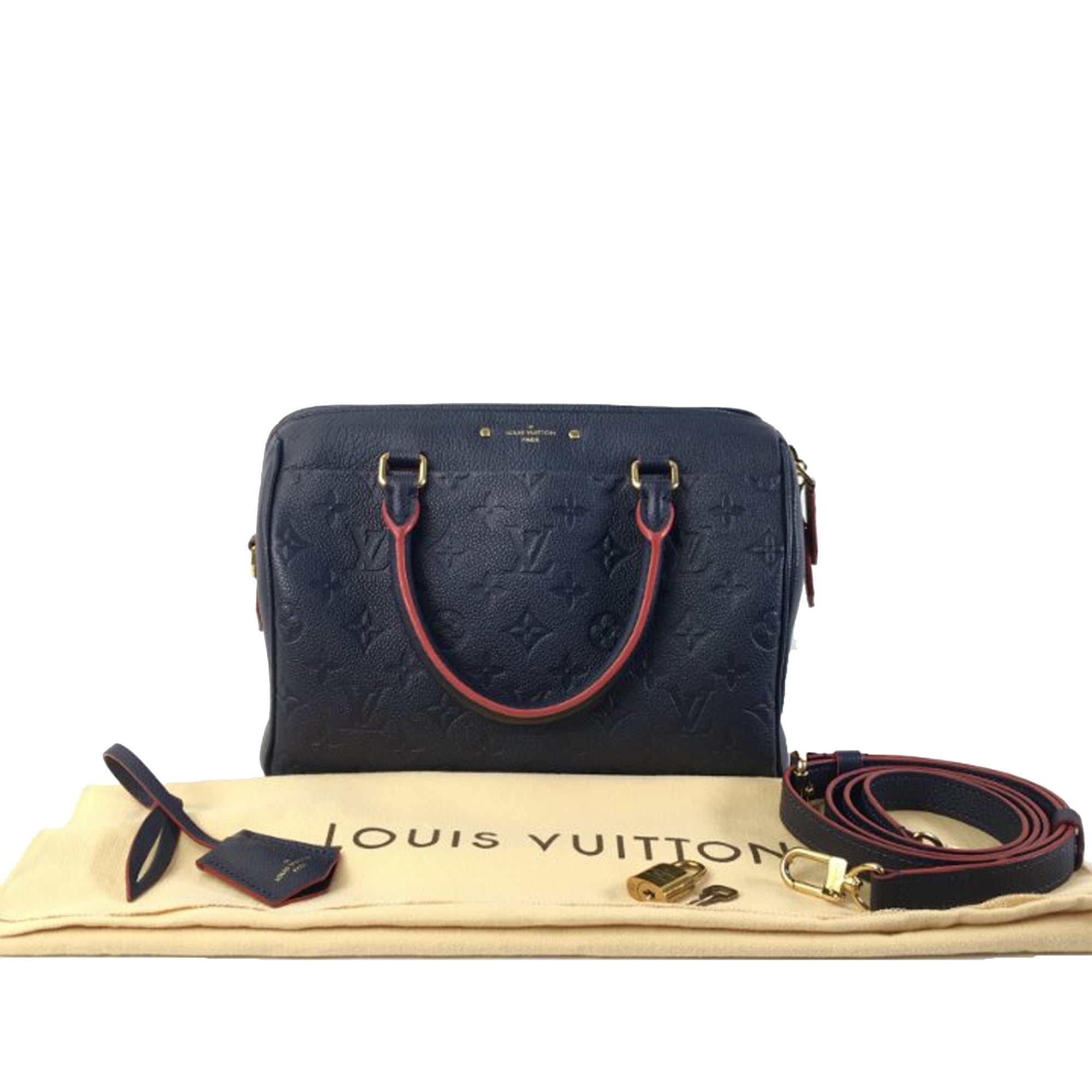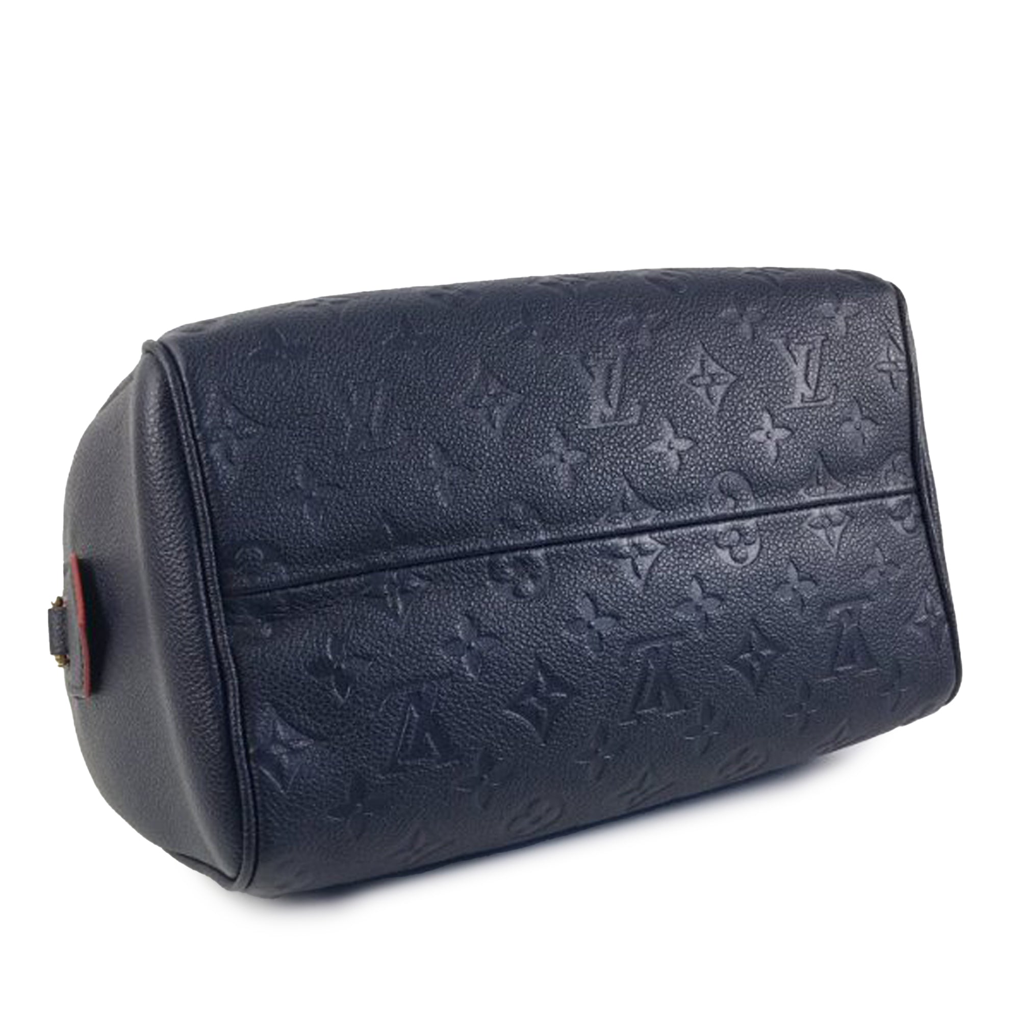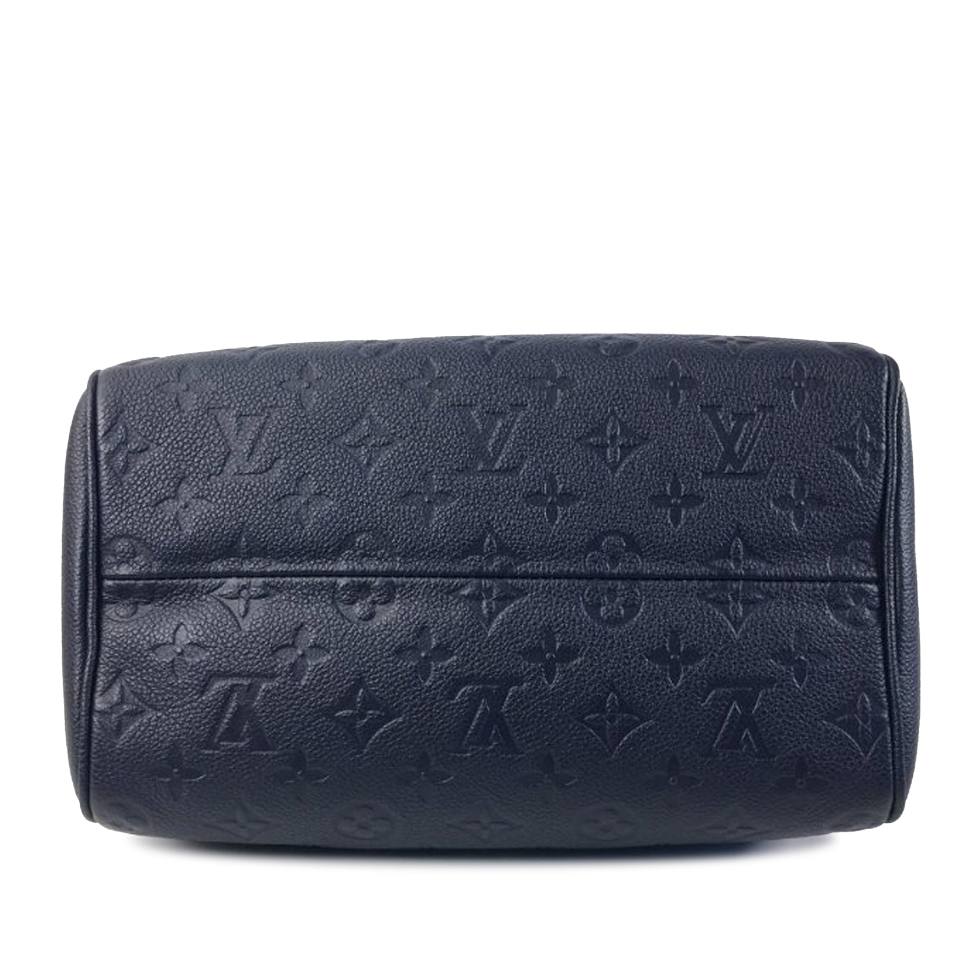 Product Details: Blue LV Monogram Empreinte Speedy Bandouliere 25 Satchel. The Speedy Bandouliere 25 features an empreinte leather body, a top zip closure, rolled leather handles, a detachable flat leather strap, and interior zip and slip pockets. 7.1″ L x 9.8″ W x 5.5″ D, 2.8″ drop. Serial number AR5106.