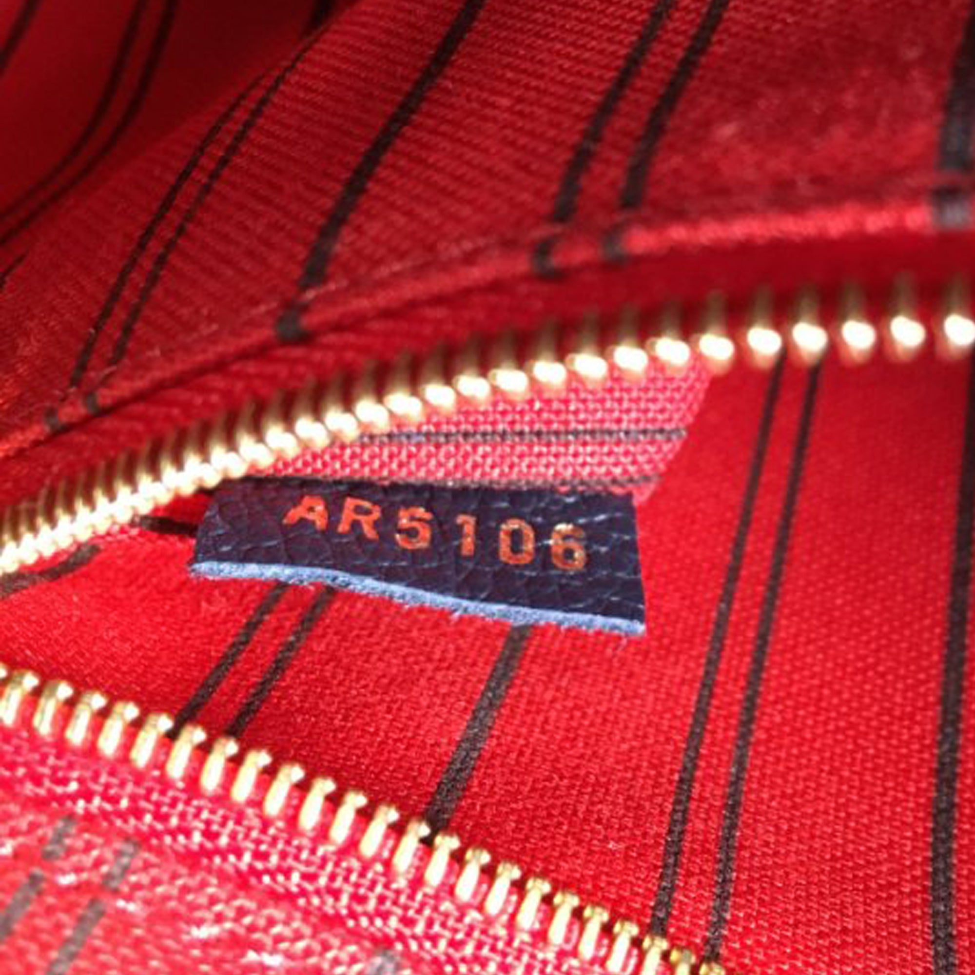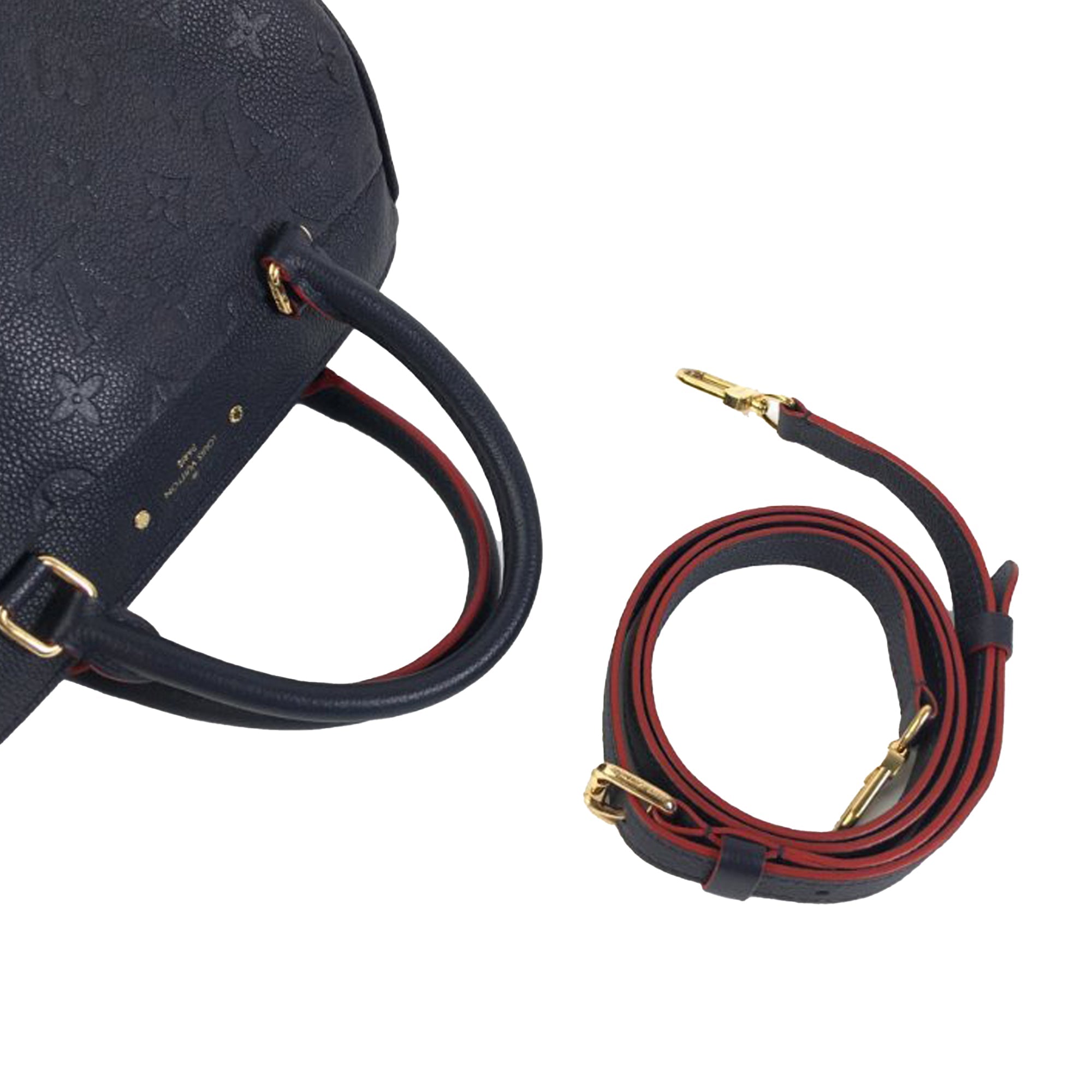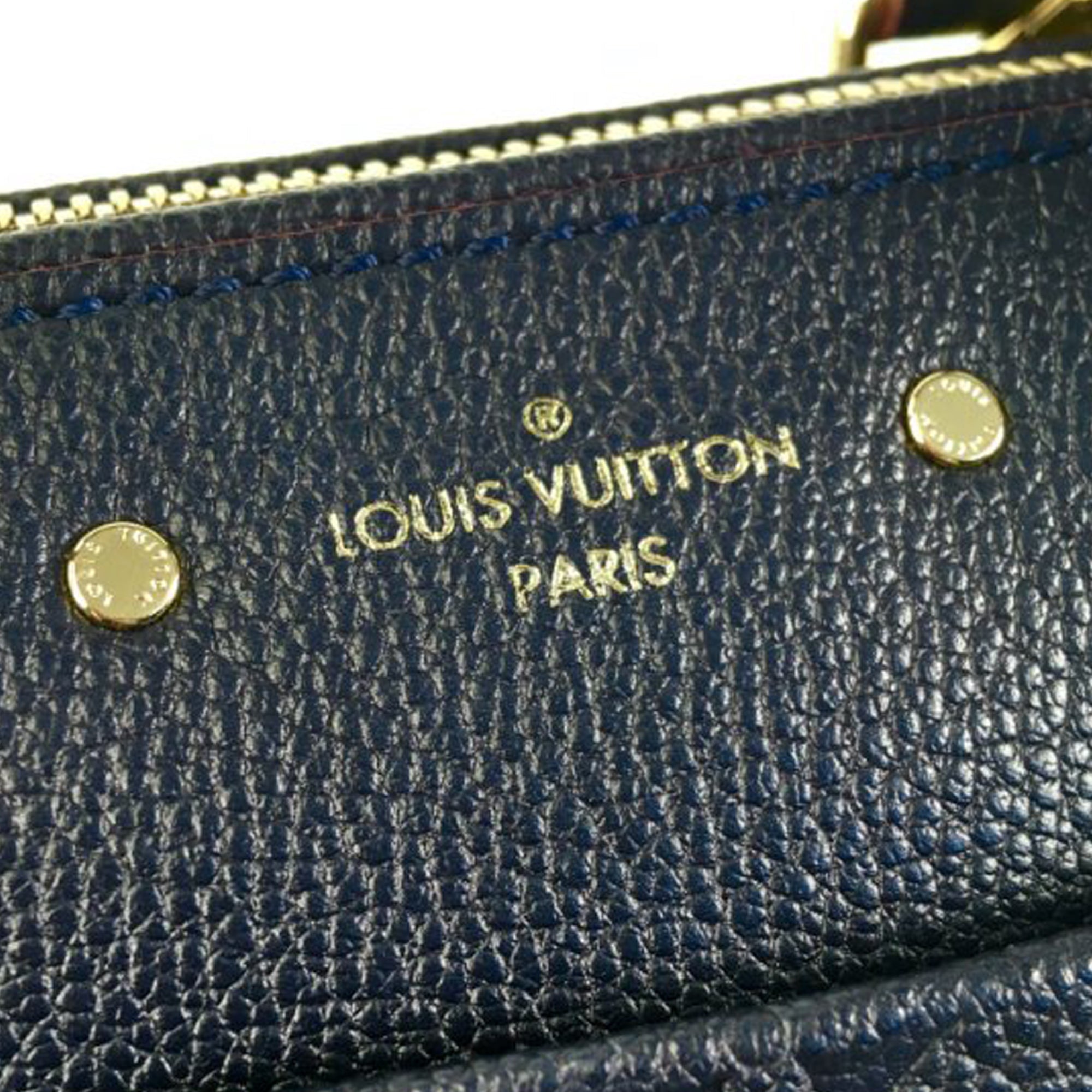 Product Details: Blue LV Monogram Empreinte Speedy Bandouliere 25 Satchel. The Speedy Bandouliere 25 features an empreinte leather body, a top zip closure, rolled leather handles, a detachable flat leather strap, and interior zip and slip pockets. 7.1″ L x 9.8″ W x 5.5″ D, 2.8″ drop. Serial number AR5106.