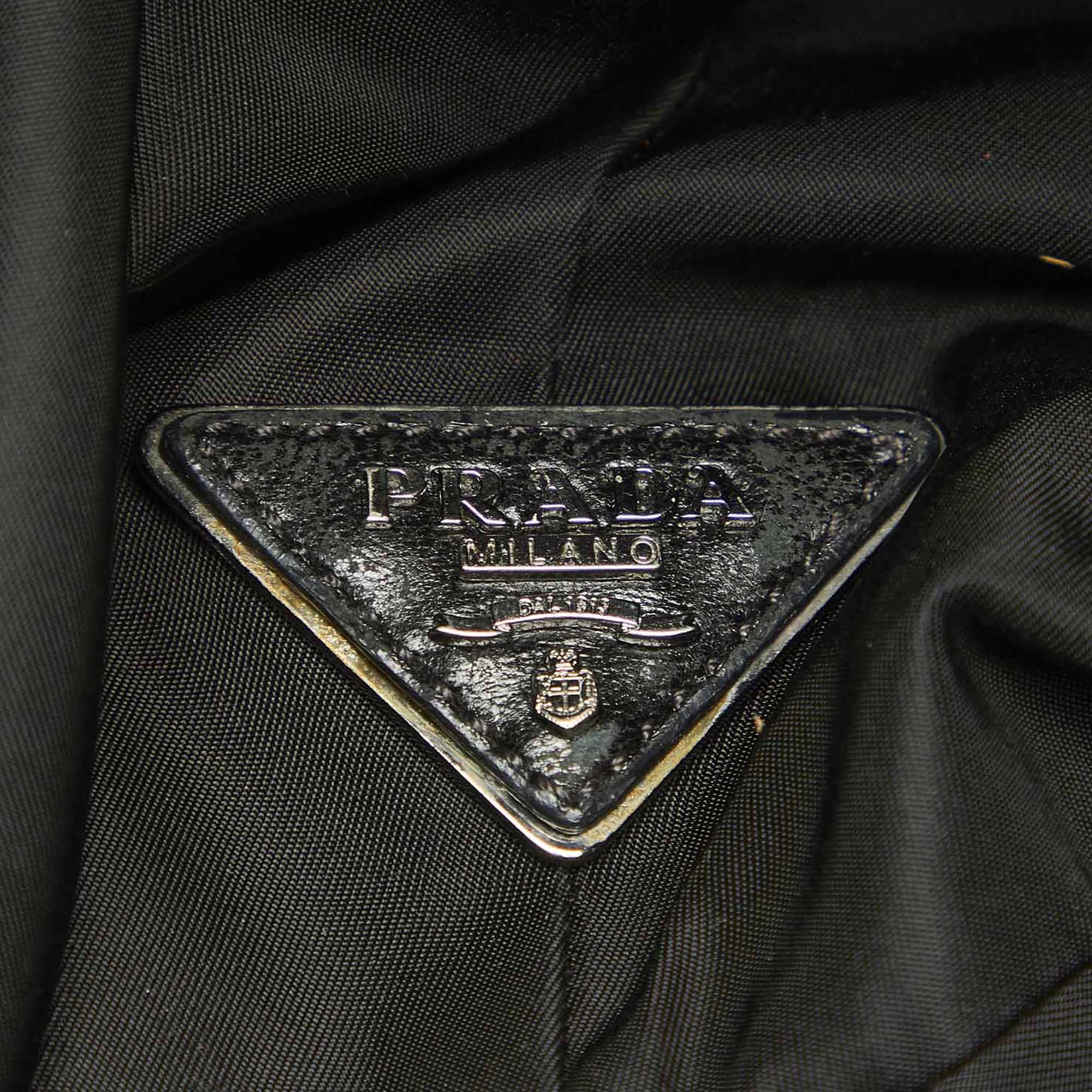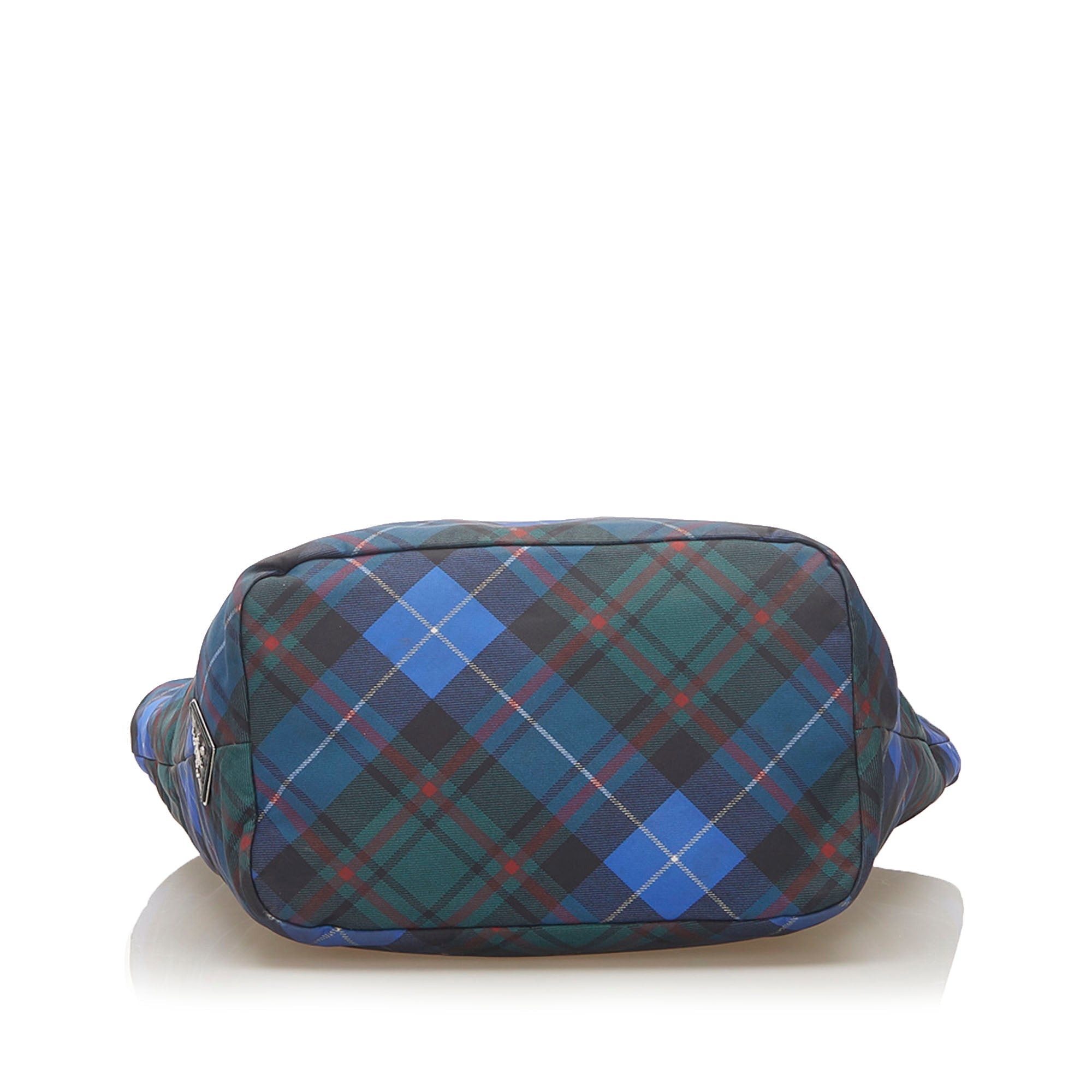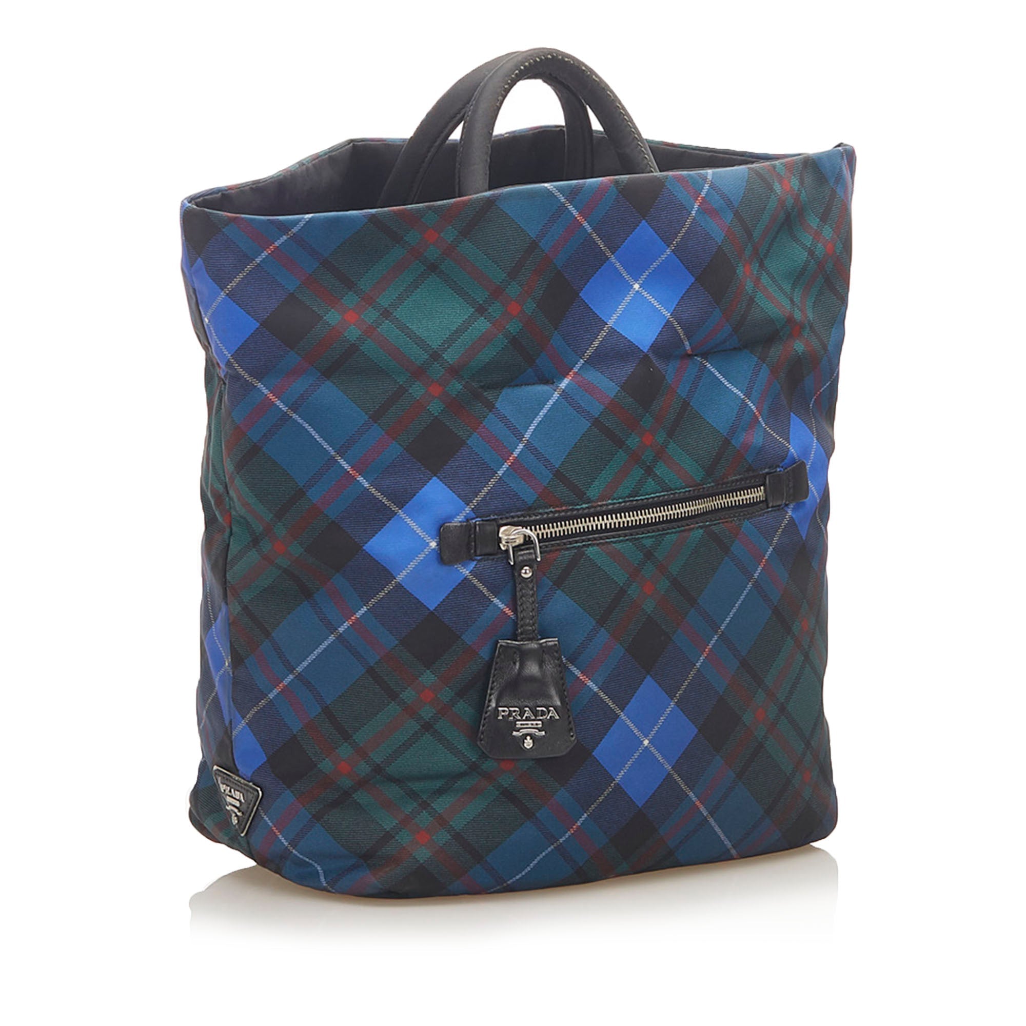 Product Details: Blue Prada Tessuto Reversible Tote Bag. This tote bag features a nylon body, rolled handles, an open top, and an interior zip pocket. 12.2″ L x 15.7″ W x 7.1″ D.