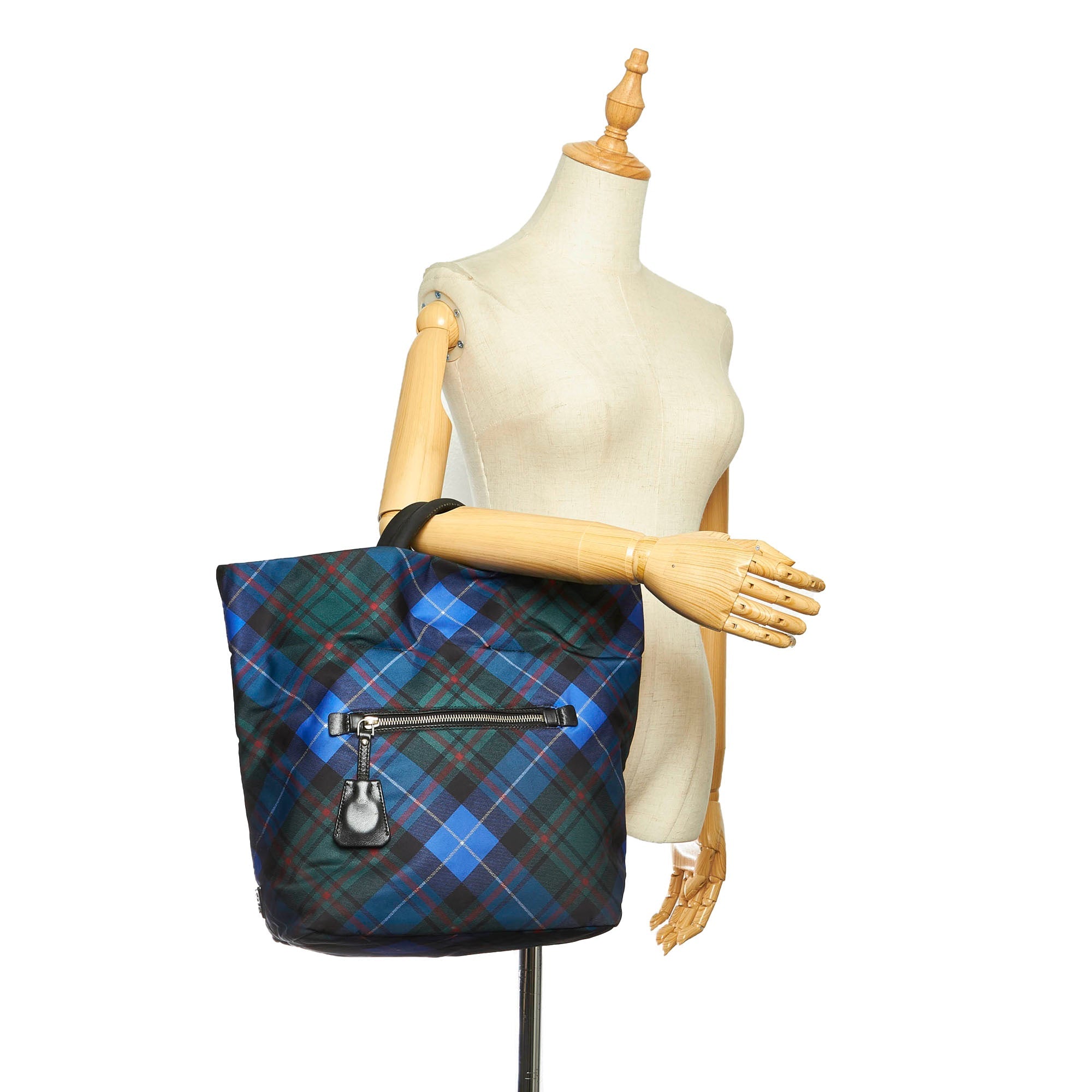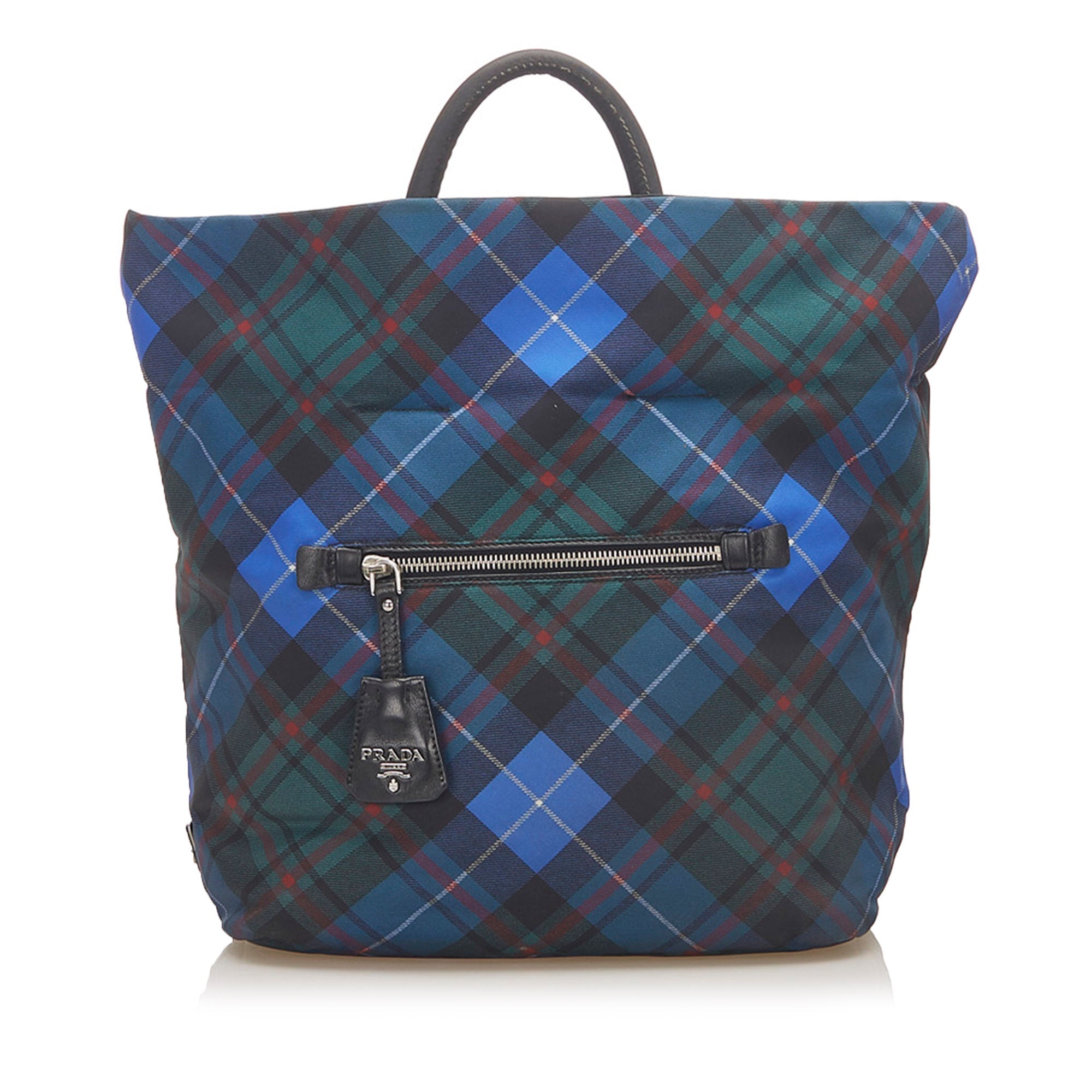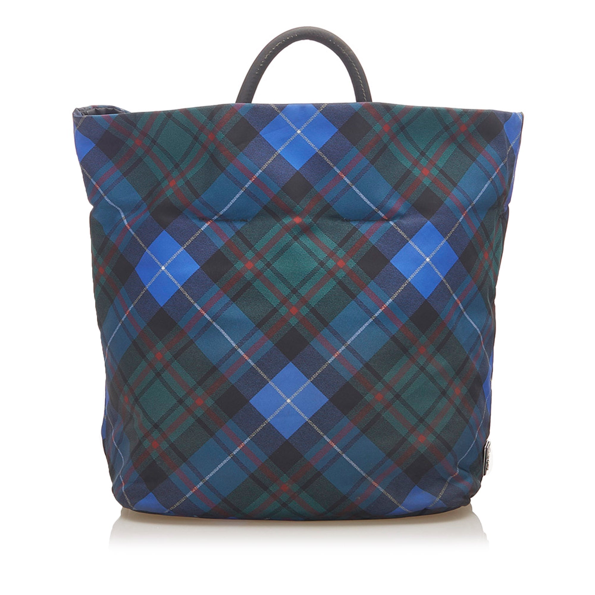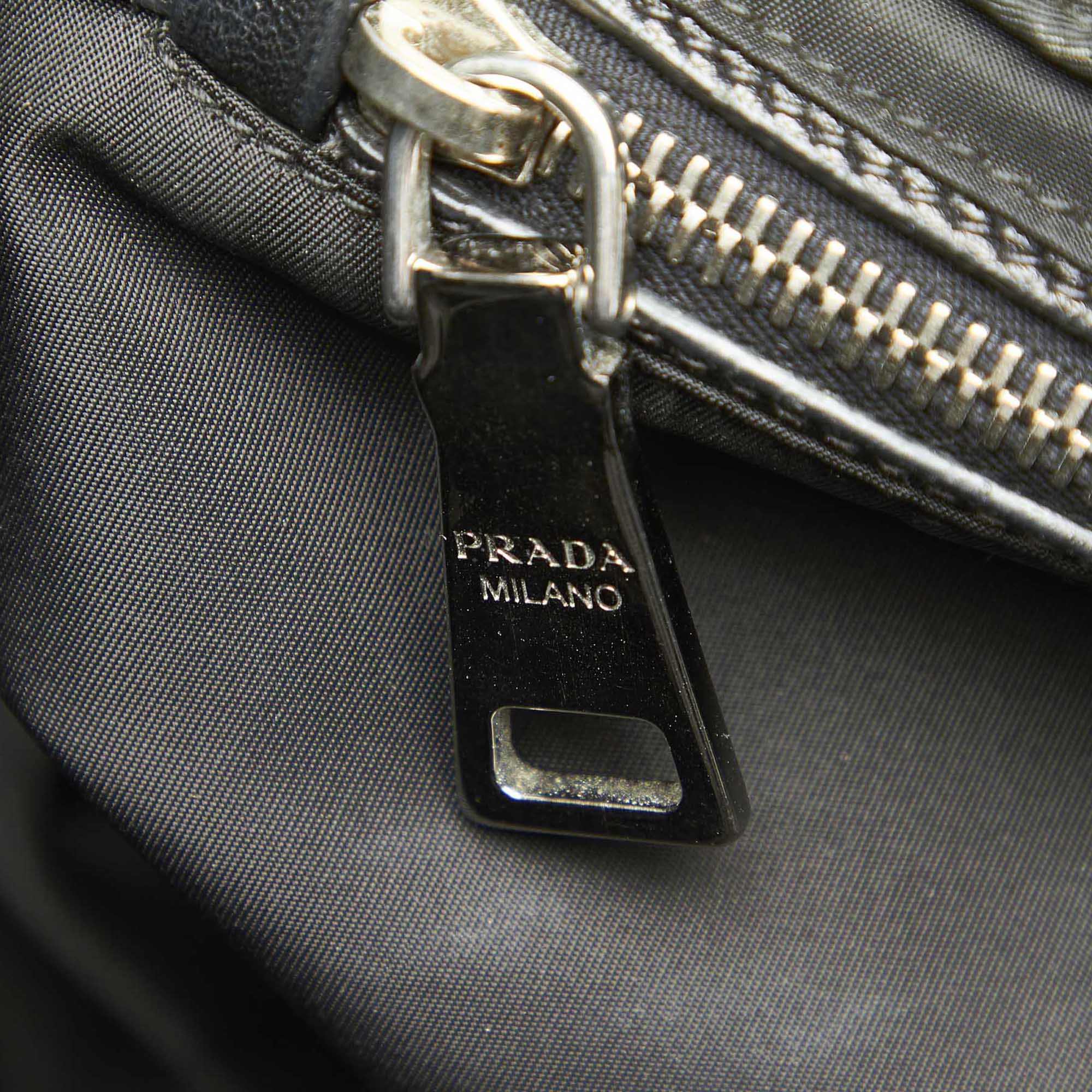 Product Details: Blue Prada Tessuto Reversible Tote Bag. This tote bag features a nylon body, rolled handles, an open top, and an interior zip pocket. 12.2″ L x 15.7″ W x 7.1″ D.