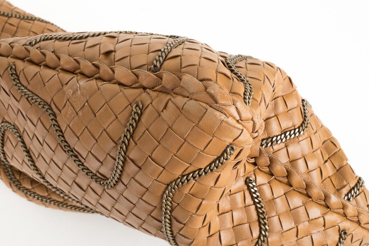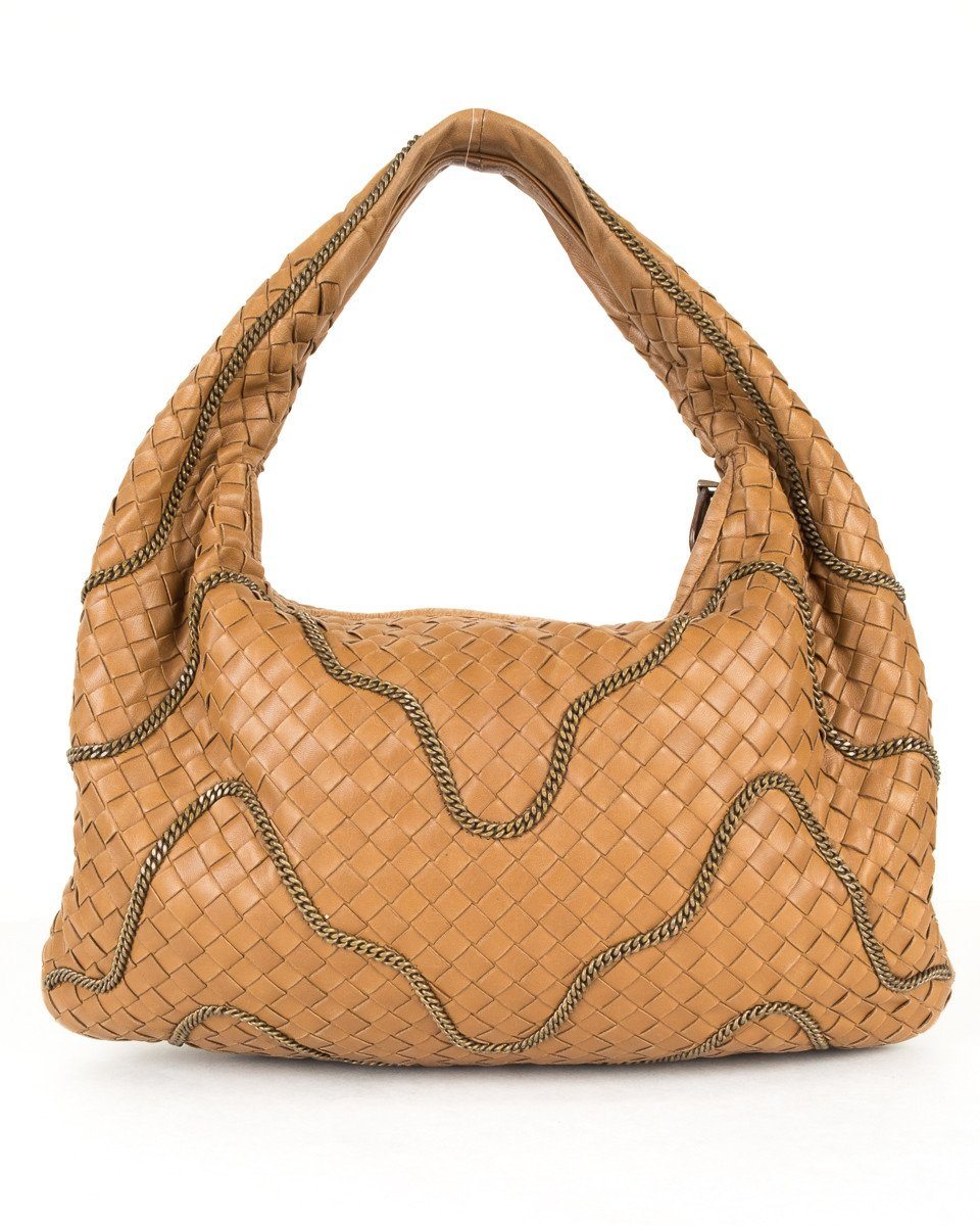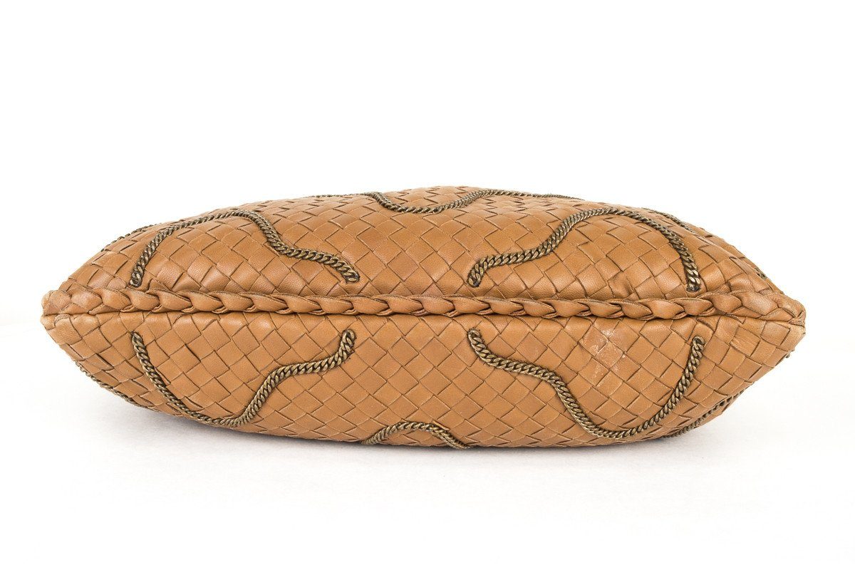 Bottega Veneta brown Intrecciato Woven Nappa Chain Hobo Bag with gold-tone chain detail throughout, and zip closure at opening. Tan suede lining with single interior zip closure pocket.
