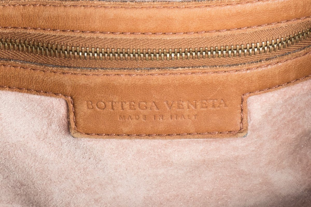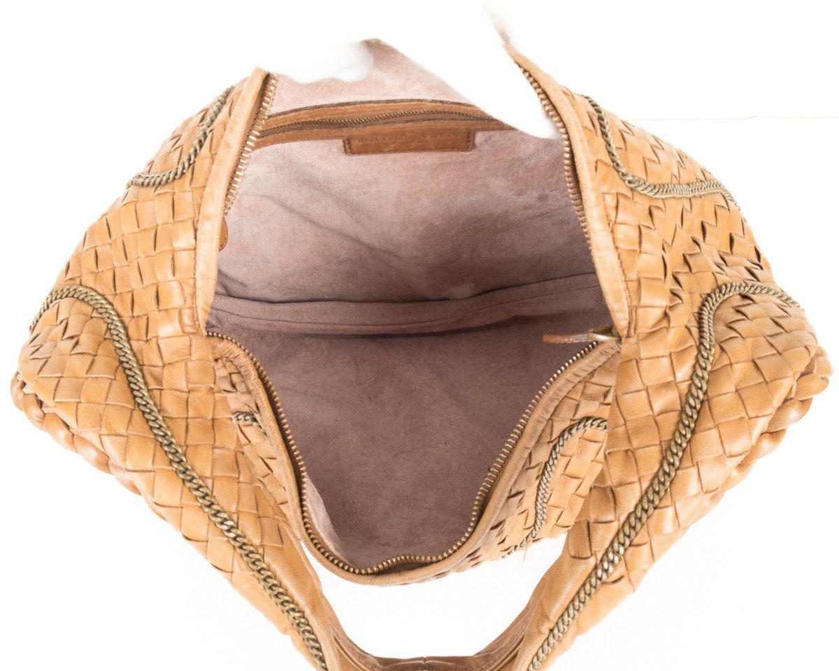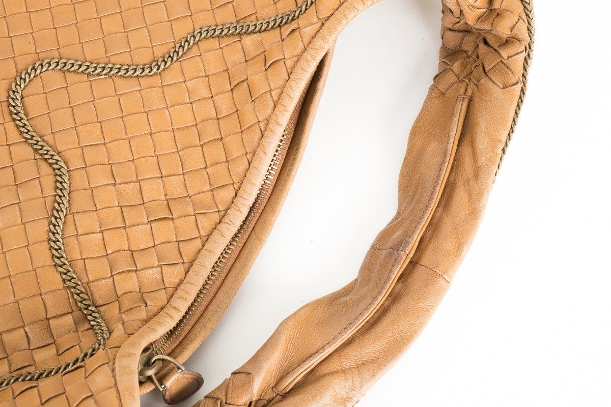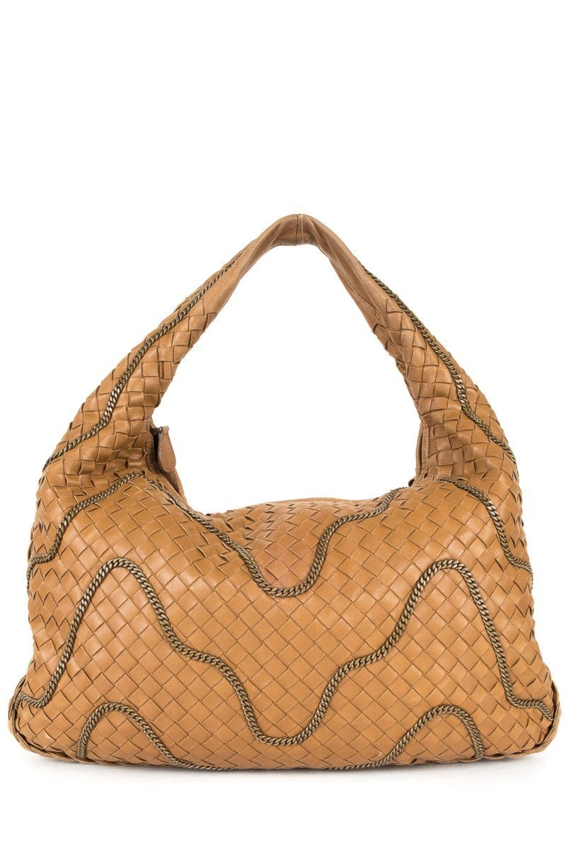 Bottega Veneta brown Intrecciato Woven Nappa Chain Hobo Bag with gold-tone chain detail throughout, and zip closure at opening. Tan suede lining with single interior zip closure pocket.
