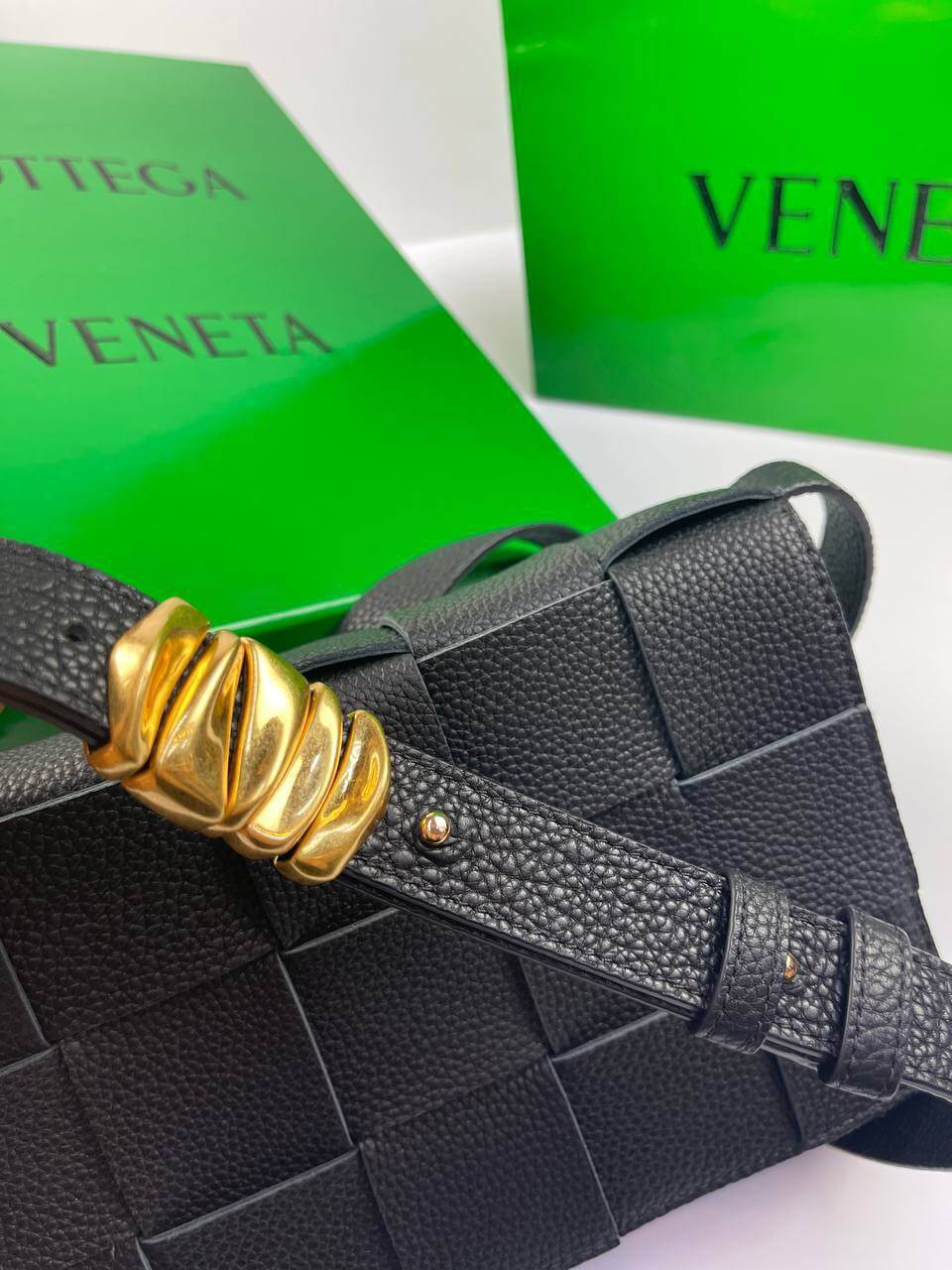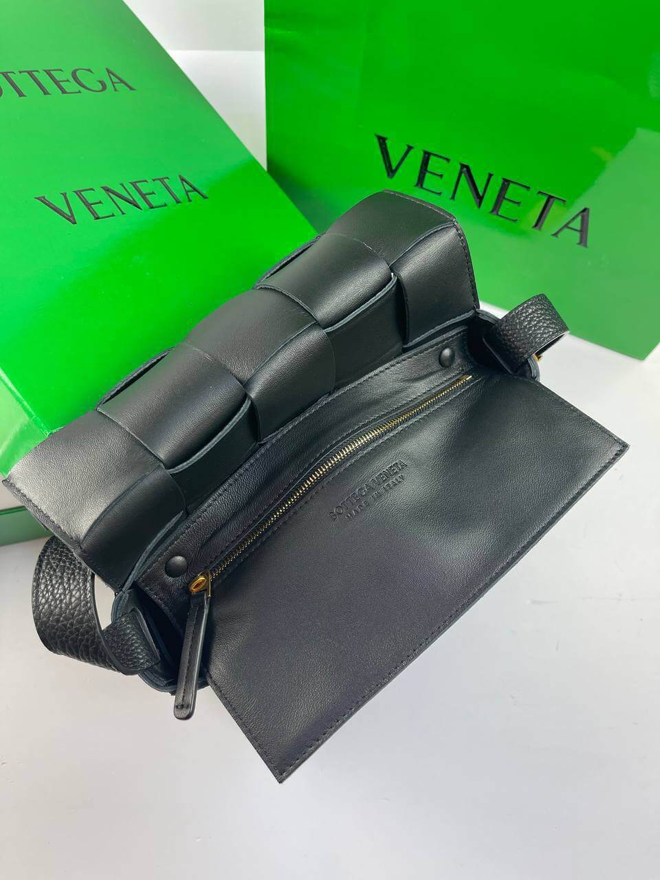 The black Cassette bag is a universal soldier. During the day it can be worn as a crossbody, and in the evening you can remove the wide belt with a branded triangular buckle and use it as a clutch. The rectangular item was made using the brand’s signature intrecciato technique from wide strips of soft matte leather. Comes with matching cosmetic case. The main compartment holds your phone, wallet and keys.