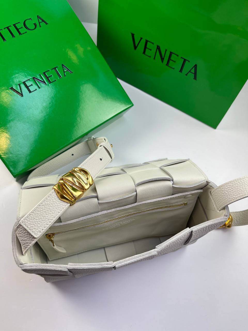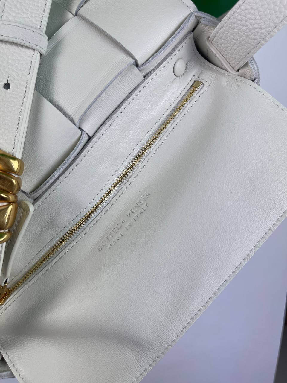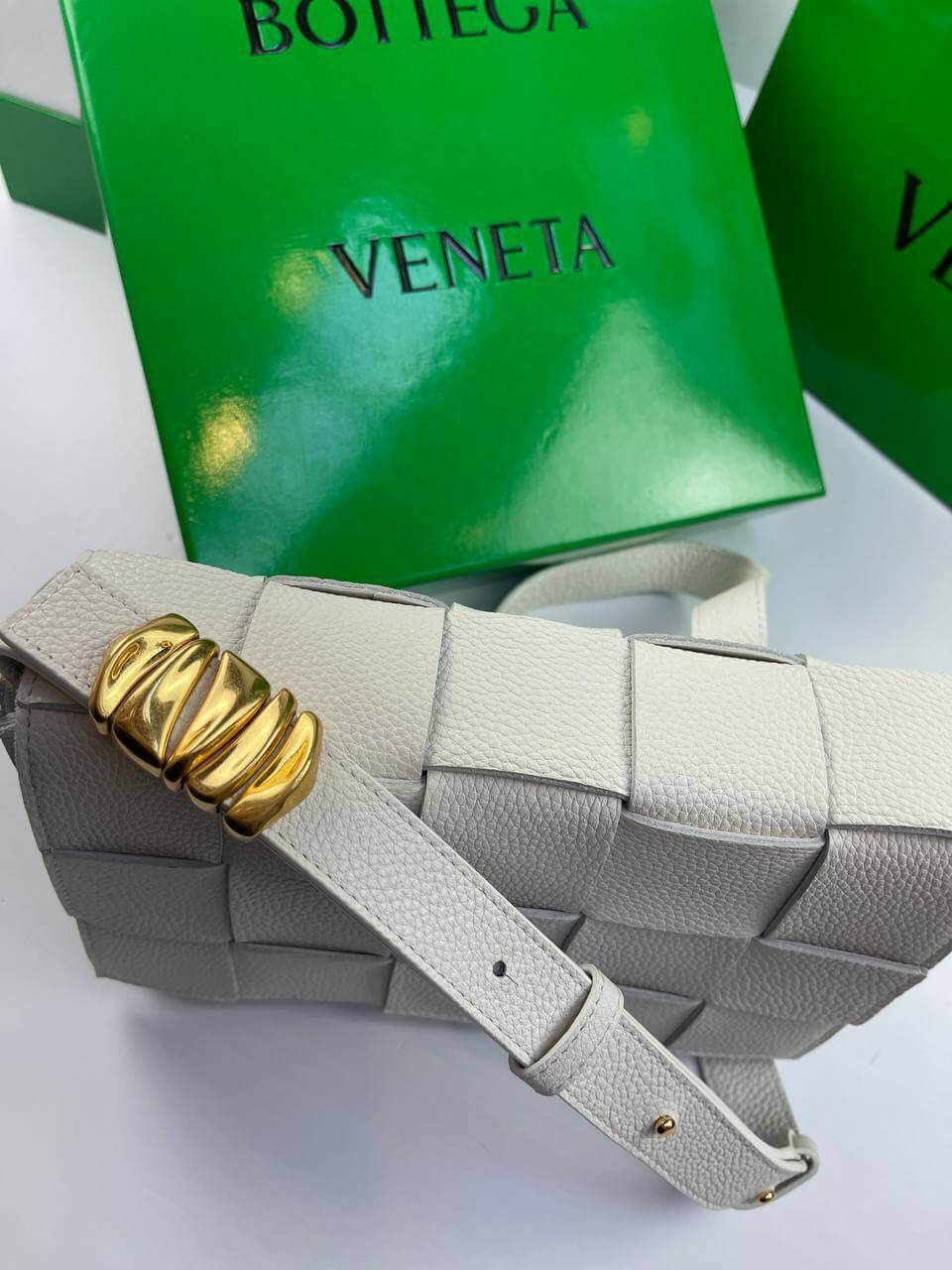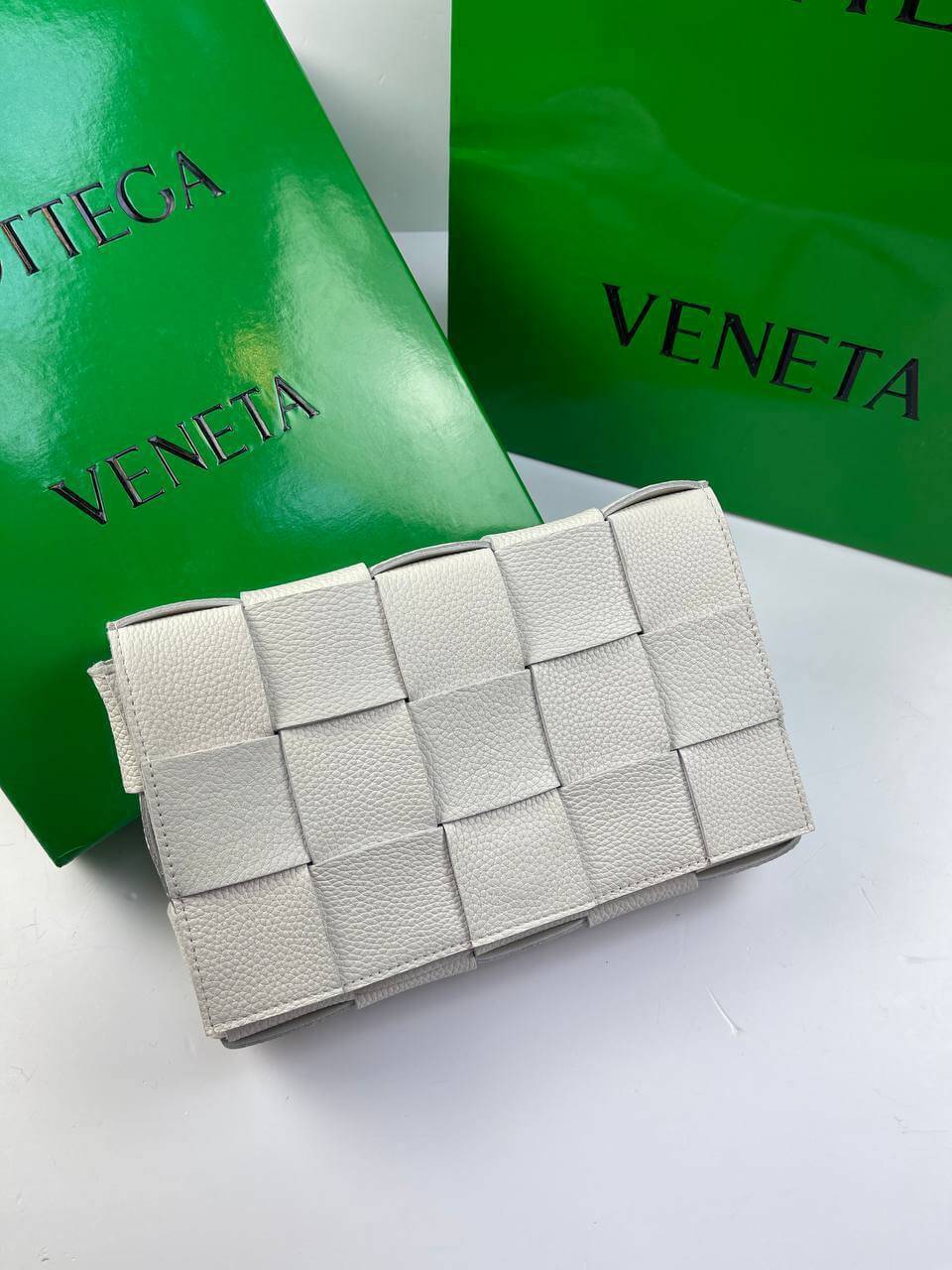 The white Cassette bag is a universal soldier. During the day it can be worn as a crossbody, and in the evening you can remove the wide belt with a branded triangular buckle and use it as a clutch. The rectangular item was made using the brand’s signature intrecciato technique from wide strips of soft matte leather. Comes with matching cosmetic case. The main compartment holds your phone, wallet and keys.