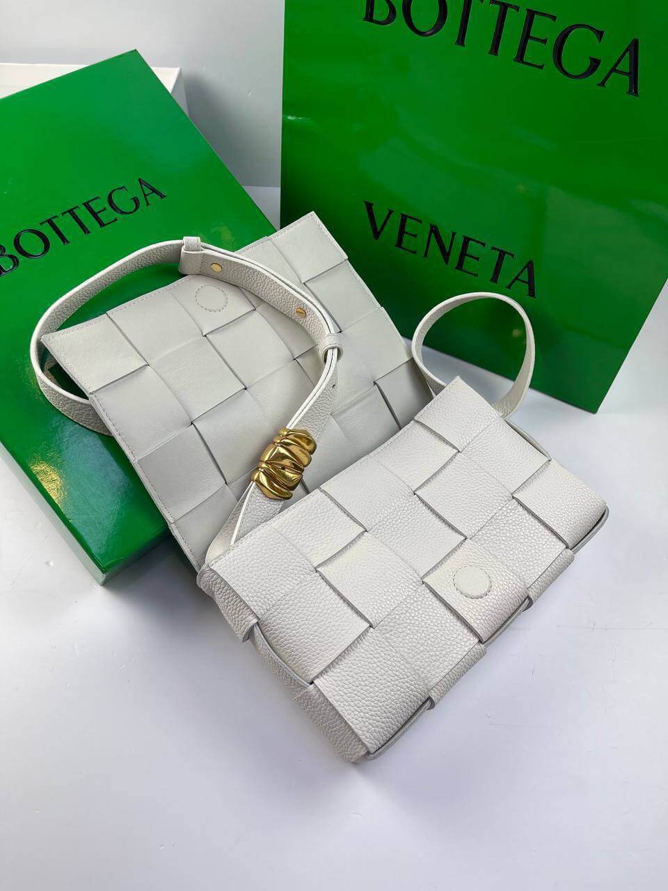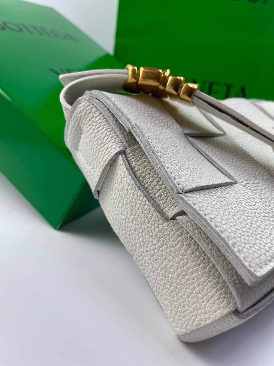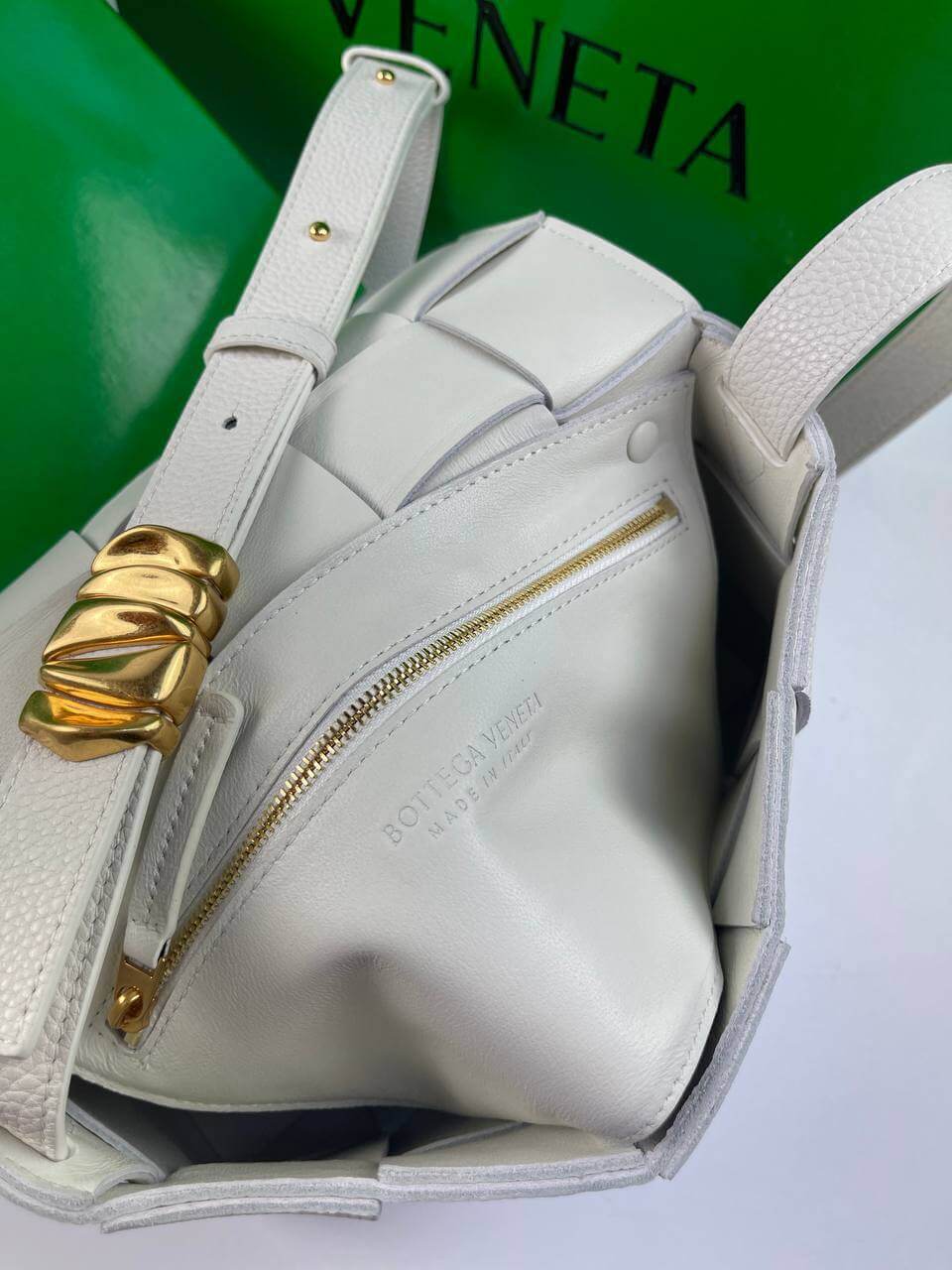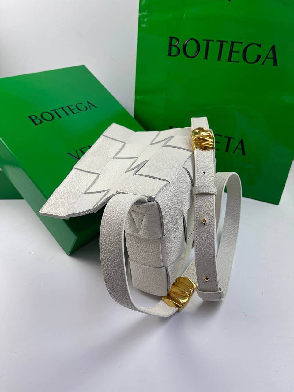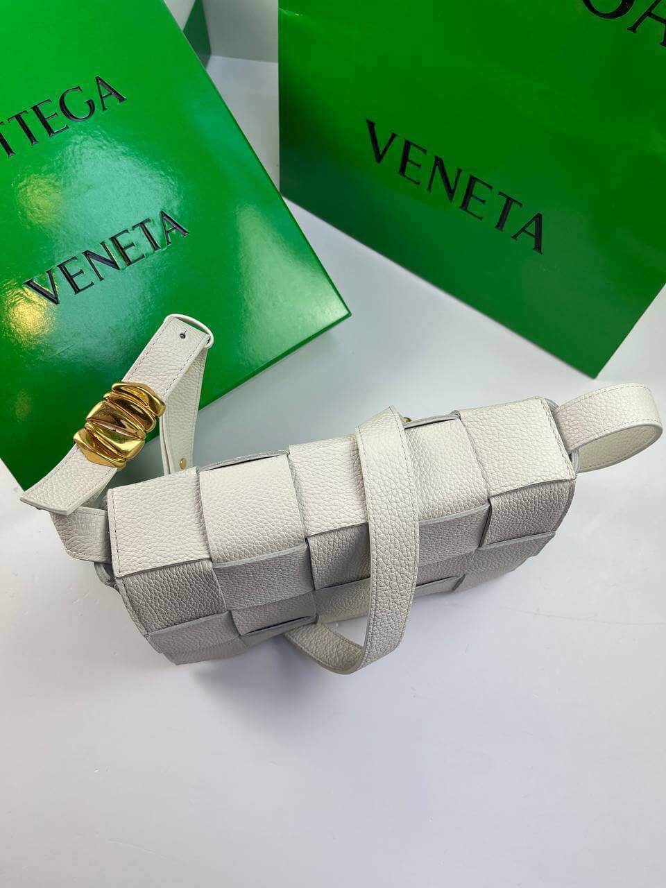 The white Cassette bag is a universal soldier. During the day it can be worn as a crossbody, and in the evening you can remove the wide belt with a branded triangular buckle and use it as a clutch. The rectangular item was made using the brand’s signature intrecciato technique from wide strips of soft matte leather. Comes with matching cosmetic case. The main compartment holds your phone, wallet and keys.