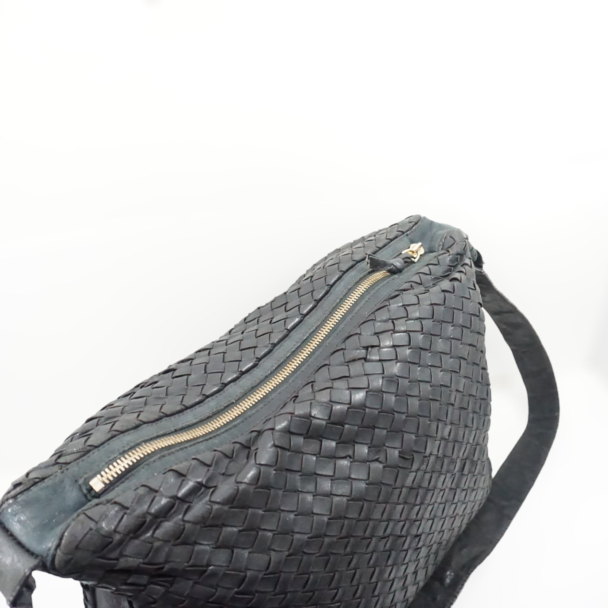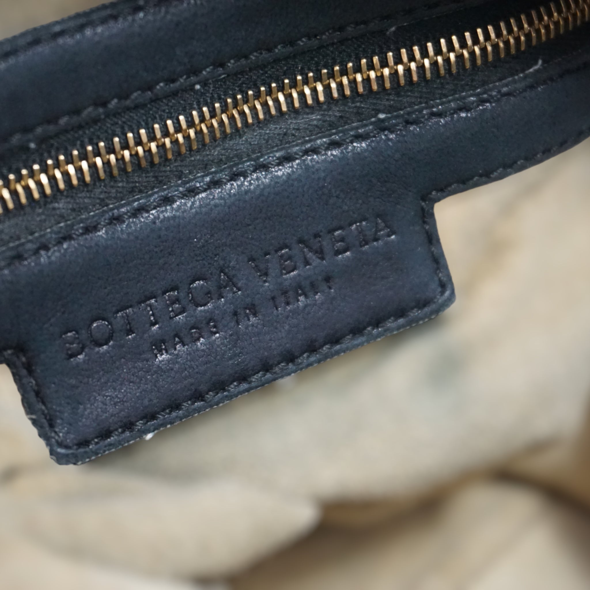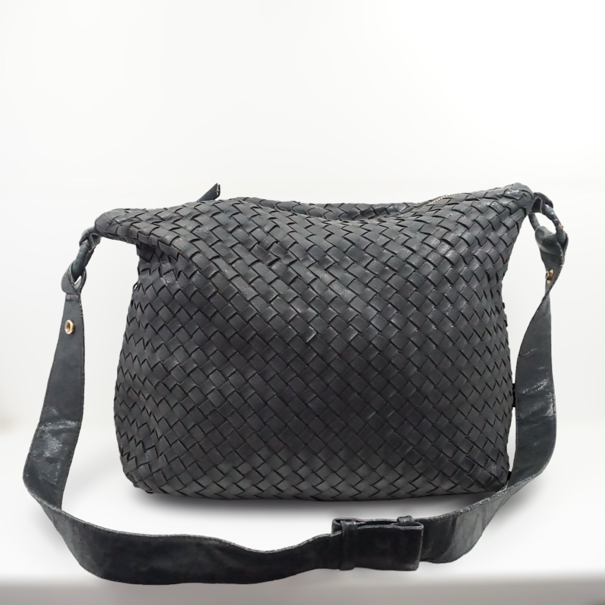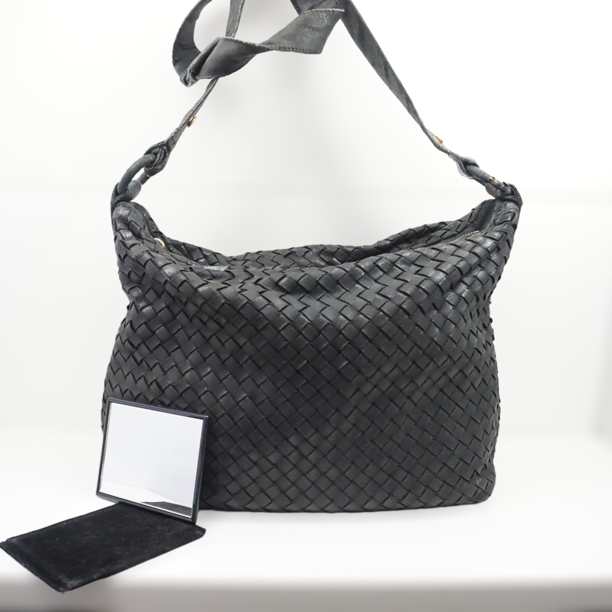 Smuk Bottega Veneta Crossbodytaske i sort flettet kalveskind. Skulderemmen kan justeres sĂĄ tasken kan anvendes som alm skuldertaske. Tasken kommer med spejl fra Bottega Venta