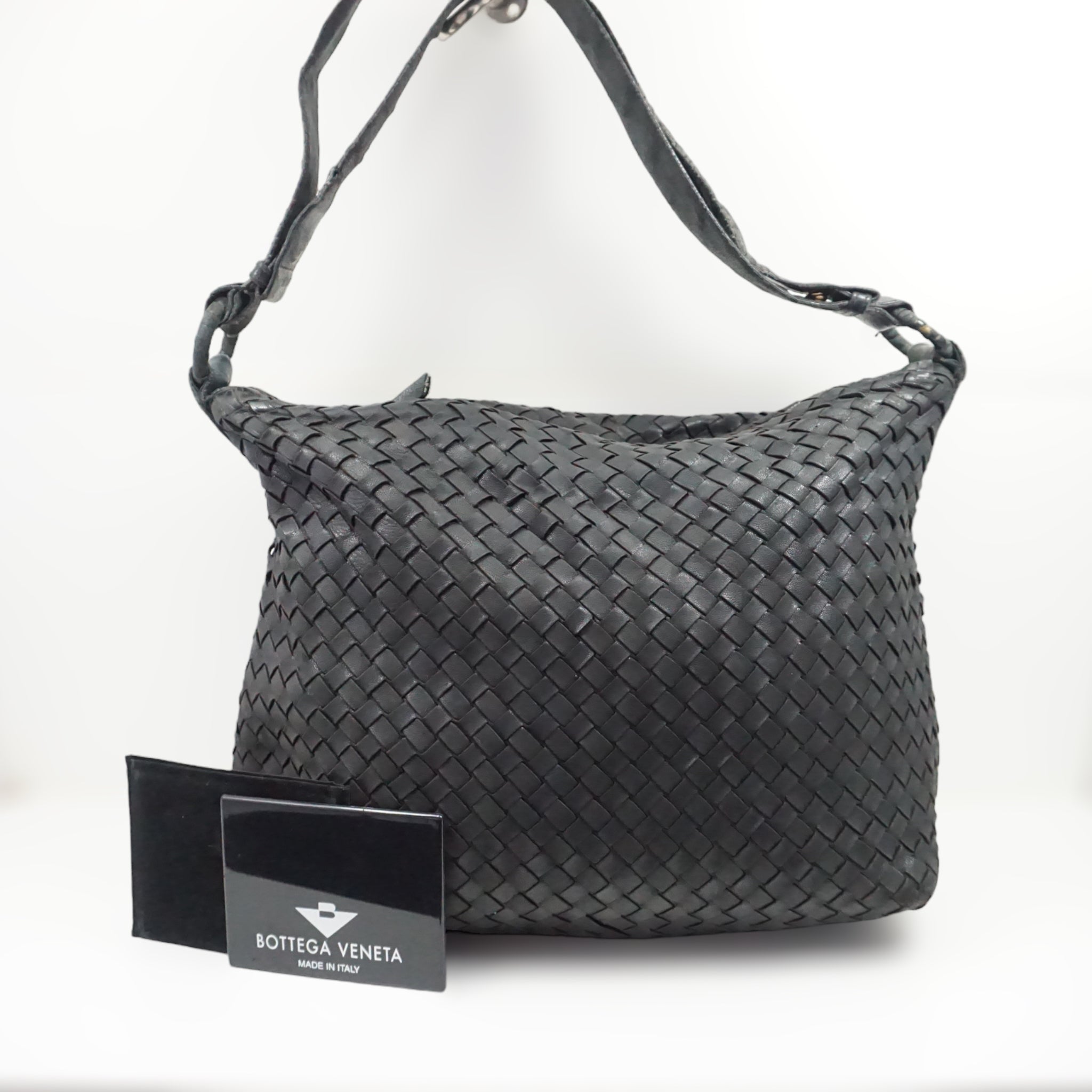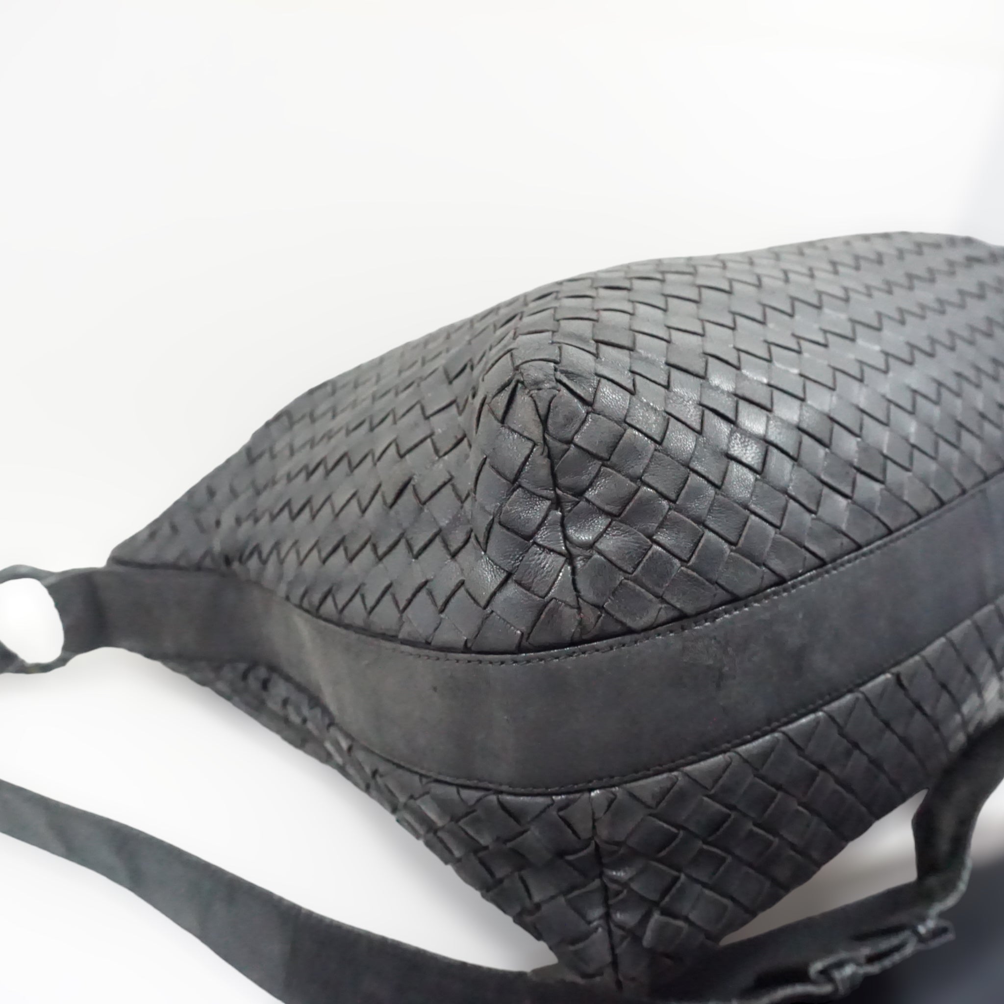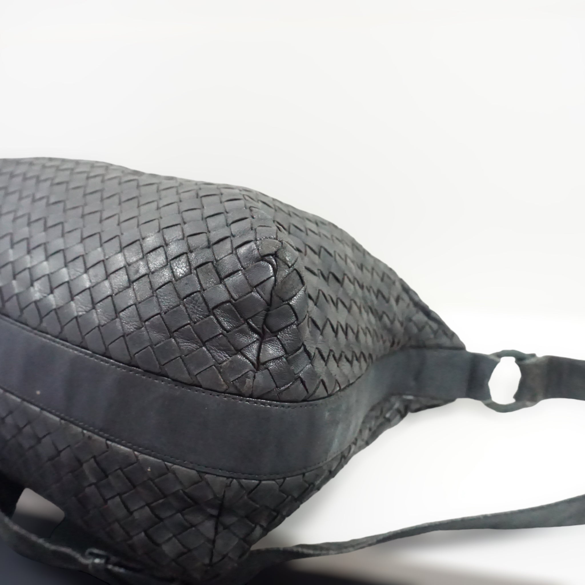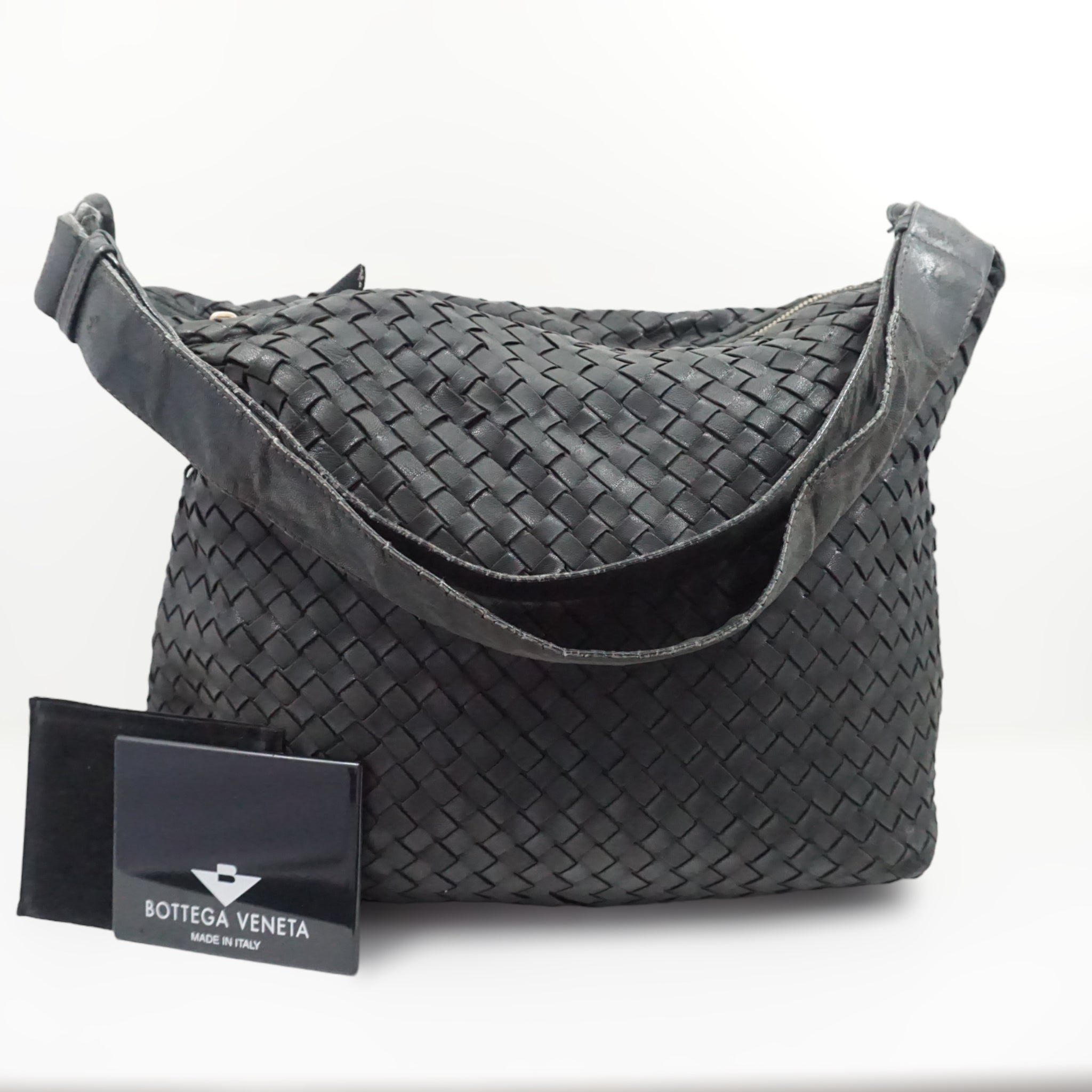Smuk Bottega Veneta Crossbodytaske i sort flettet kalveskind. Skulderemmen kan justeres sĂĄ tasken kan anvendes som alm skuldertaske. Tasken kommer med spejl fra Bottega Venta