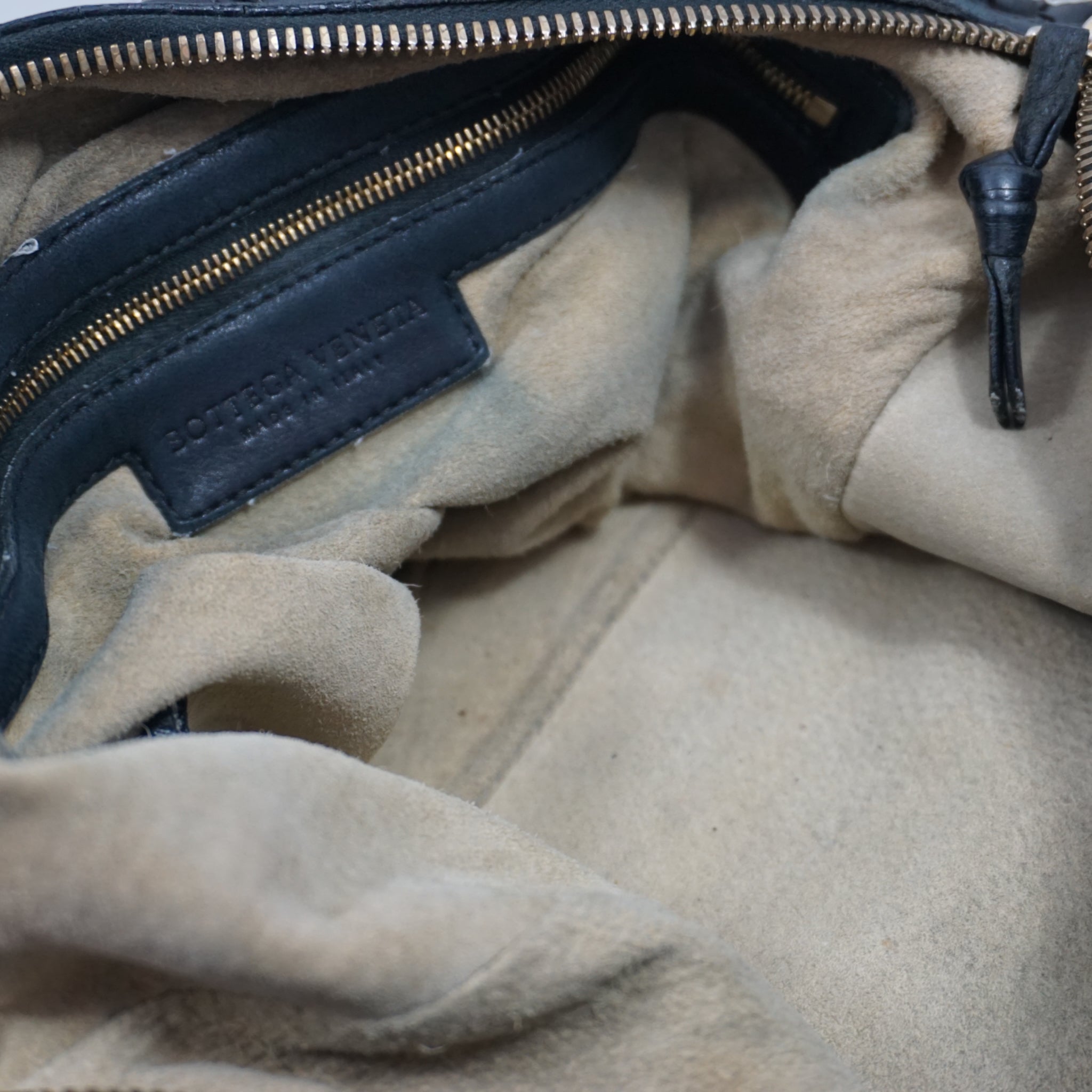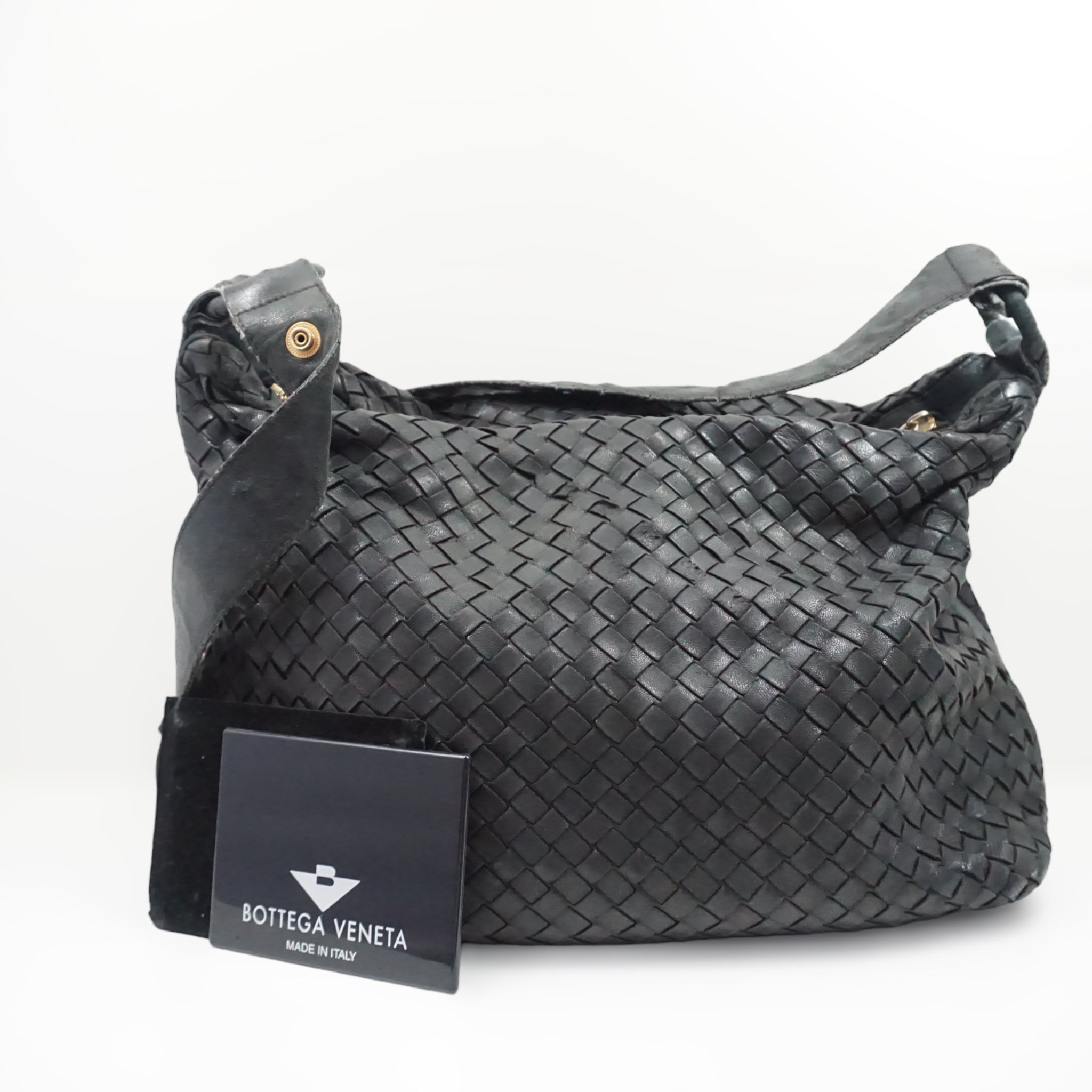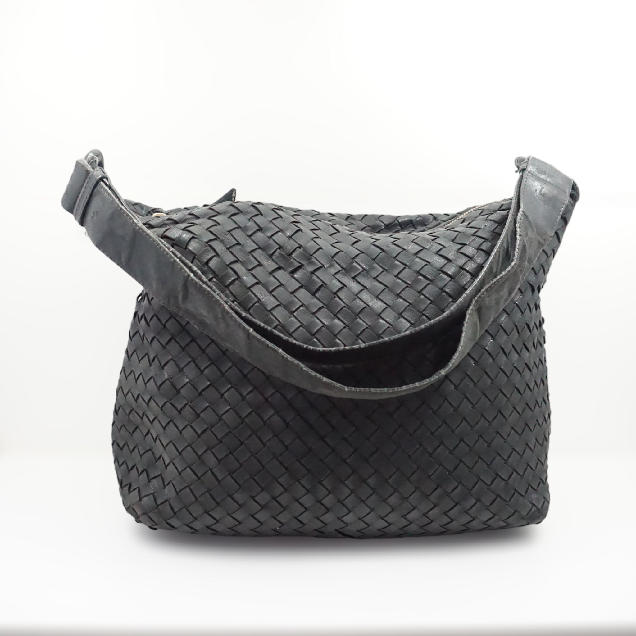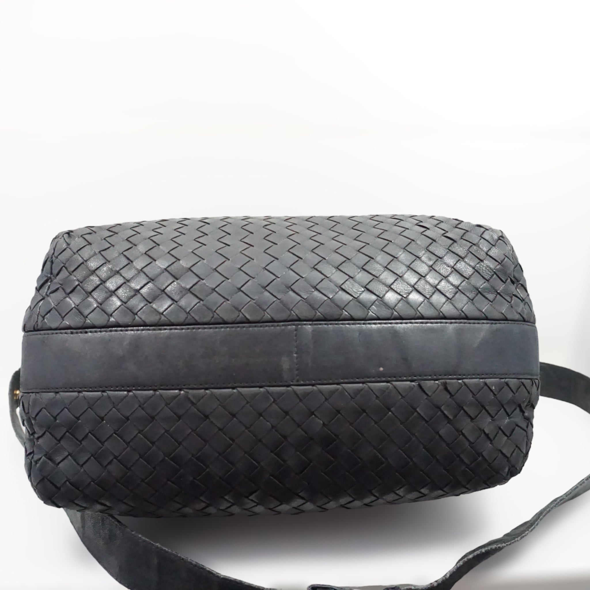 Smuk Bottega Veneta Crossbodytaske i sort flettet kalveskind. Skulderemmen kan justeres sĂĄ tasken kan anvendes som alm skuldertaske. Tasken kommer med spejl fra Bottega Venta