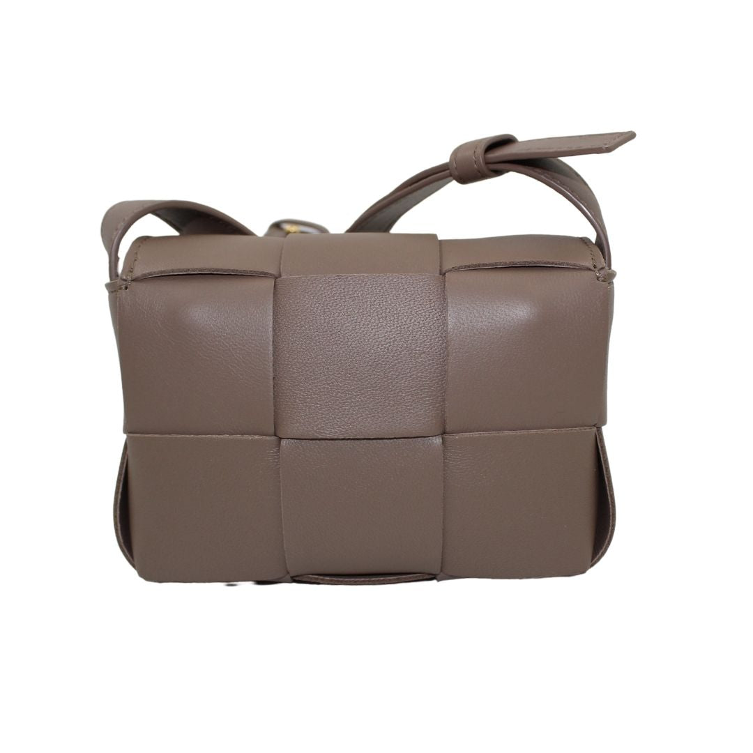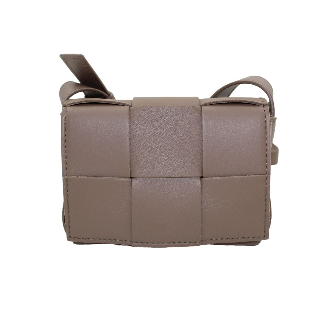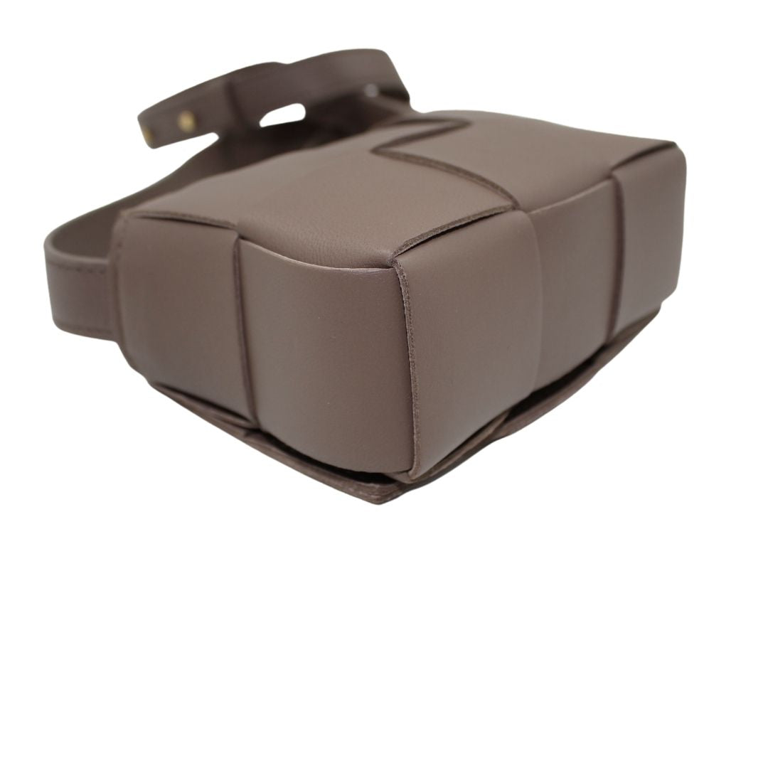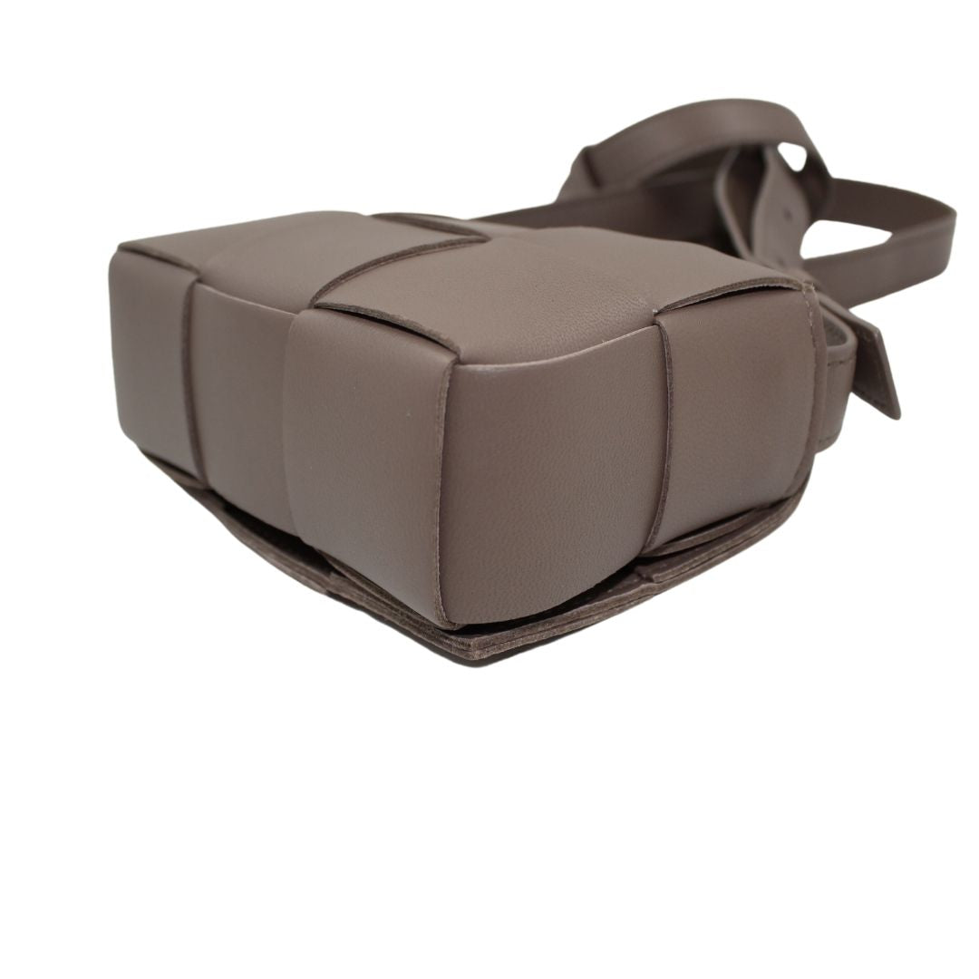 This stylish Candy Cassette Mini Intreccio from Bottega Veneta bag is crafted from taupe leather with an oversized basket weave and luxurious detailing. This leather crossbody is perfect for carrying around town and keeping your belongings safe.