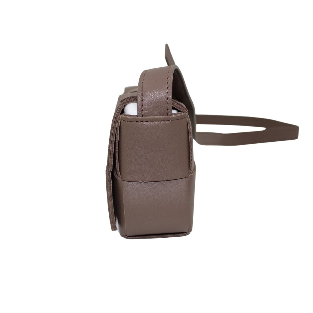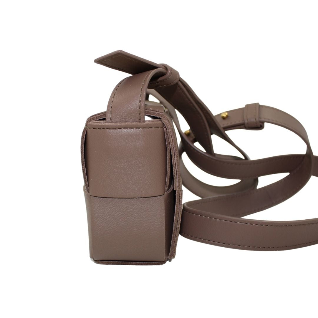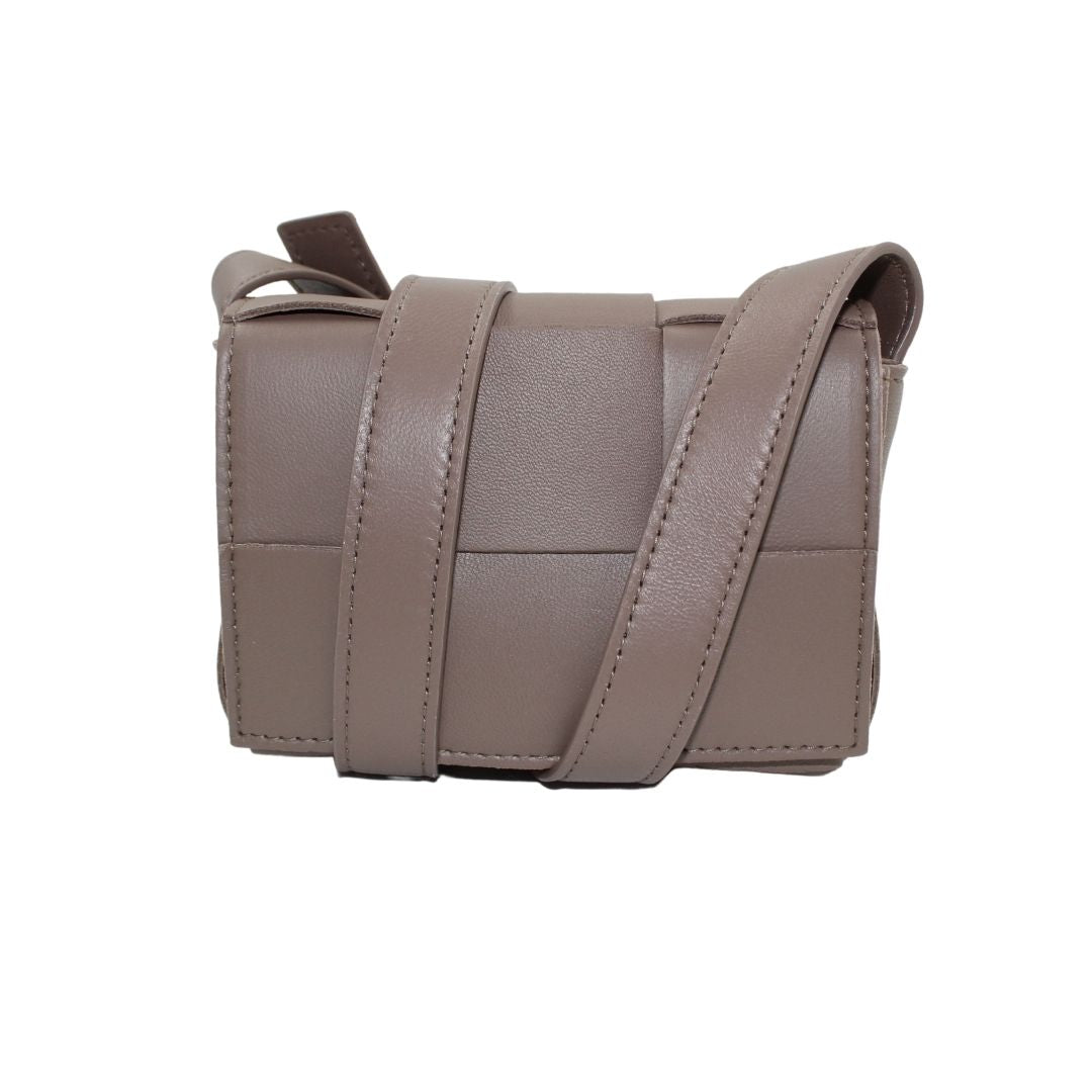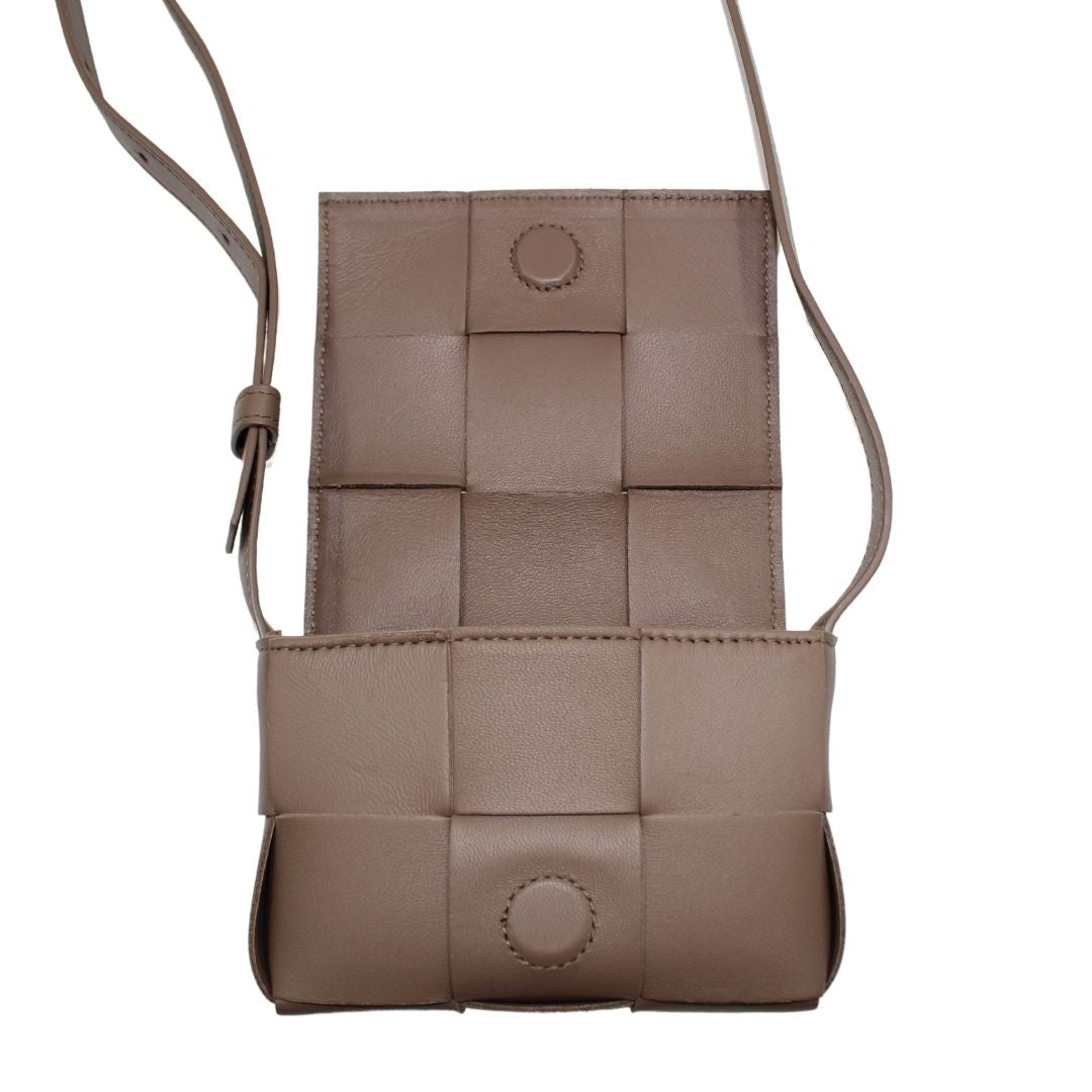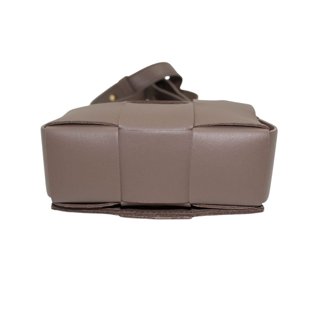 This stylish Candy Cassette Mini Intreccio from Bottega Veneta bag is crafted from taupe leather with an oversized basket weave and luxurious detailing. This leather crossbody is perfect for carrying around town and keeping your belongings safe.