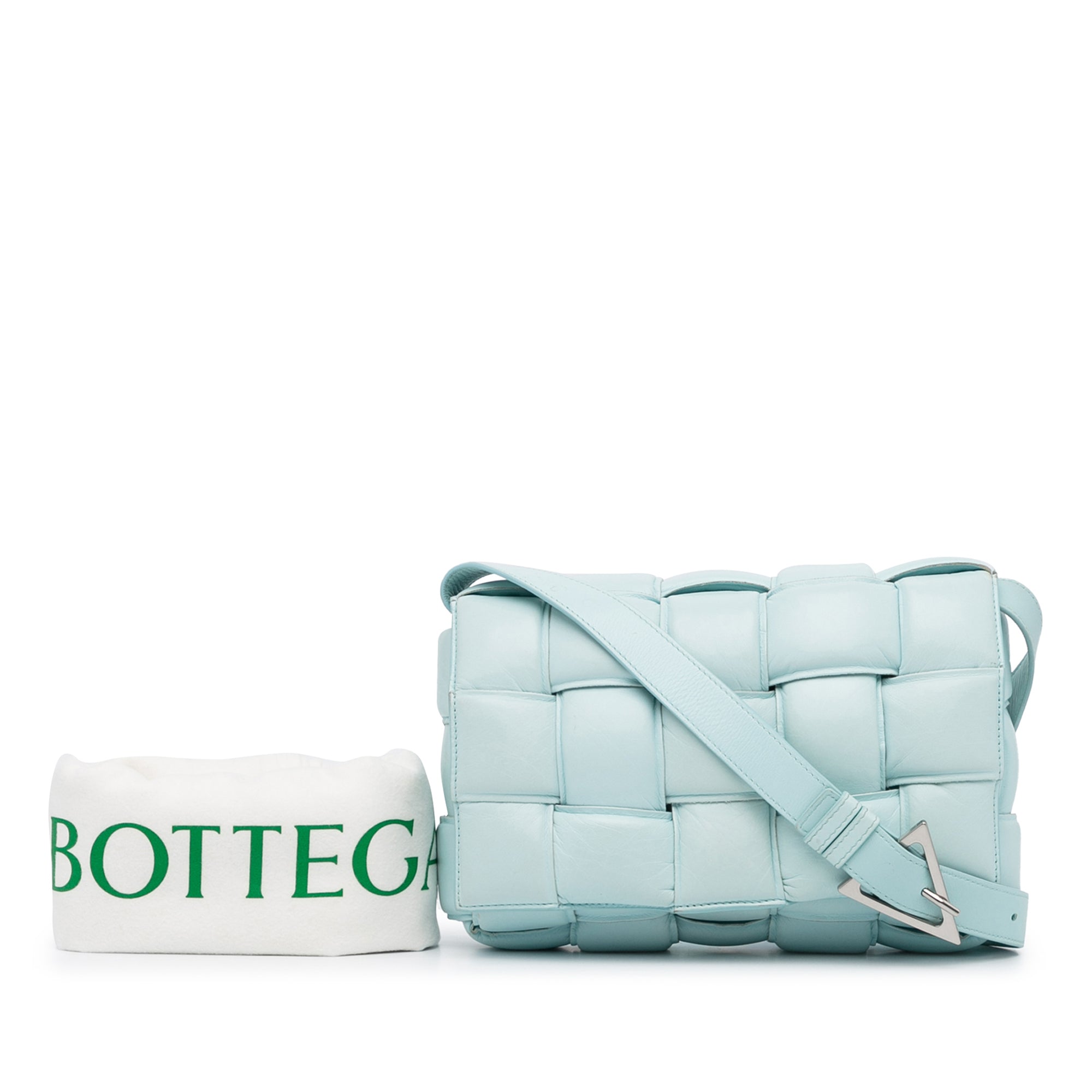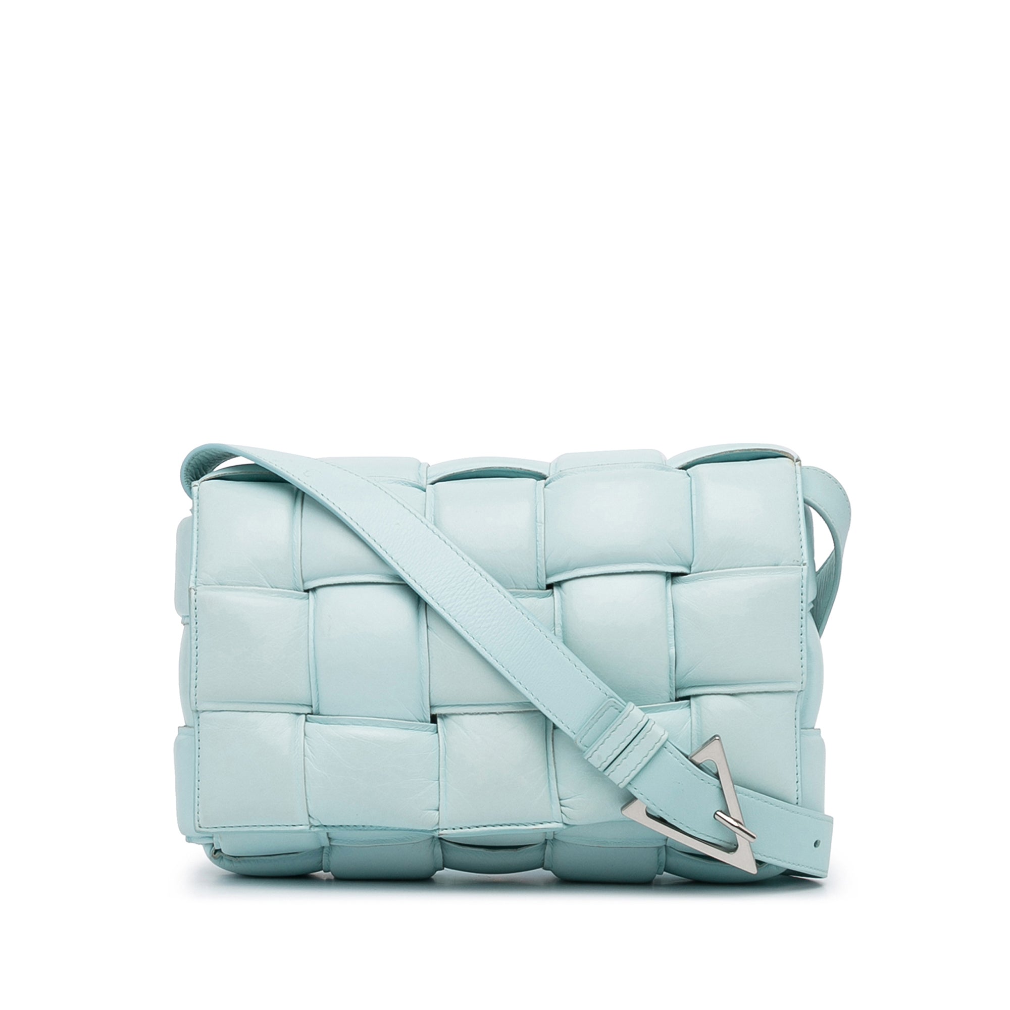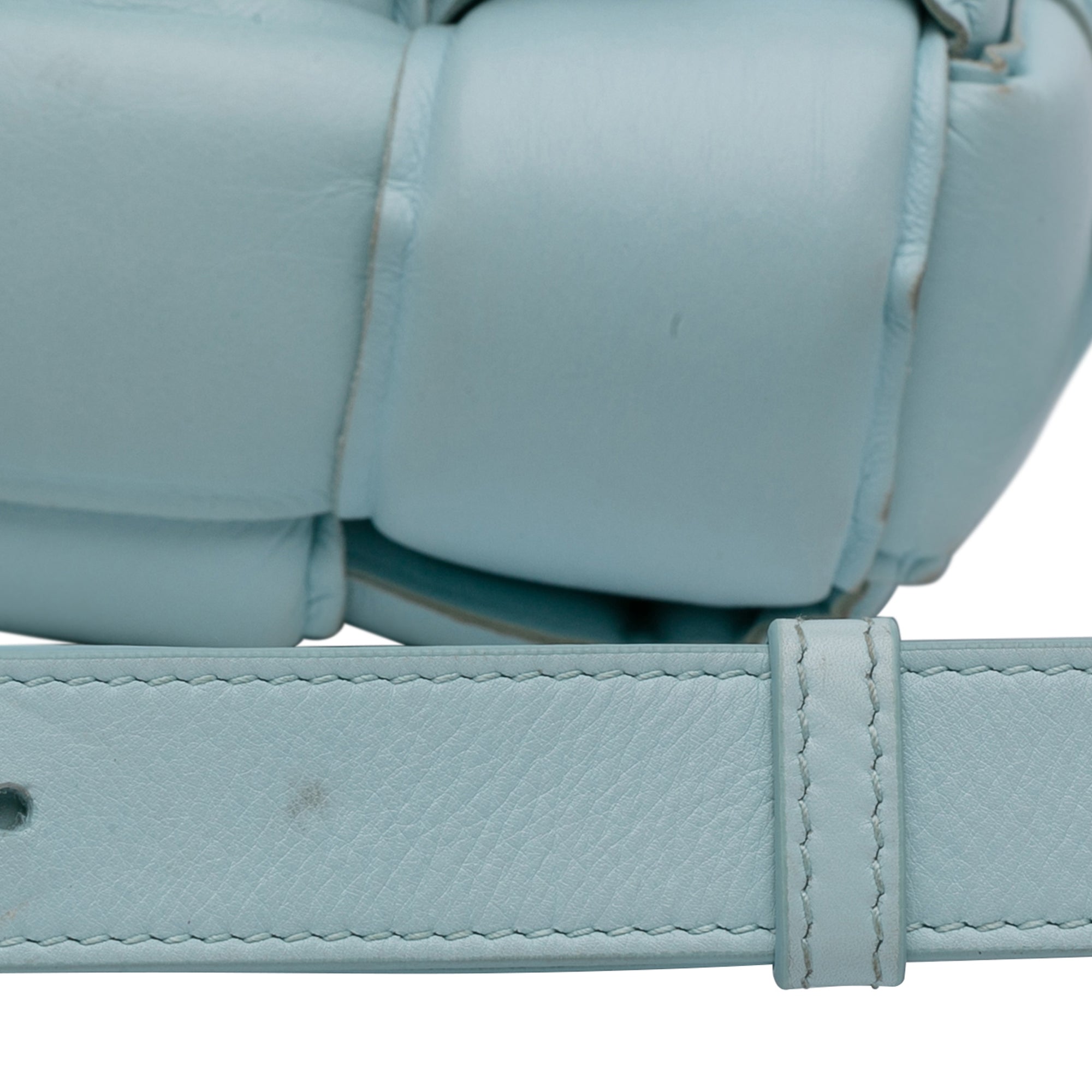 This Bottega Veneta Padded Cassette is crafted from light blue padded and braided leather. The Bag features gold details and a magnetic closure on the front flap. Inside, the Bag a zippered compartment. The Bag is best worn across the body.
