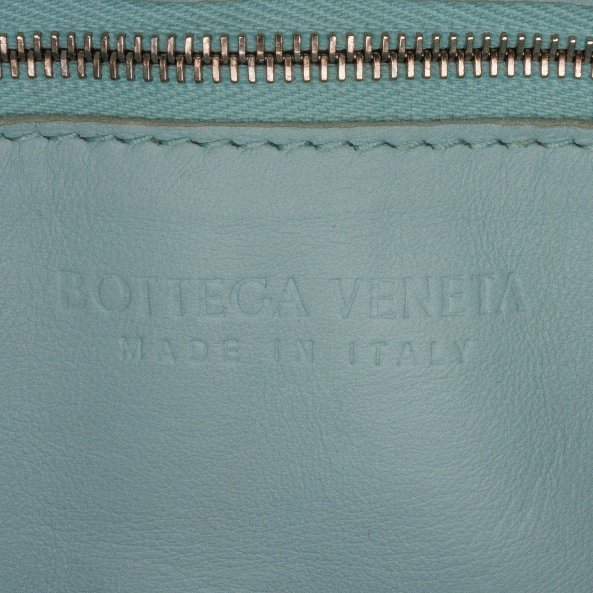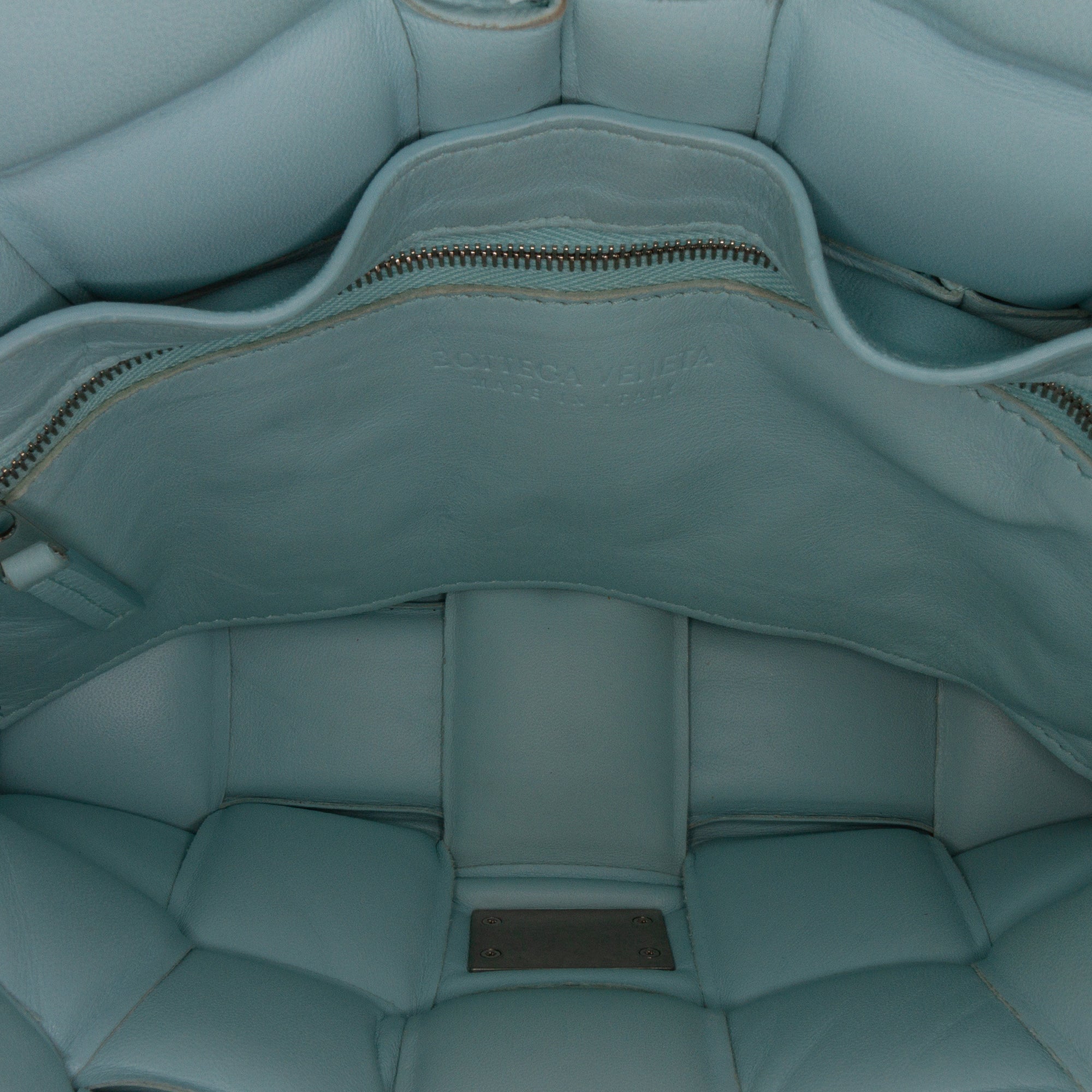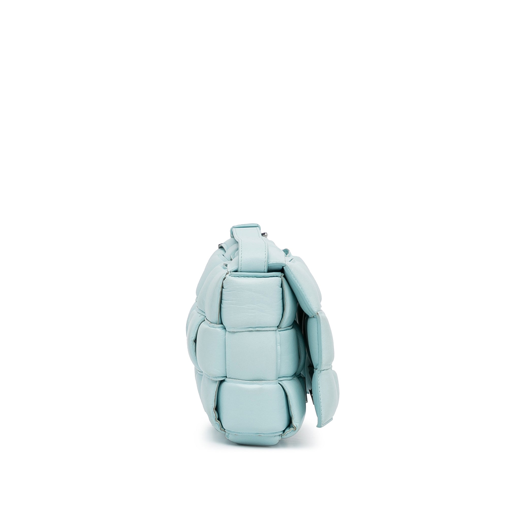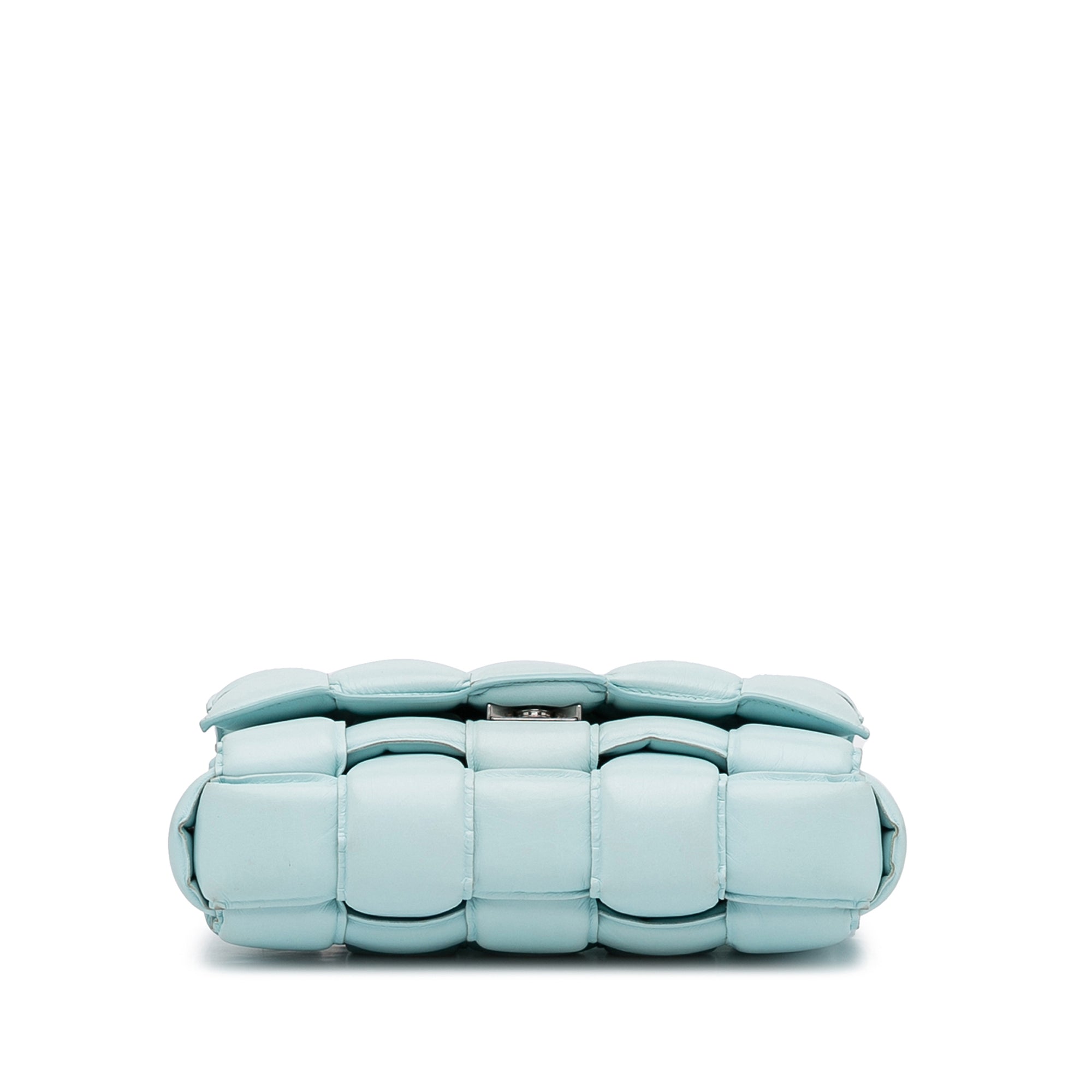 This Bottega Veneta Padded Cassette is crafted from light blue padded and braided leather. The Bag features gold details and a magnetic closure on the front flap. Inside, the Bag a zippered compartment. The Bag is best worn across the body.