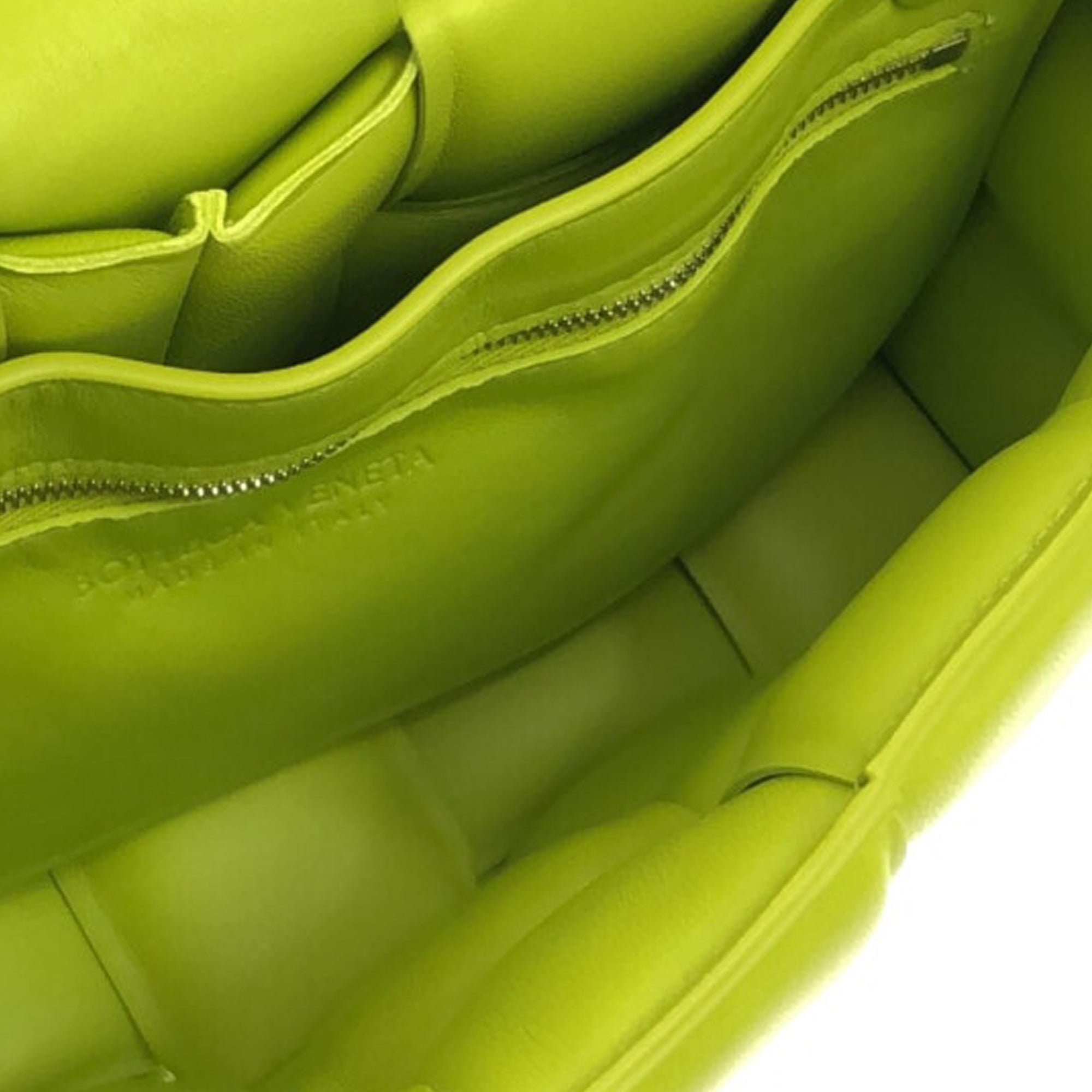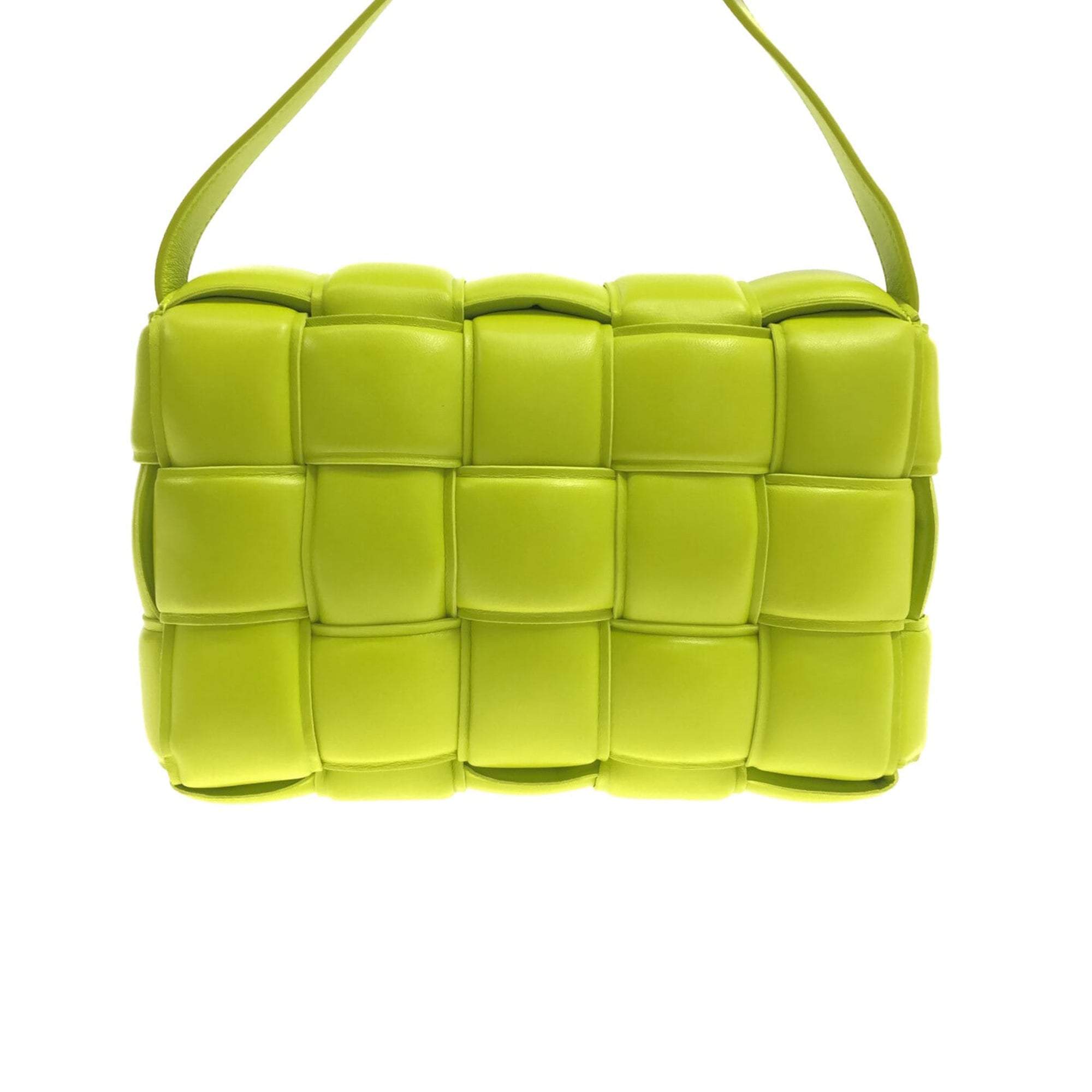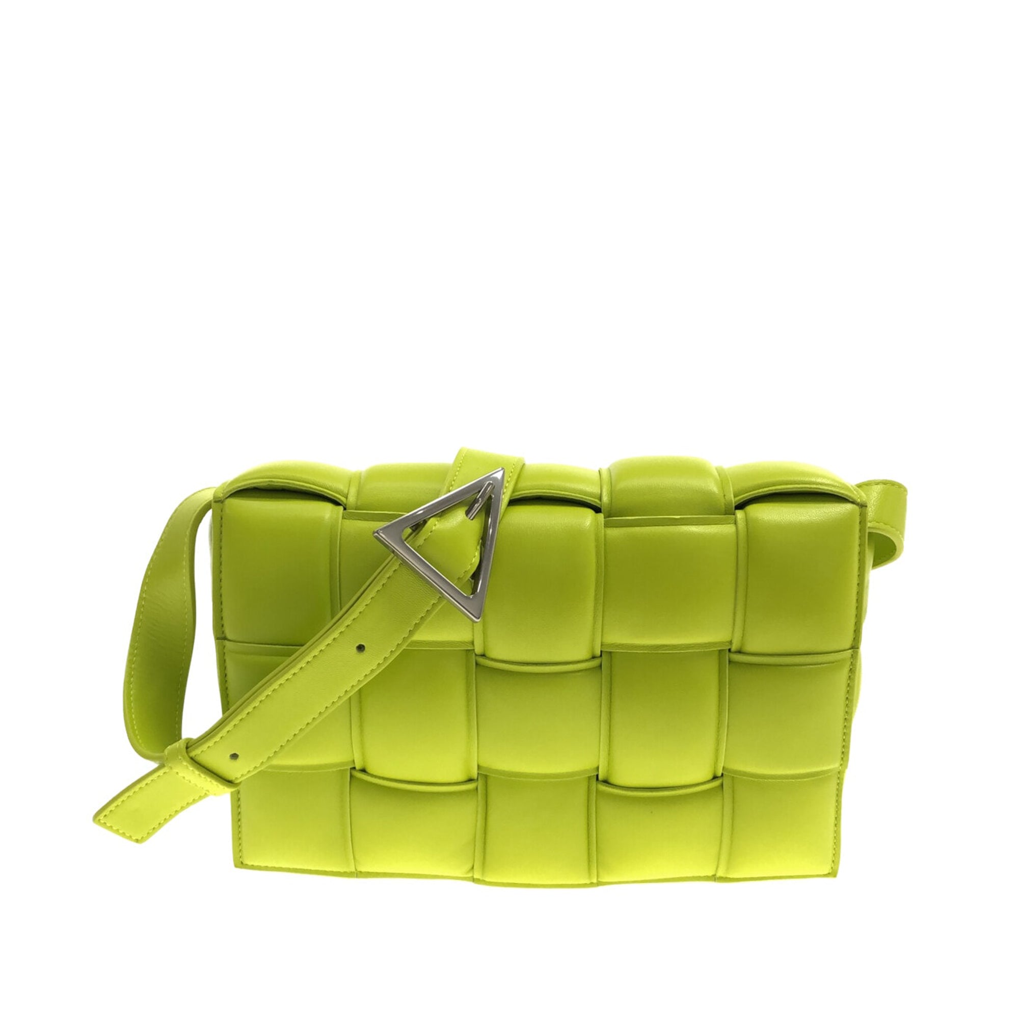 This padded cassette from Bottega Veneta is made of green padded and woven leather. The Bag has a magnetic closure on the front flap. Inside the Bag is a zippered compartment. The Bag is best worn across the body or loosely over the shoulder.