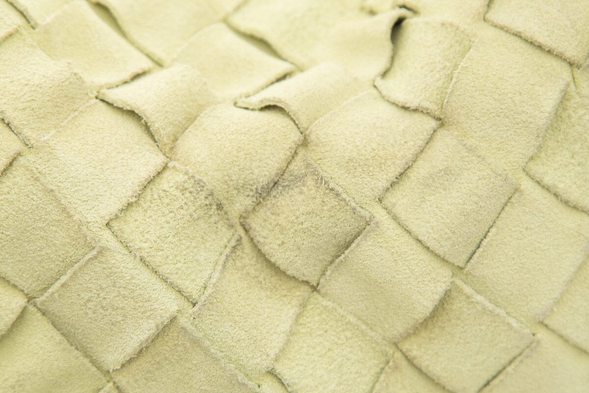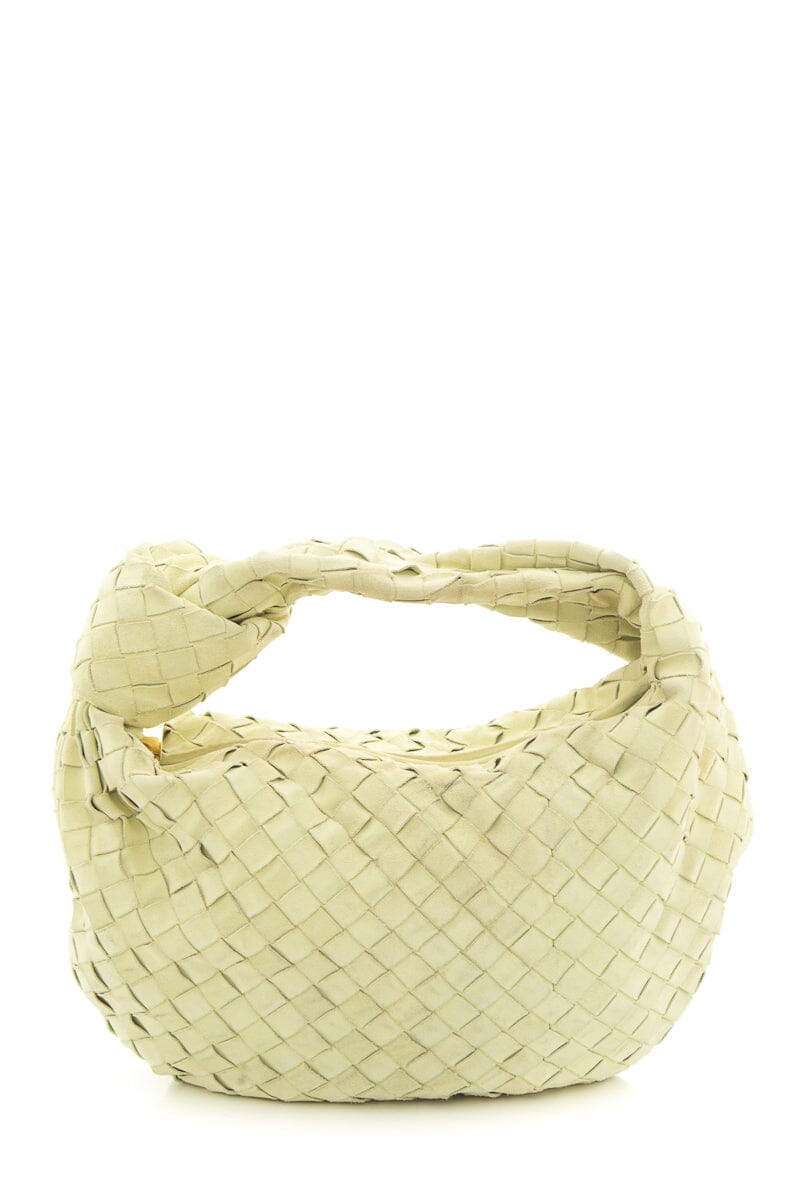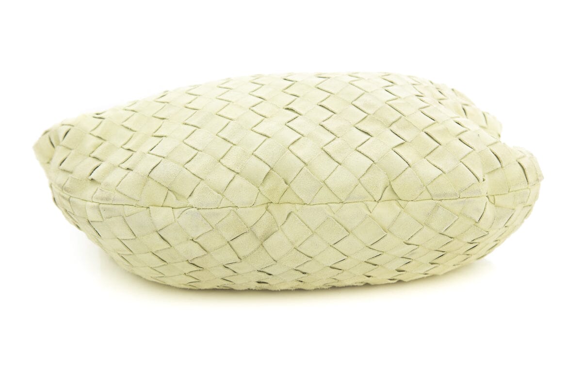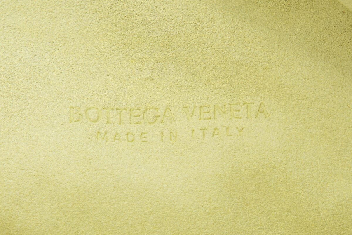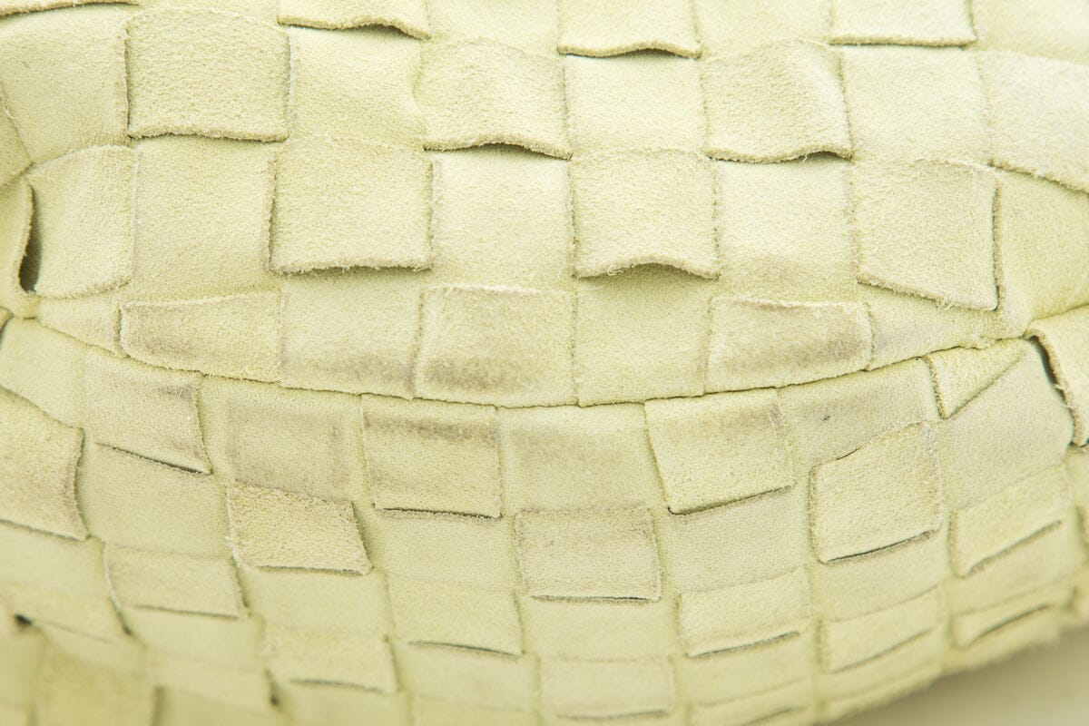 Bottega Veneta Small “Jodie” Yellow Suede Intrecciato Handbag. This item is gently loved; some discoloring on exterior and interior.