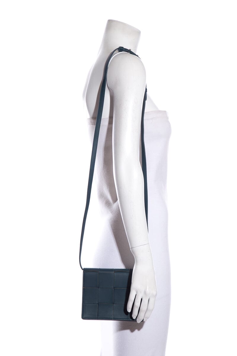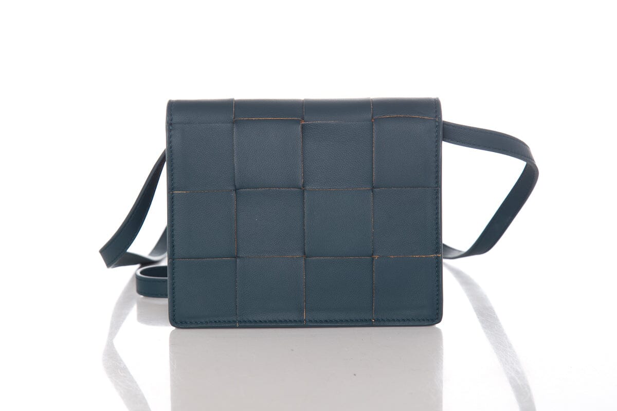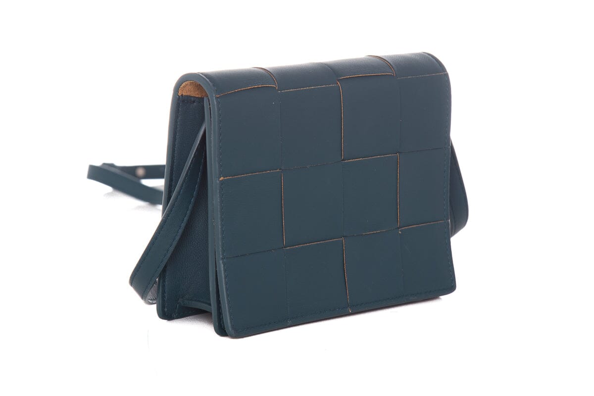 Bottega Veneta Teal Mini Cassette Cross-Body with large woven detail, brushed silver detail and adjustable strap. This item is in excellent condition.