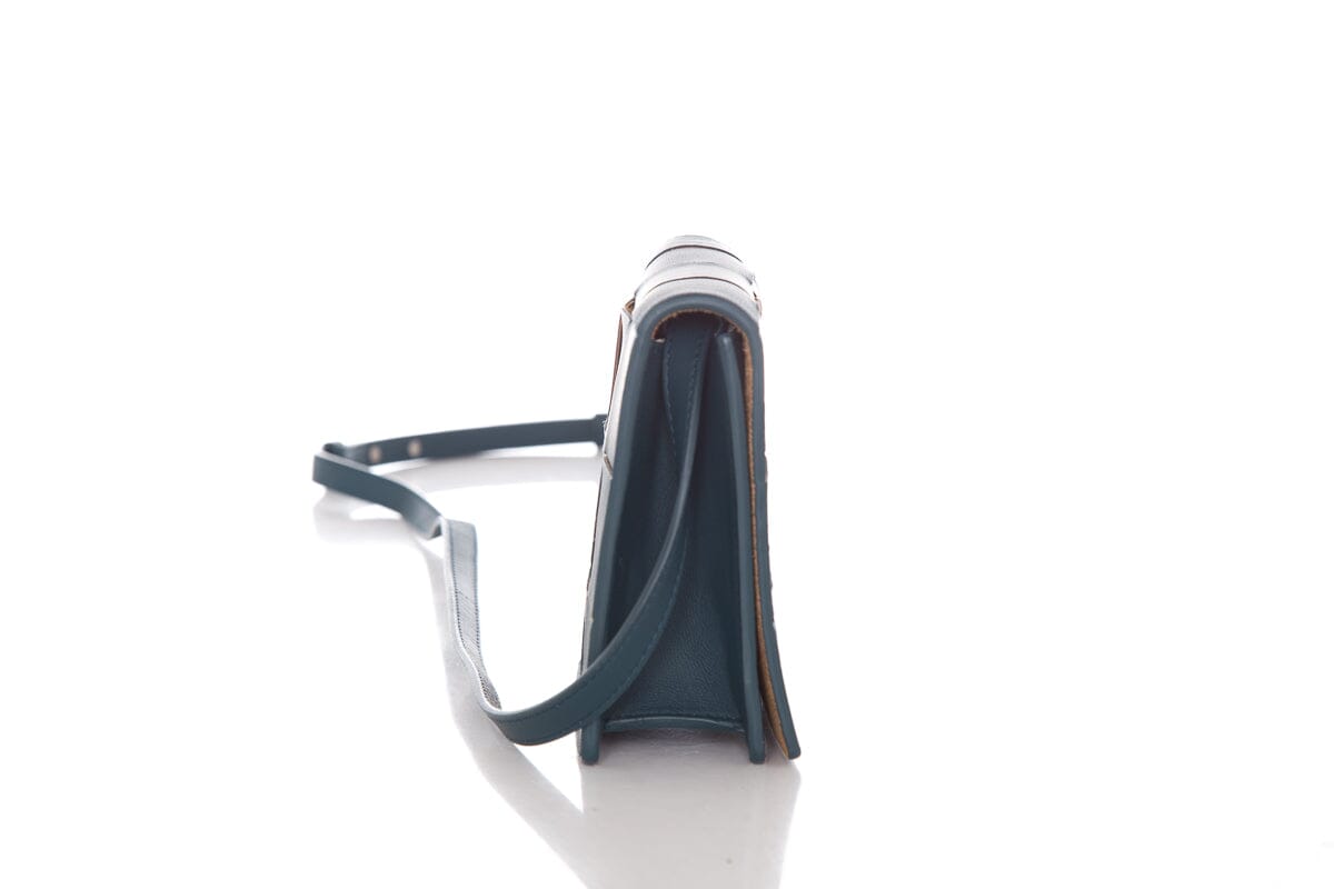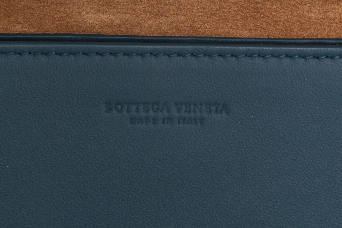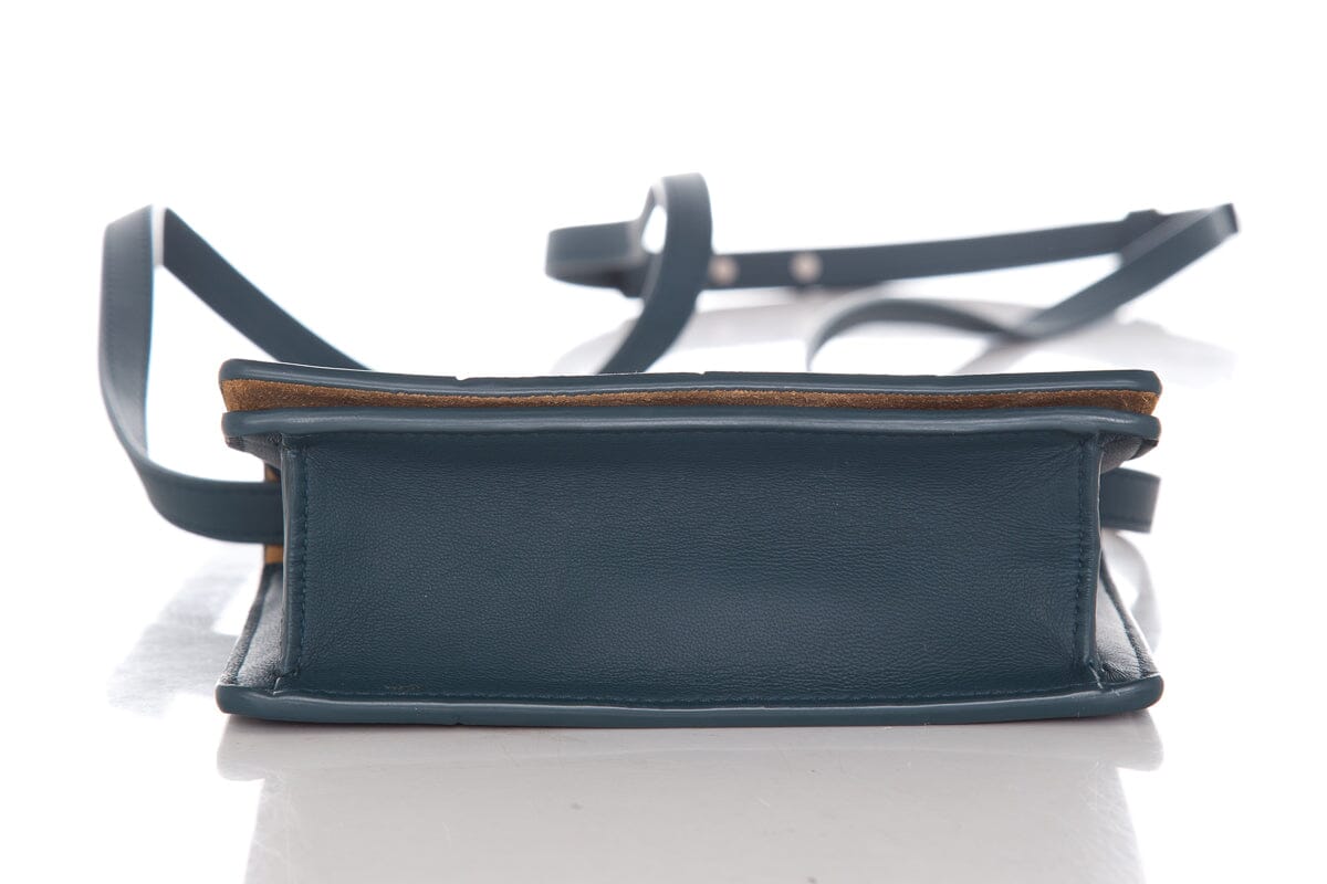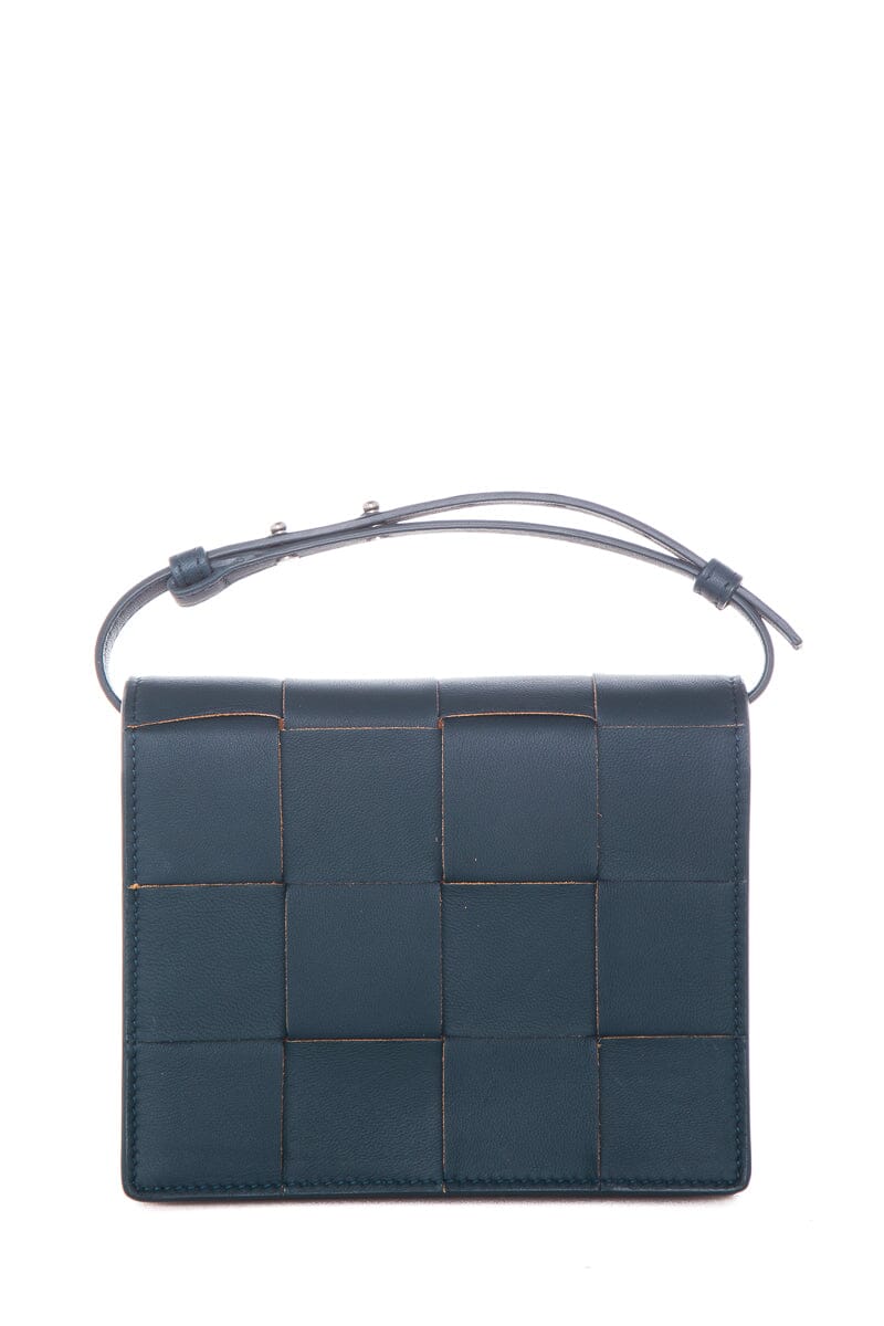 Bottega Veneta Teal Mini Cassette Cross-Body with large woven detail, brushed silver detail and adjustable strap. This item is in excellent condition.