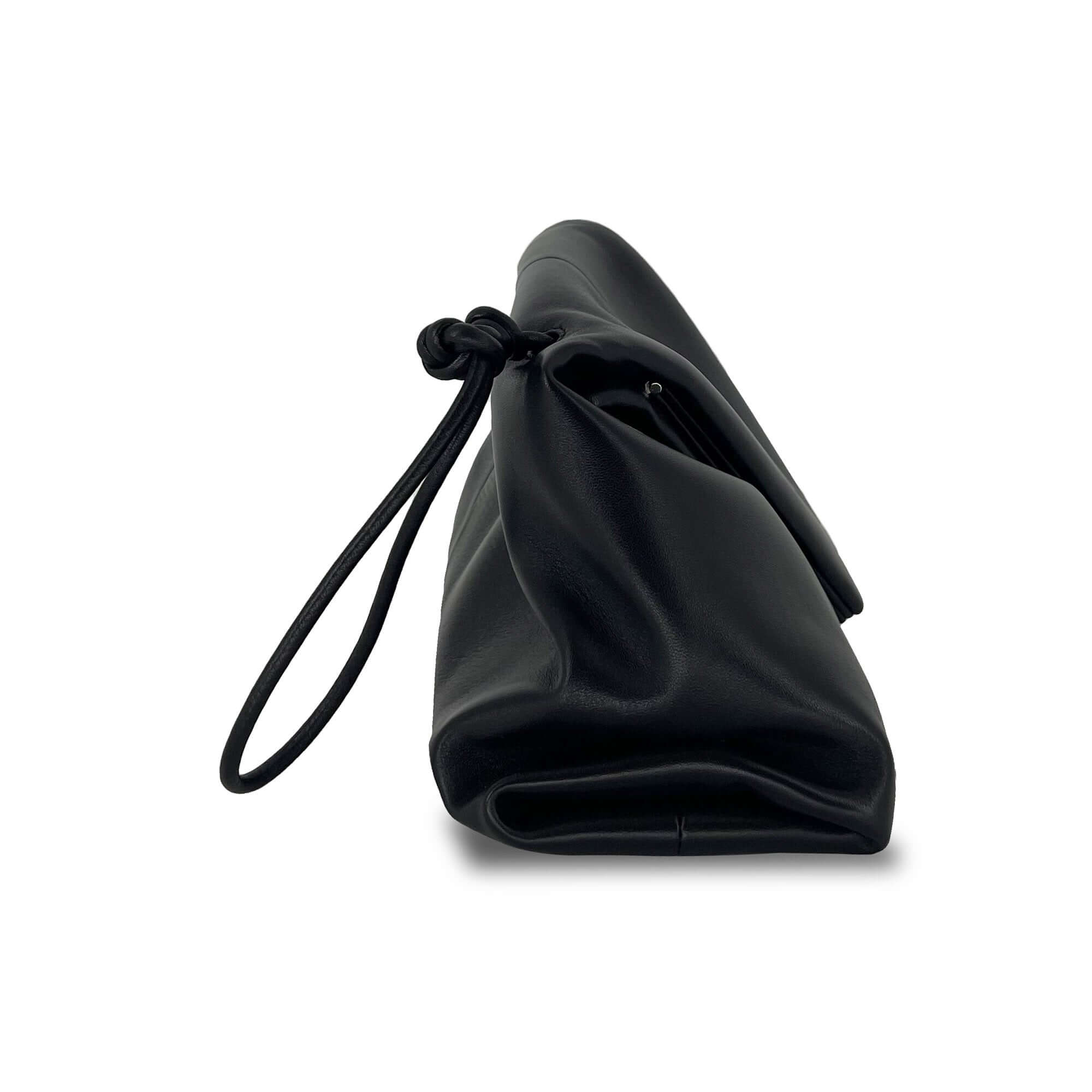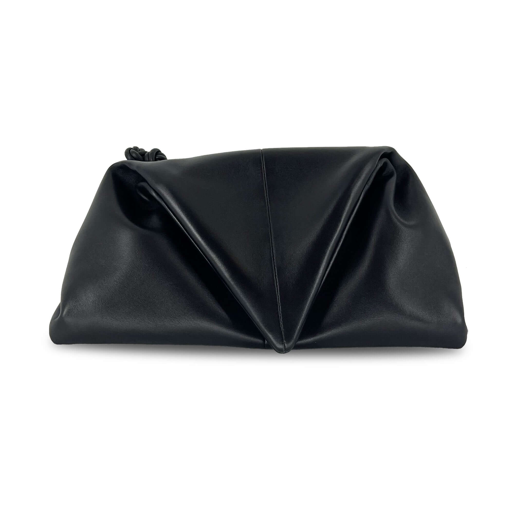 Elegant Bottega Veneta Black Trine clutch bag is made of supple black nappa leather designed in a geometric triangular shape. This clutch bag features the signature V shape hinged opening that folds over with a magnetic closure. Carry this easy to wear clutch day & night styled with an everyday street style look to a night out glam look.