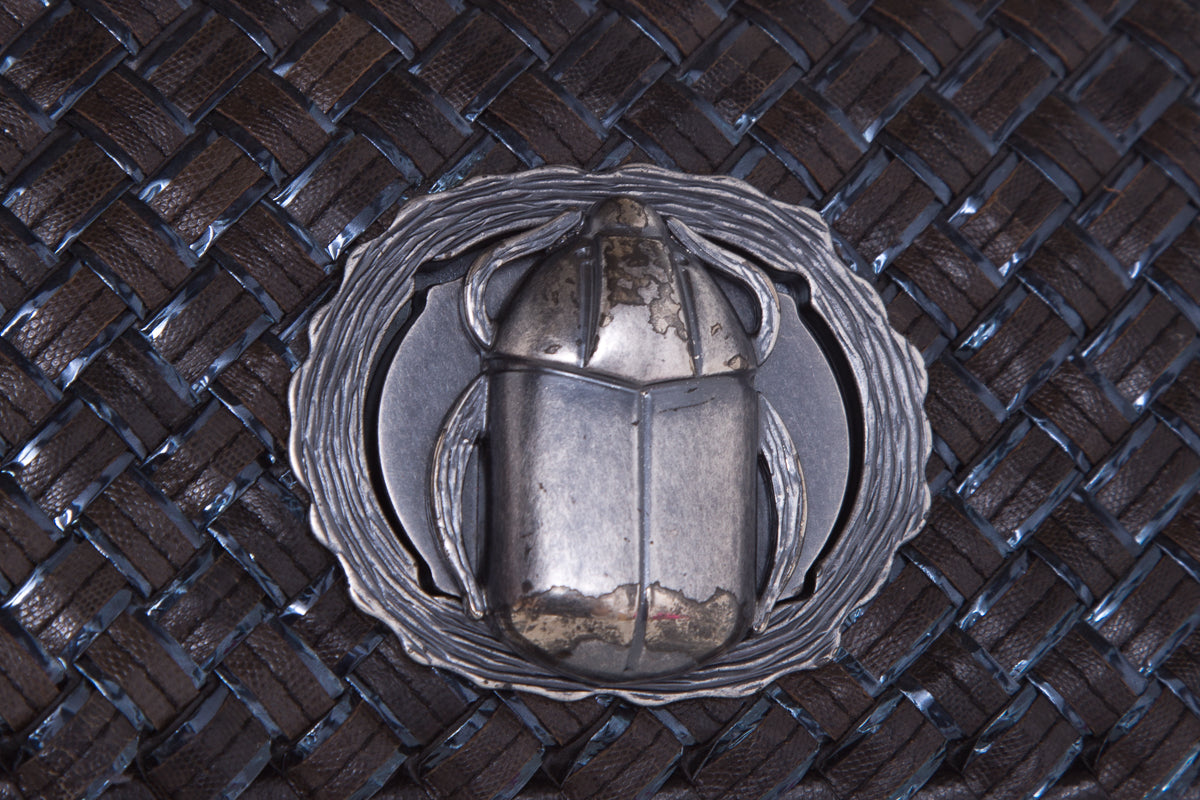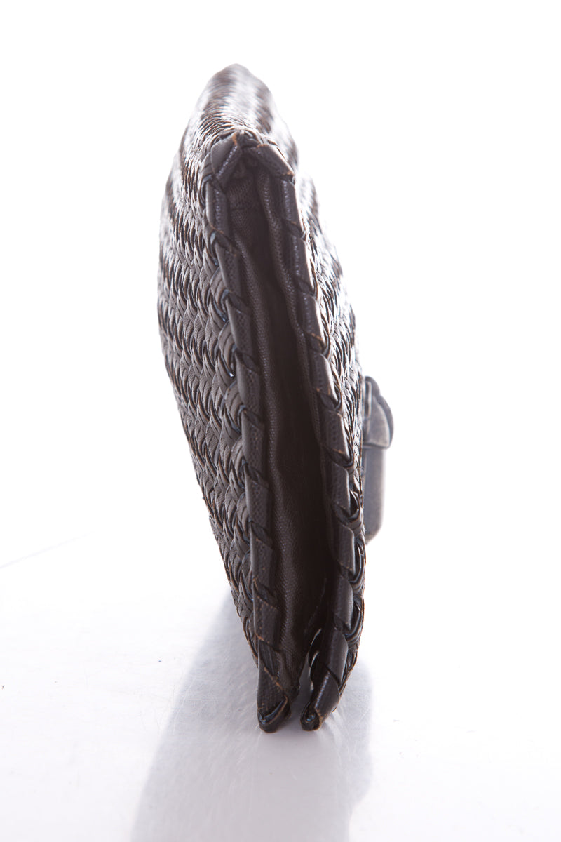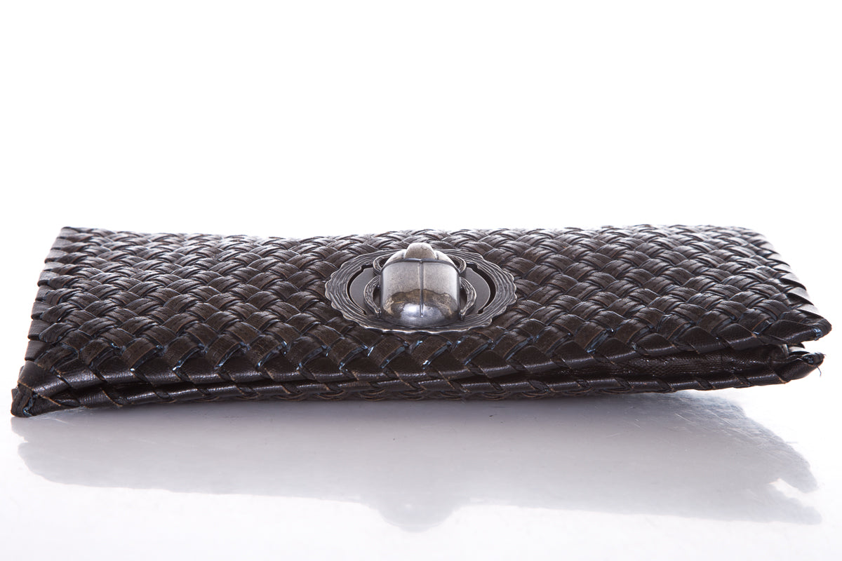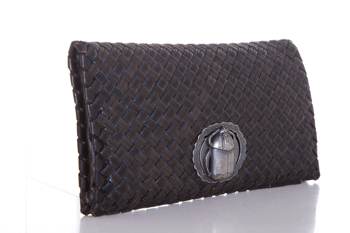 Bottega Veneta Vintage Black Scarab Beatle Intrecciato woven Clutch with turn lock closure. This item is in good condition but has mark to interior, wear to corner edges and hardware on exterior.