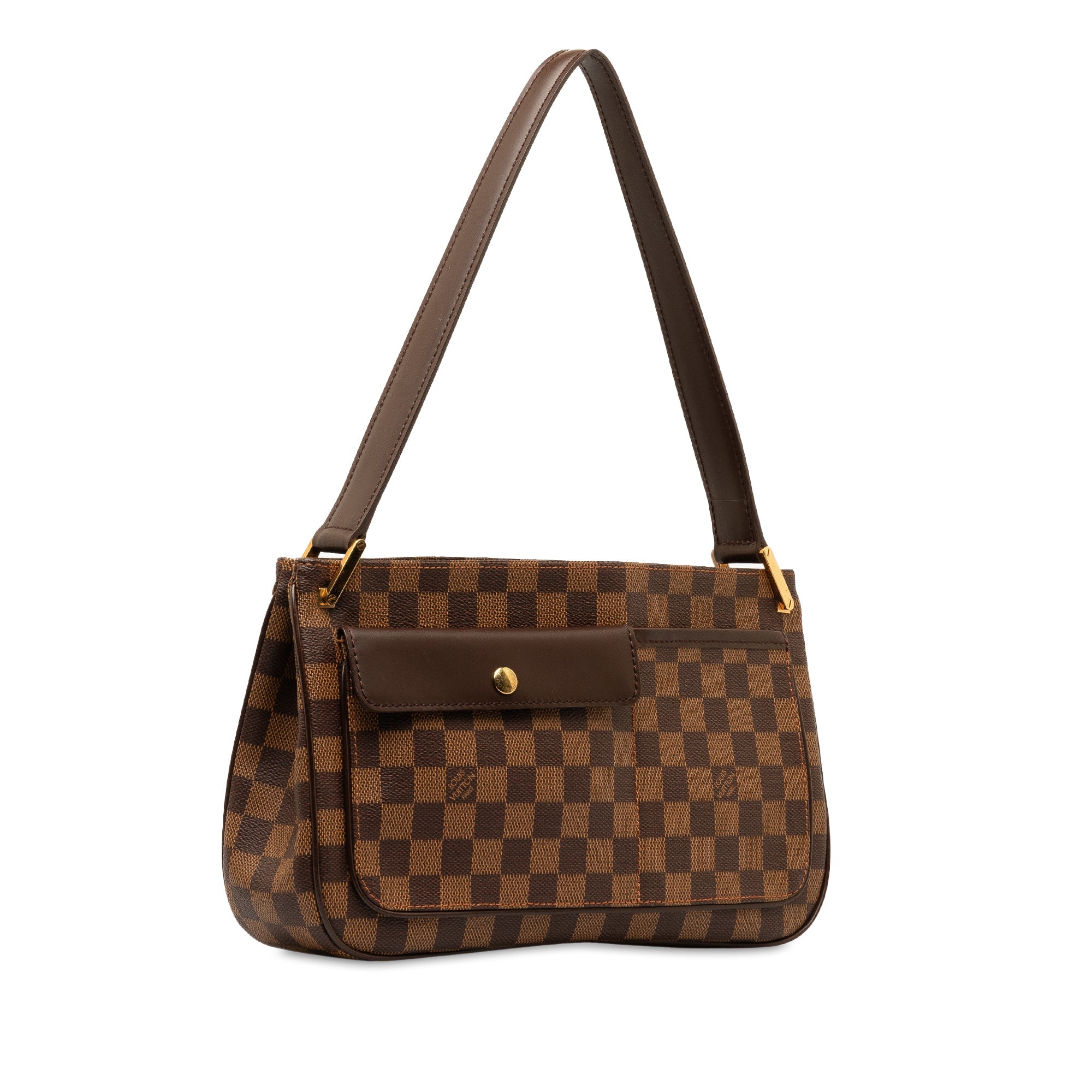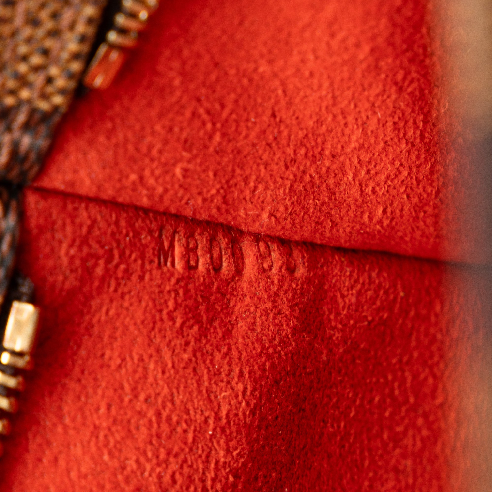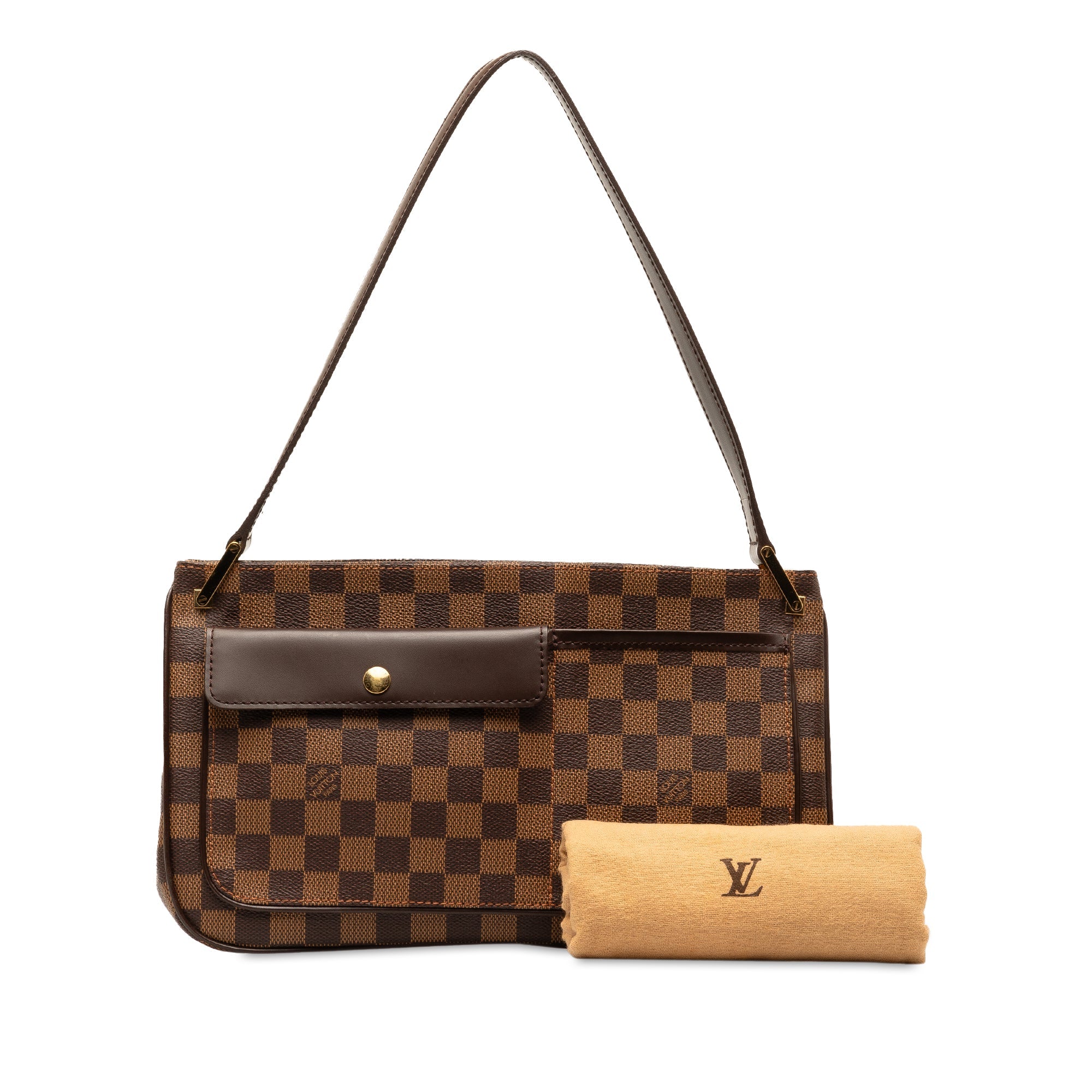 Product Details: Brown LV Damier Ebene Aubagne Shoulder Bag. The Aubagne features a damier ebene canvas body with leather trim, a flat leather strap, a top zip closure, an exterior flap and slip pockets, and slip compartments. 7.1″ L x 12.2″ W x 3.1″ D. Serial number MB0093.